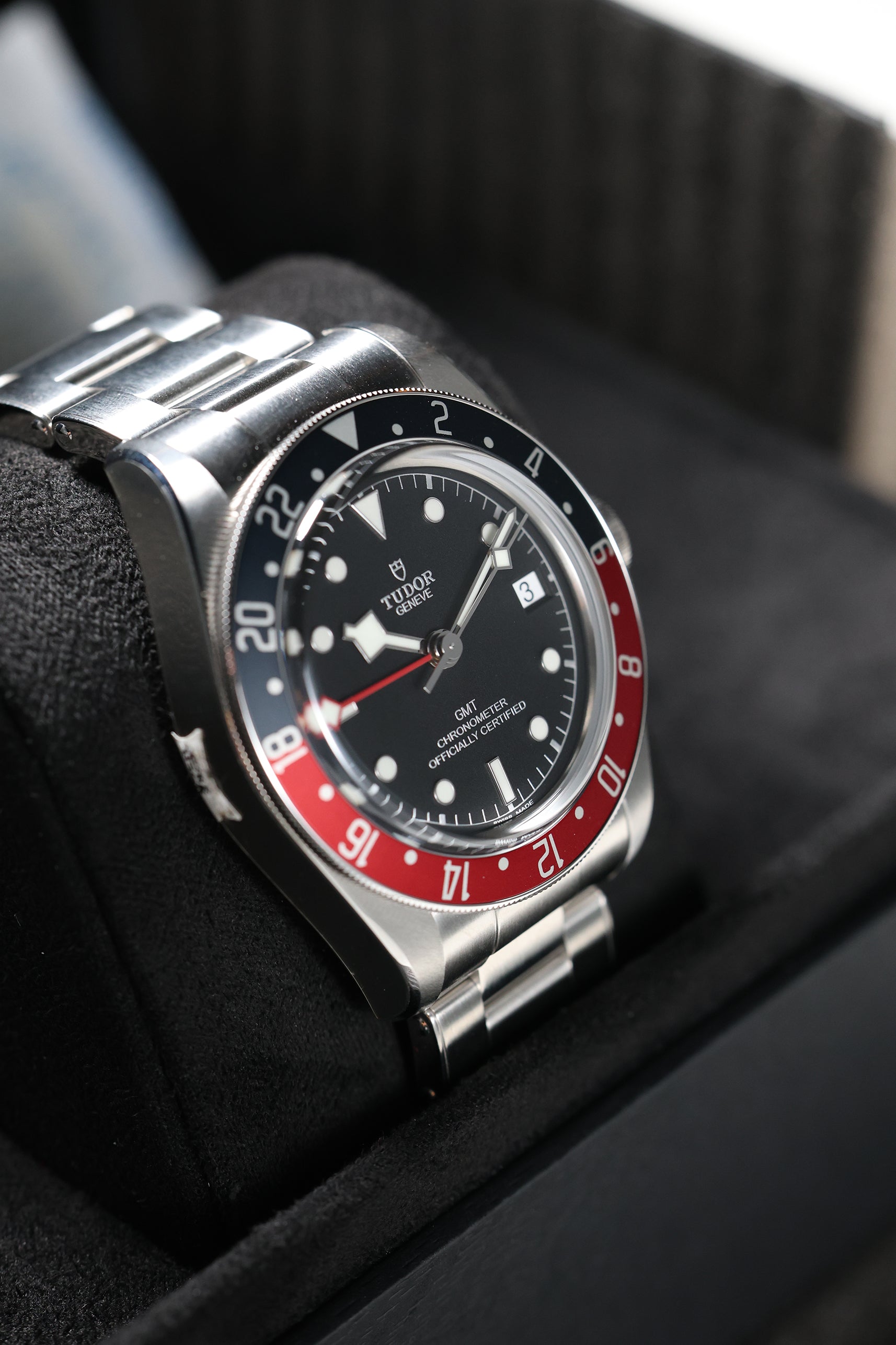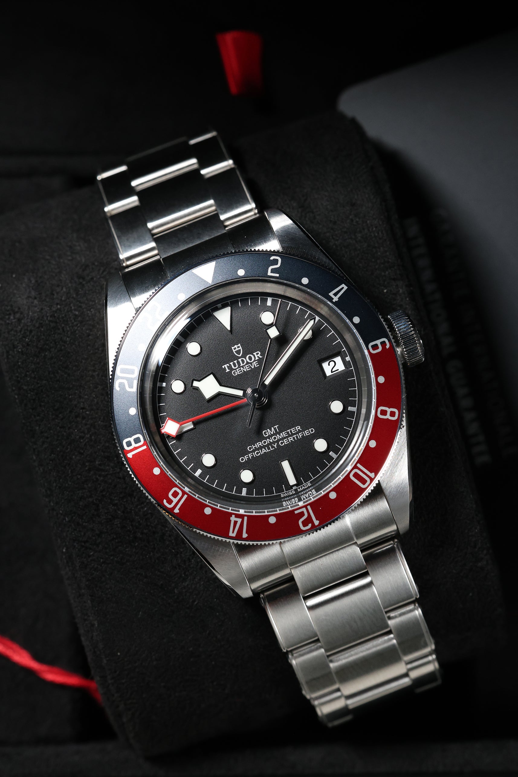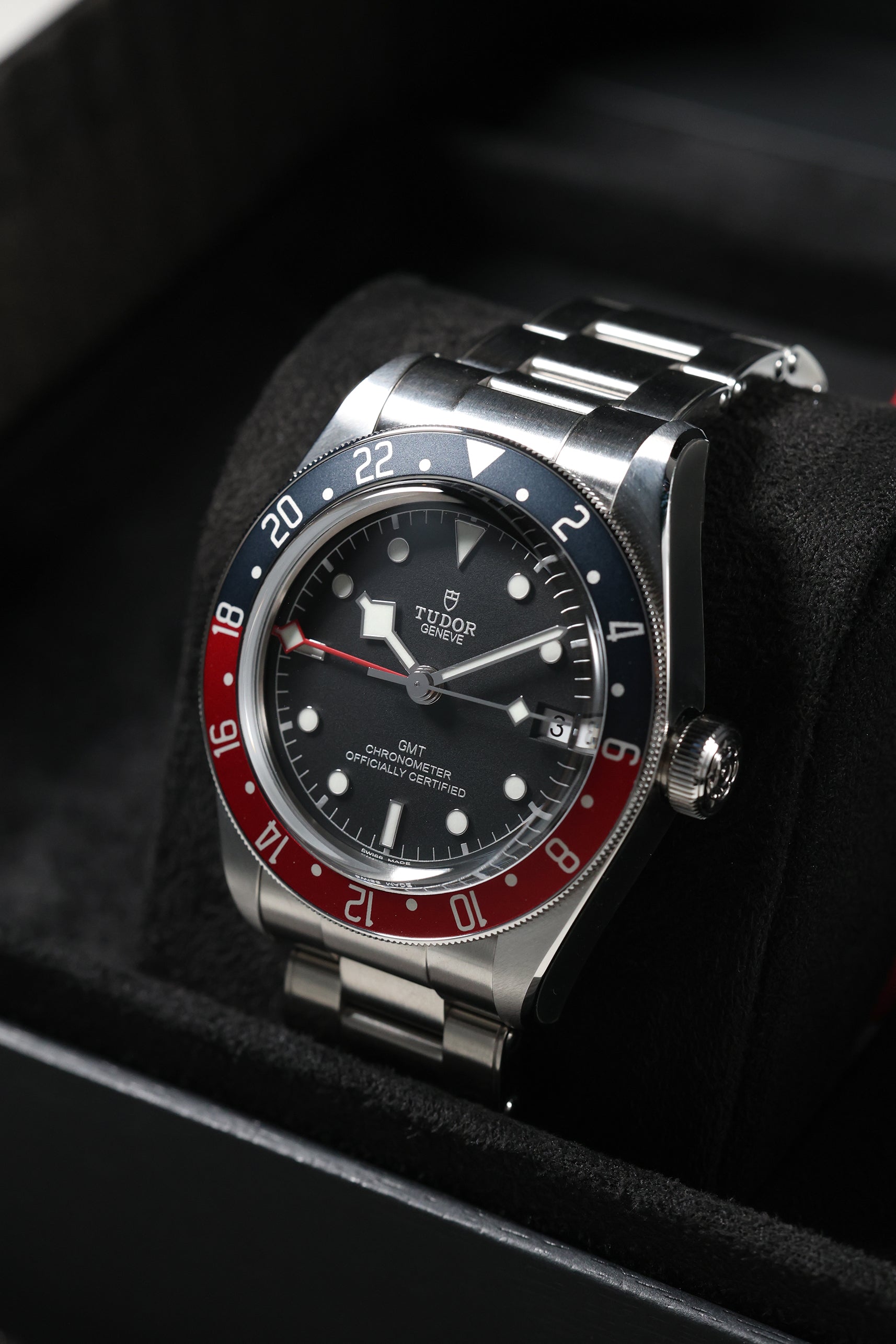 The matte black dial is a study in understated elegance, featuring Tudor’s signature snowflake hands and bold hour markers filled with luminous material for exceptional legibility in low-light conditions. The red and blue bezel insert not only adds a vibrant pop of color but also enhances the watch’s practicality, making it easy to distinguish between day and night hours. The red GMT hand, with its sharp arrow tip, stands out against the dial, ensuring clear readability of the second time zone. Every detail is designed with purpose, staying true to Tudor’s commitment to both style and functionality.
