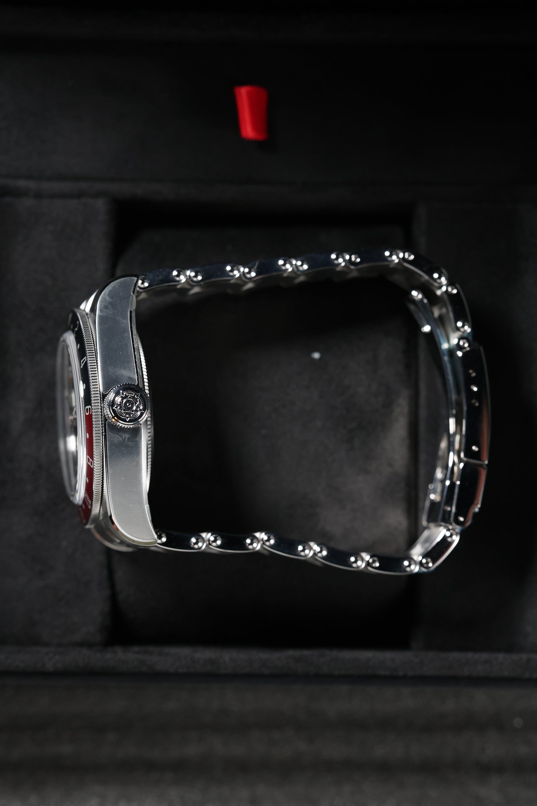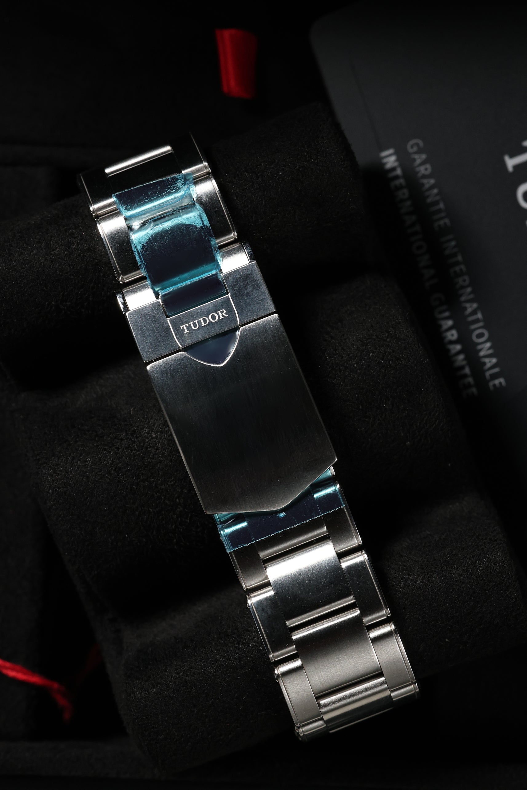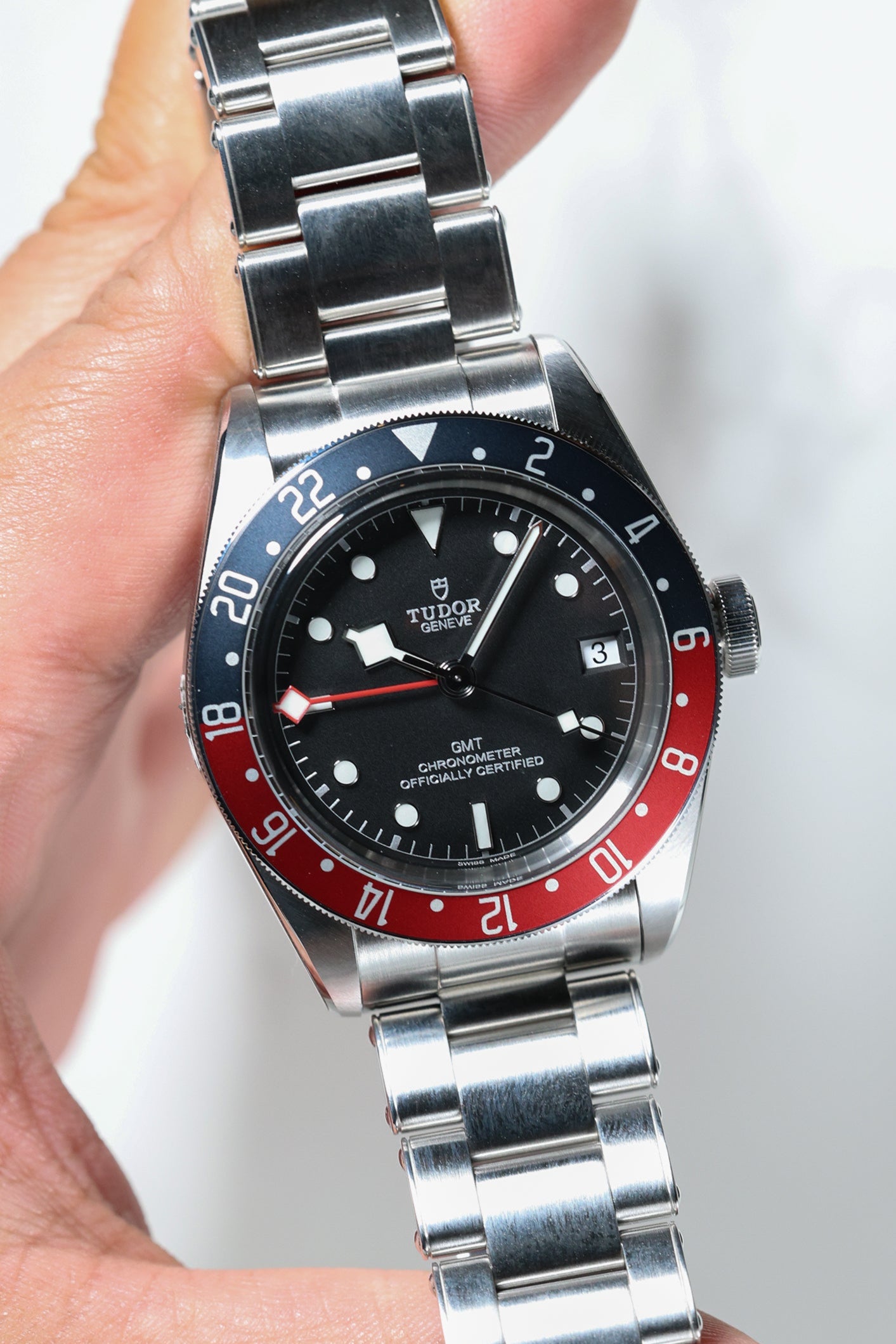 The matte black dial is a study in understated elegance, featuring Tudor’s signature snowflake hands and bold hour markers filled with luminous material for exceptional legibility in low-light conditions. The red and blue bezel insert not only adds a vibrant pop of color but also enhances the watch’s practicality, making it easy to distinguish between day and night hours. The red GMT hand, with its sharp arrow tip, stands out against the dial, ensuring clear readability of the second time zone. Every detail is designed with purpose, staying true to Tudor’s commitment to both style and functionality.