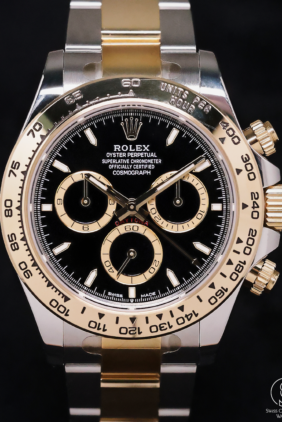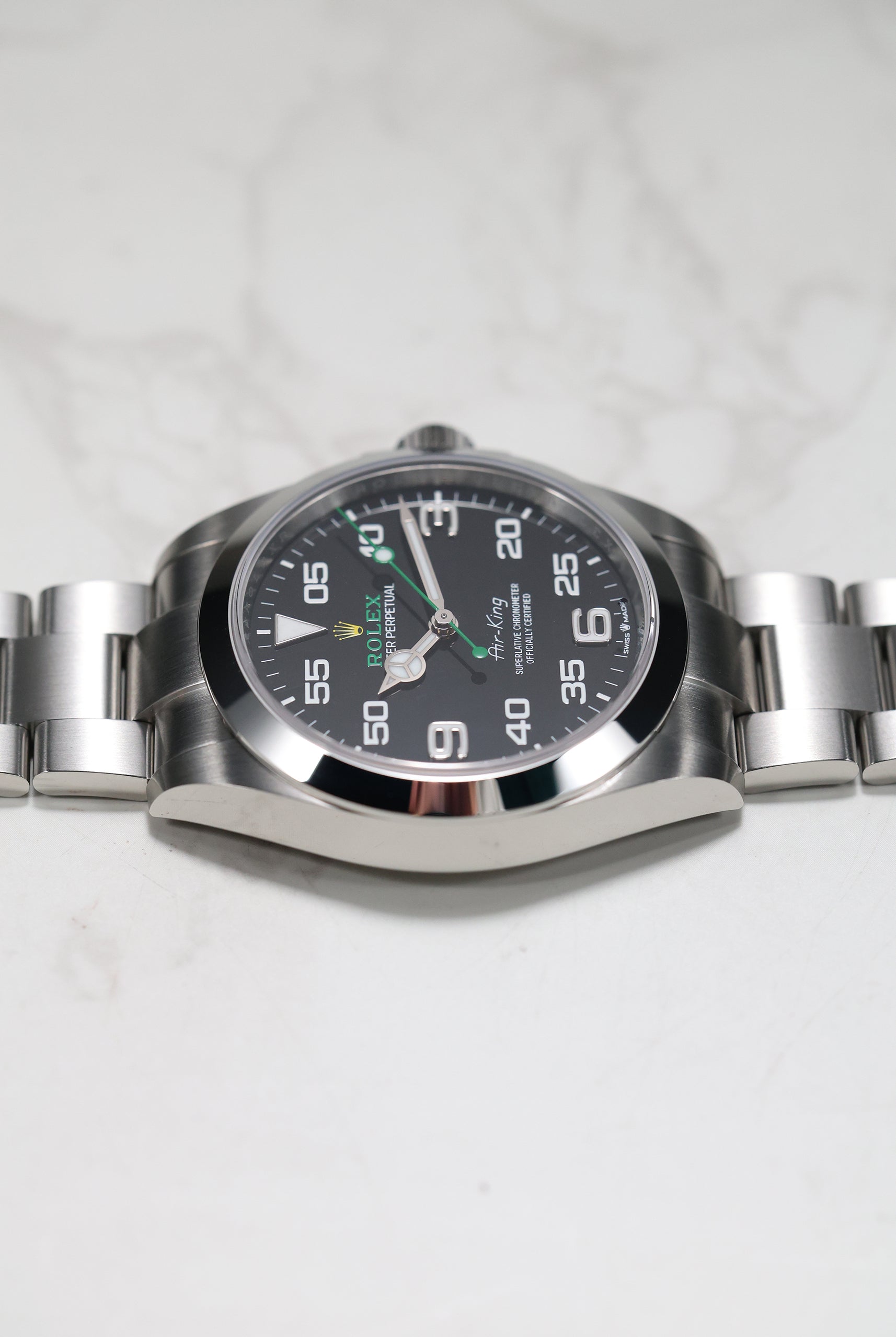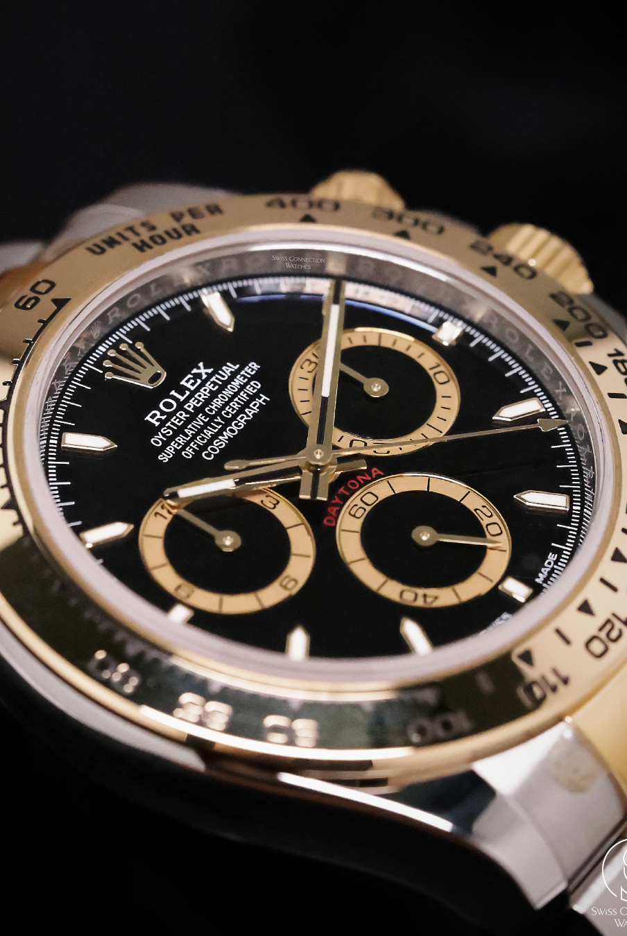 The Rolex utilizes a high-tech, scratch-resistant Cerachrom ceramic bezel insert. It delivers a sharp, glossy, and luxurious feel—a modern material for a modern icon. The 40mm case size and highly polished finish reinforce its status as a luxury symbol.