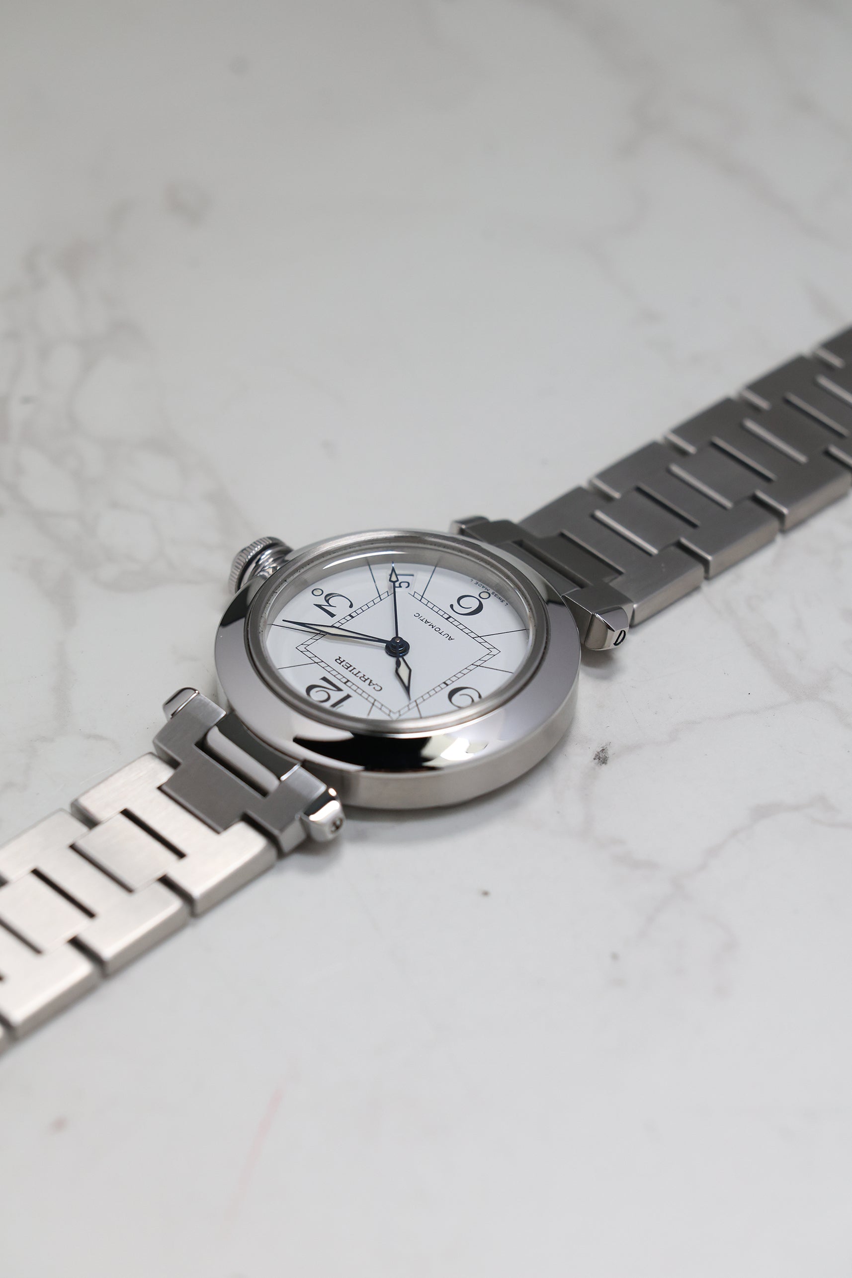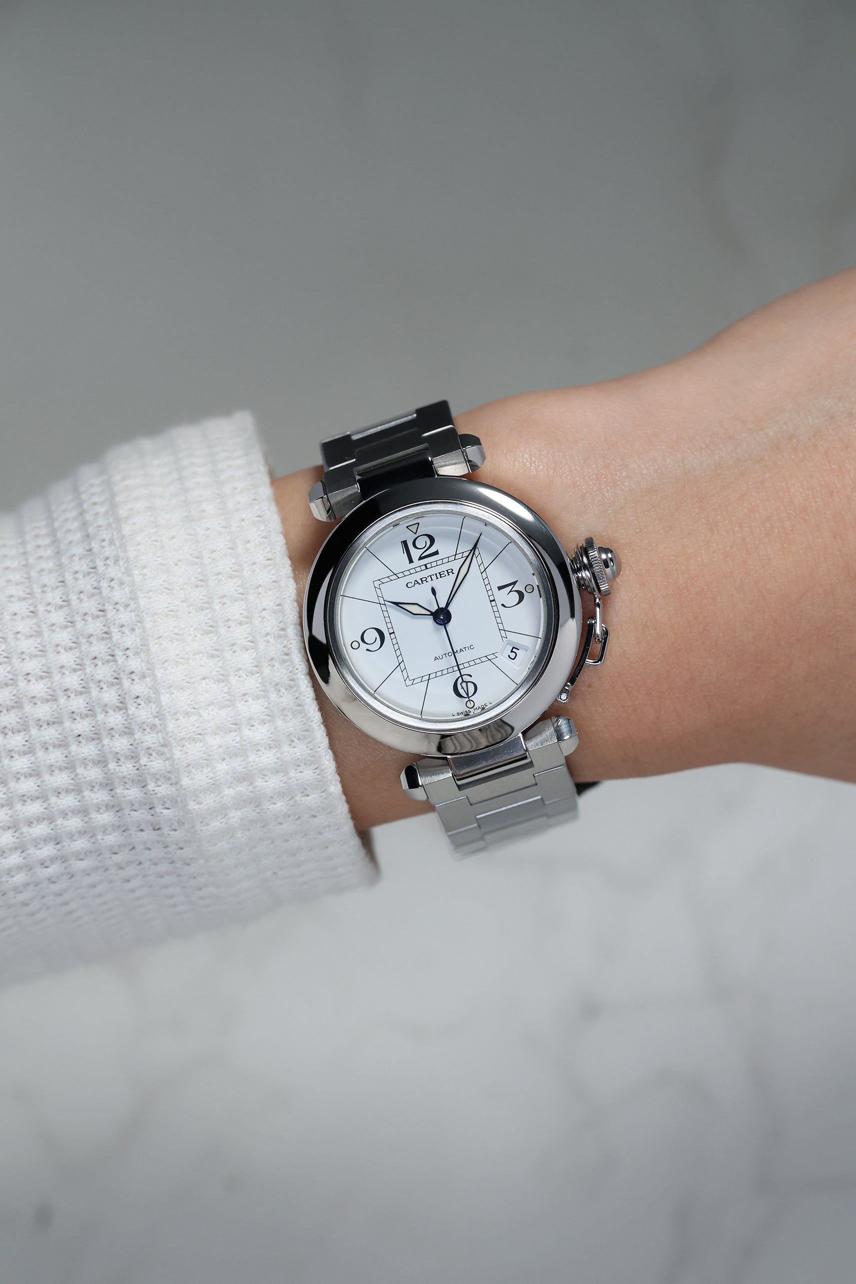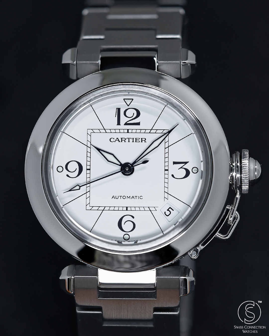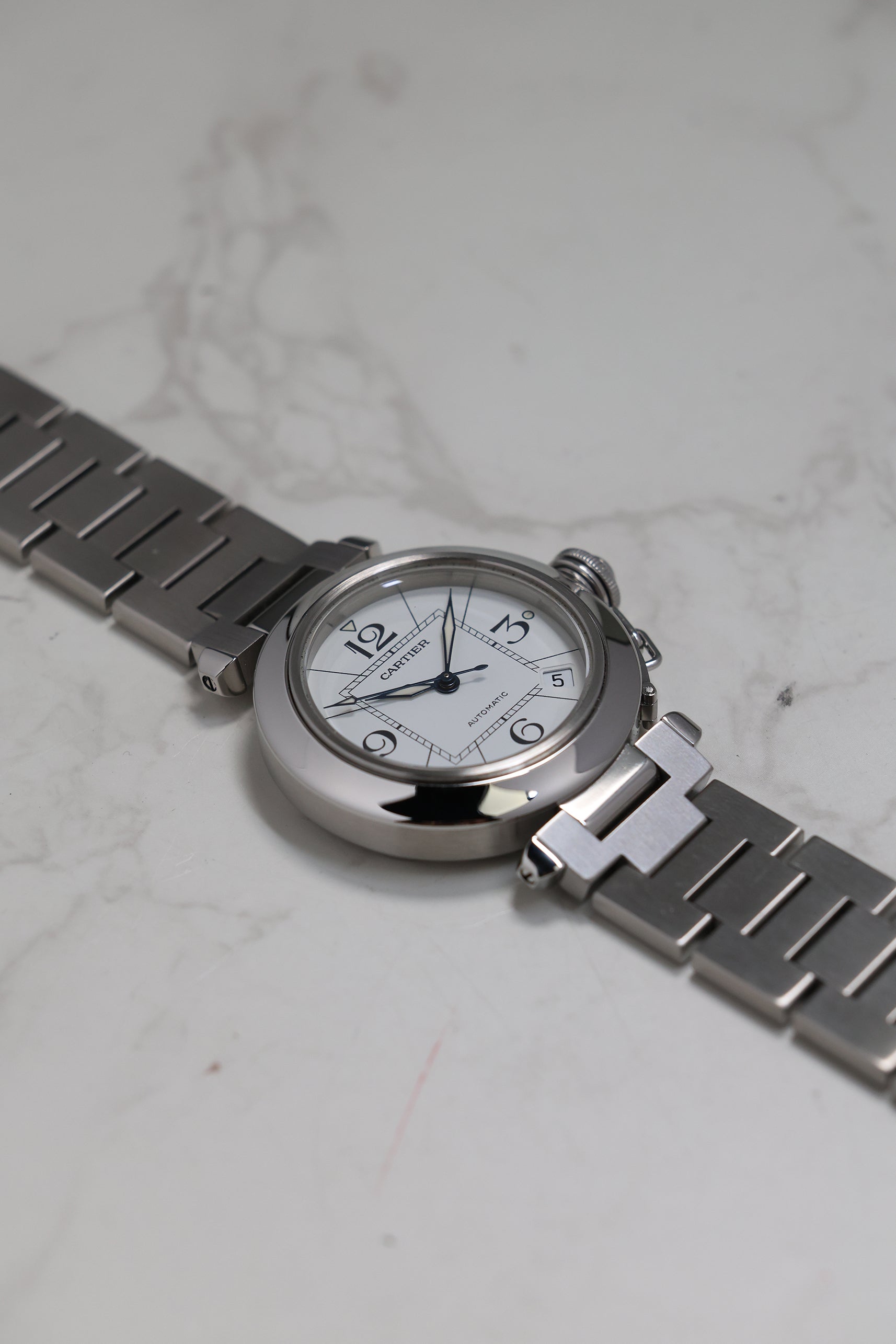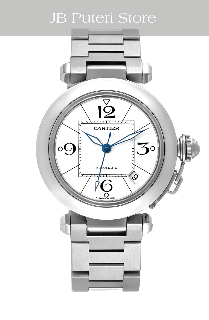 The watch is defined by its 35mm stainless steel case, a "mid-size" proportion that carries significant wrist presence due to its wide, polished bezel and unique lug structure. The Pasha's most theatrical signature is the screw-down crown cap, secured to the case by a small chain link (the chaine). This mechanism not only ensures water resistance but also provides the watch with its unmistakable silhouette. The white dial features a "Big Zero" aesthetic, with oversized Arabic numerals at 12, 3, 6, and 9, a square inner minute track that creates a "square-in-a-circle" geometry, and luminous lozenge-shaped hands.