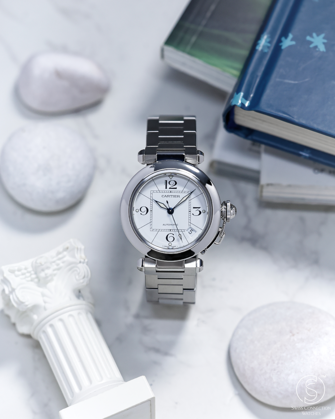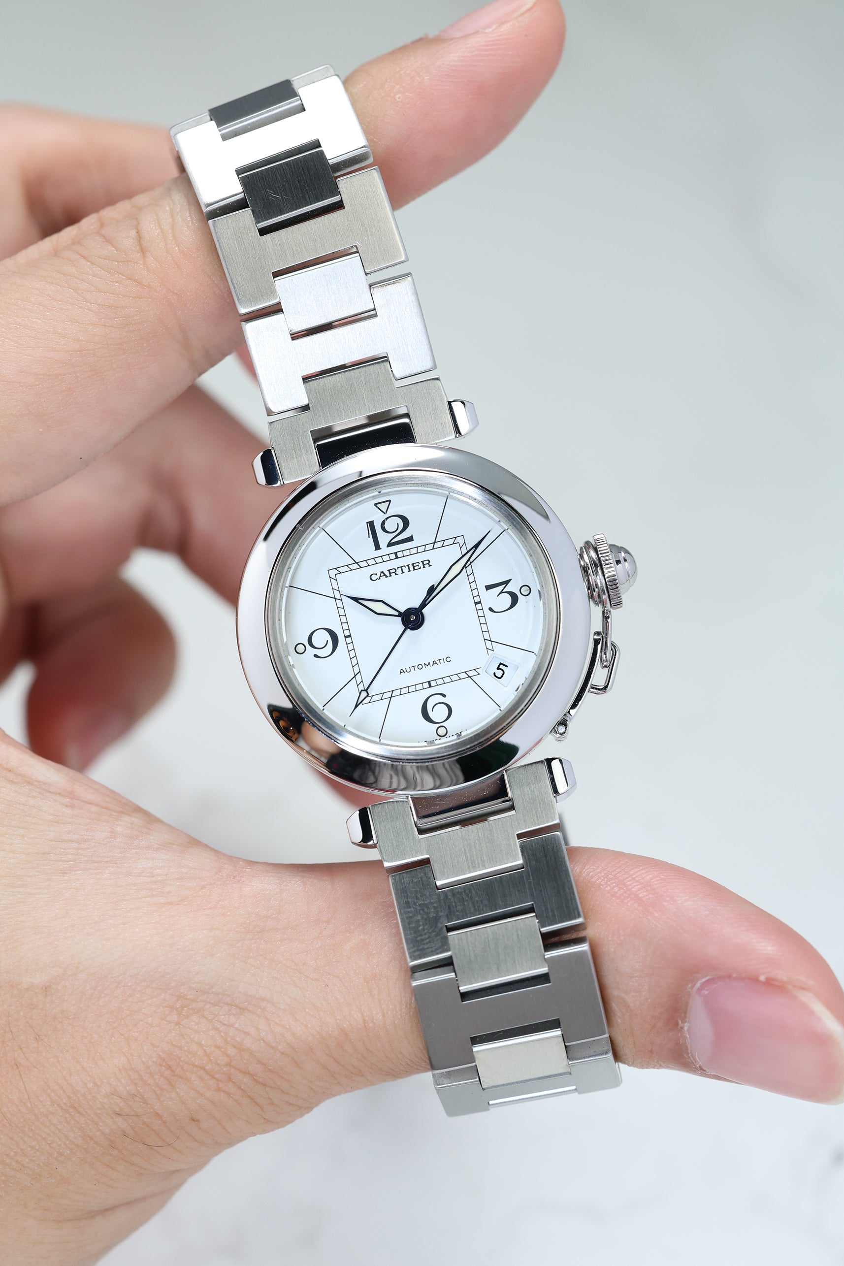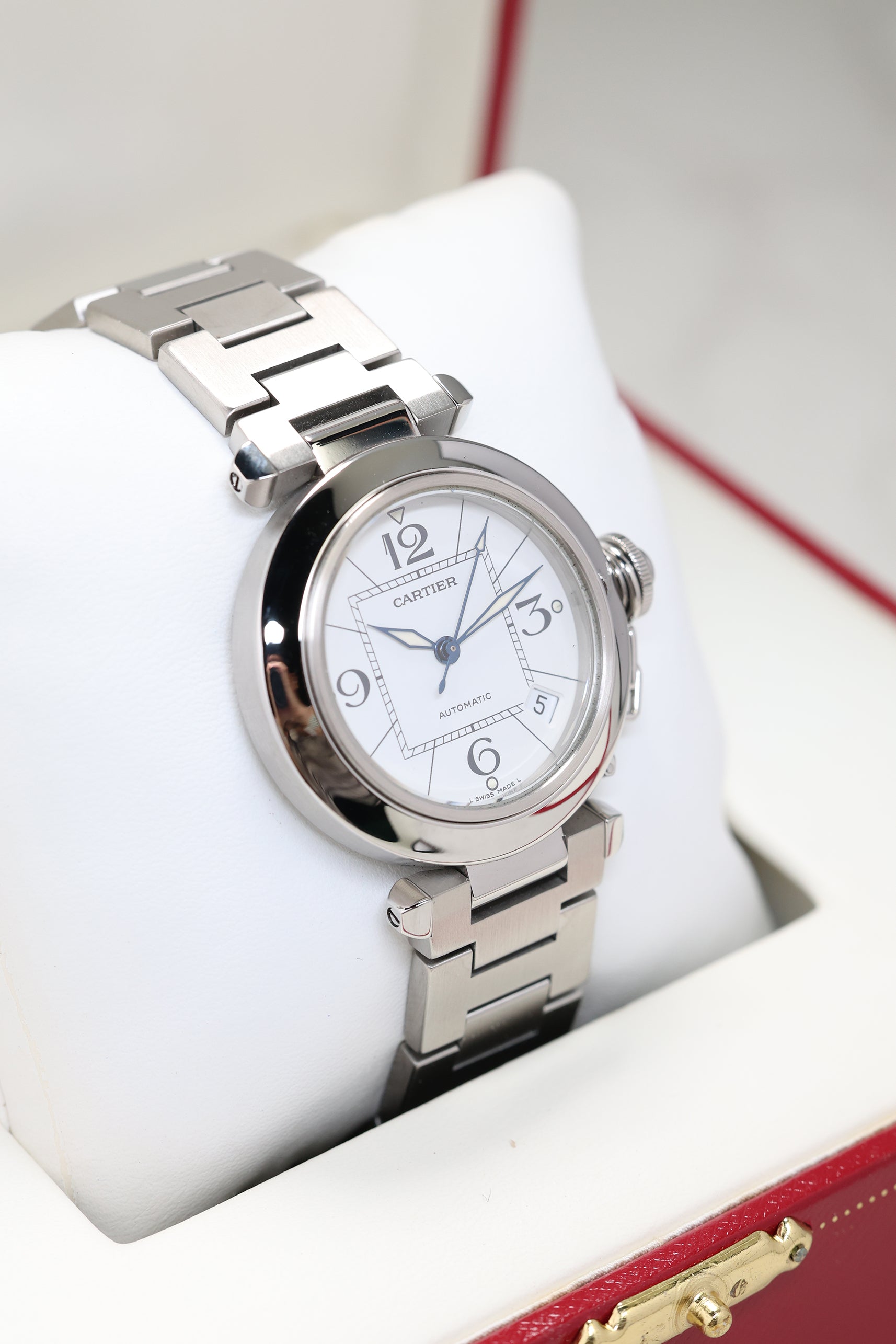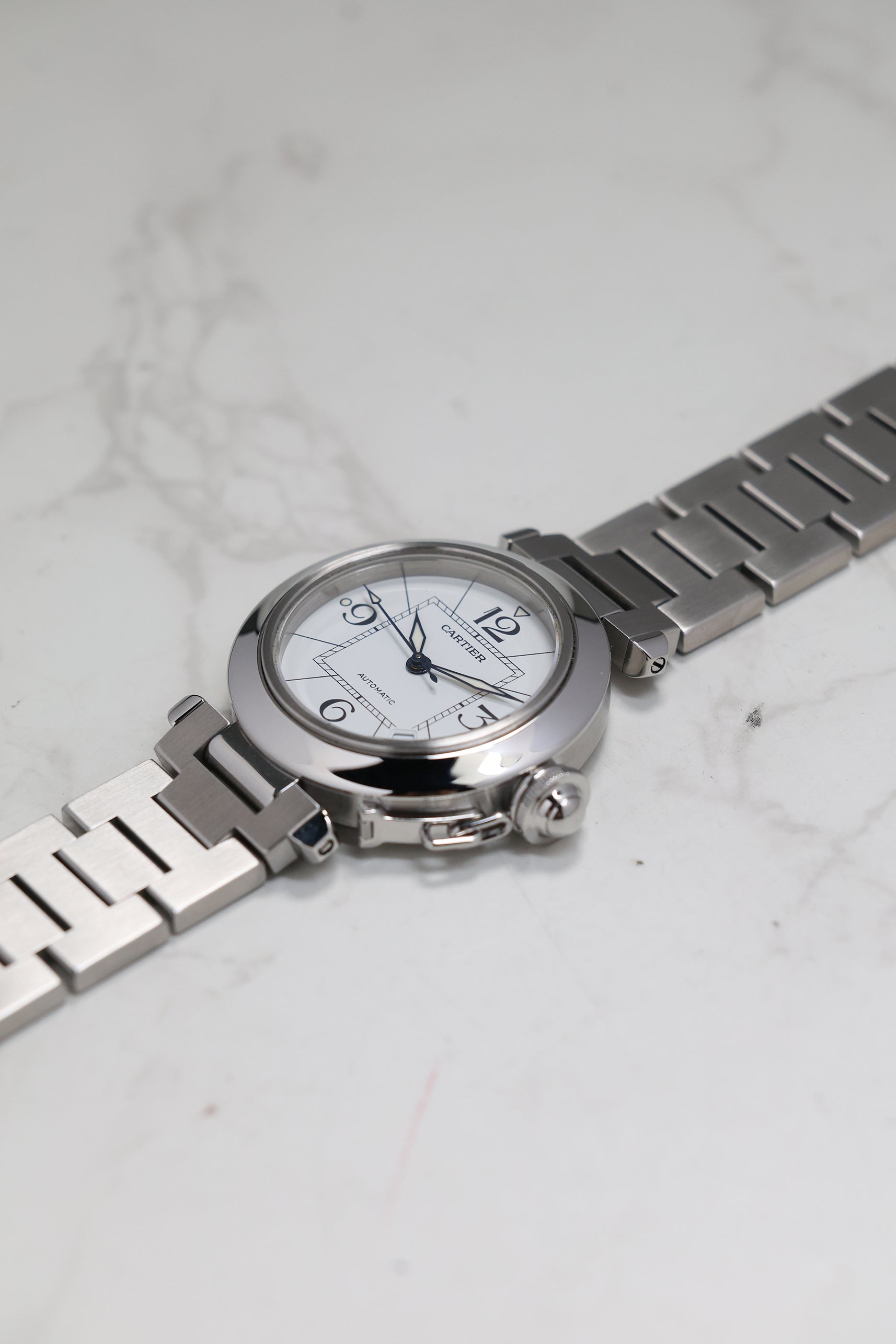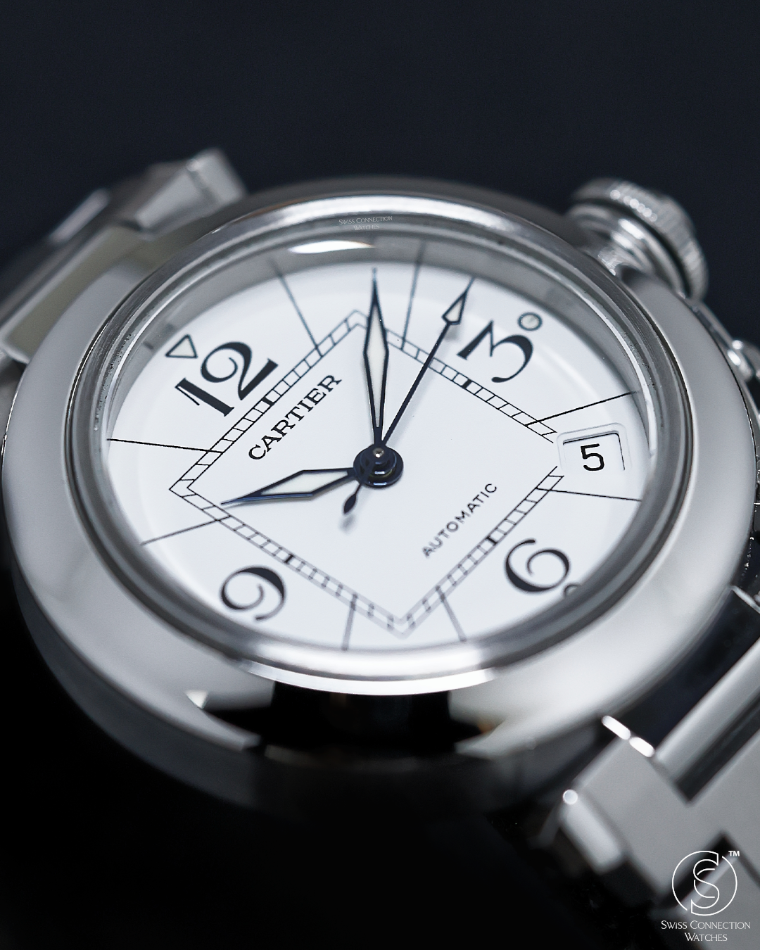 The watch is defined by its 35mm stainless steel case, a "mid-size" proportion that carries significant wrist presence due to its wide, polished bezel and unique lug structure. The Pasha's most theatrical signature is the screw-down crown cap, secured to the case by a small chain link (the chaine). This mechanism not only ensures water resistance but also provides the watch with its unmistakable silhouette. The white dial features a "Big Zero" aesthetic, with oversized Arabic numerals at 12, 3, 6, and 9, a square inner minute track that creates a "square-in-a-circle" geometry, and luminous lozenge-shaped hands.