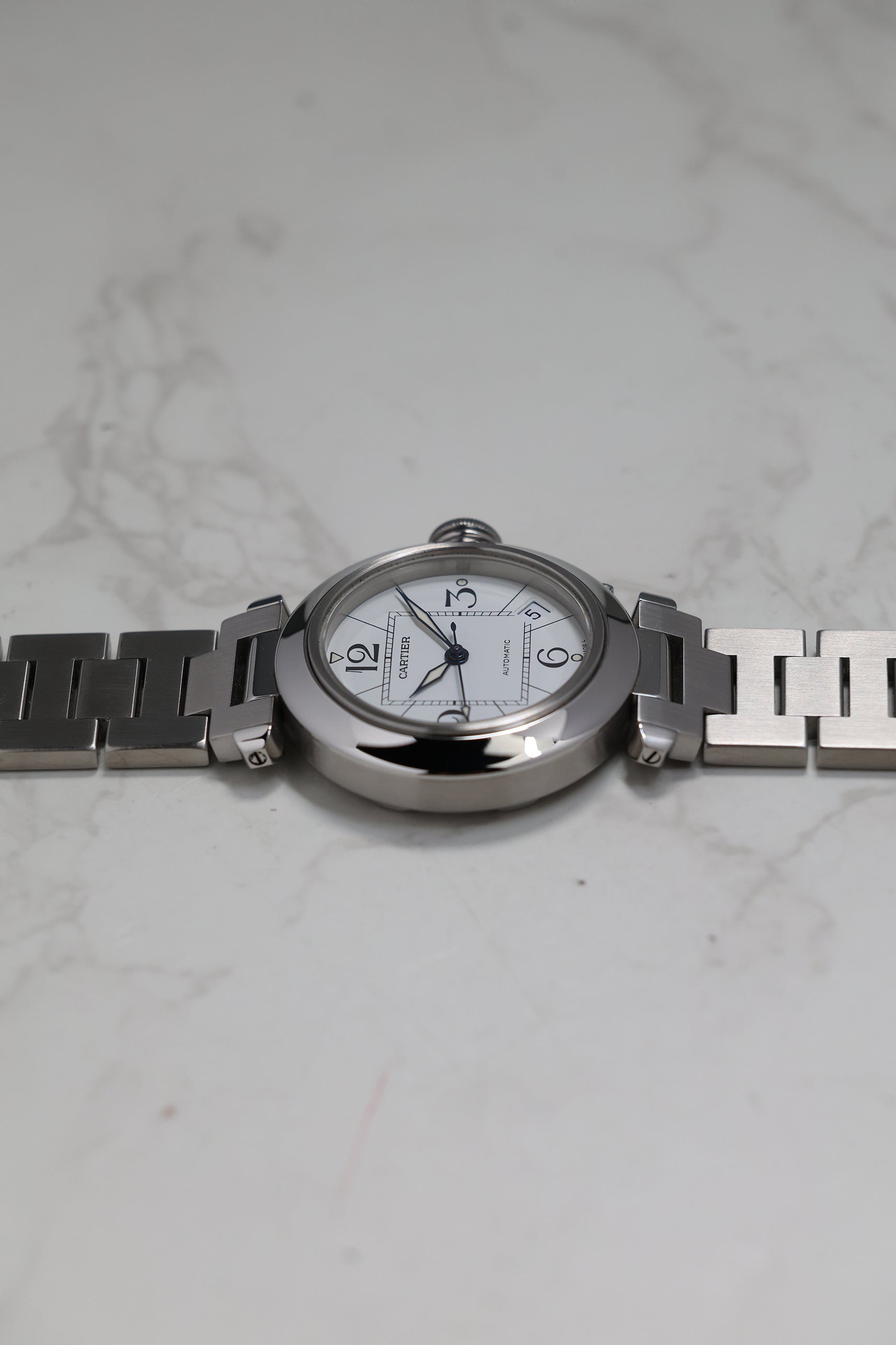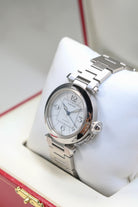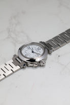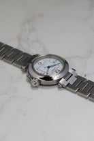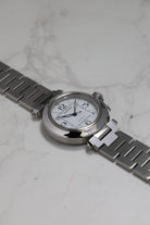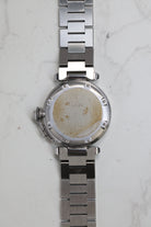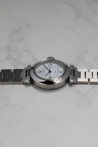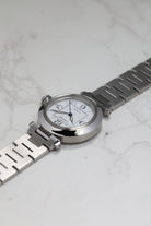 The W31074M7 is powered by the Cartier Calibre 049, a reliable automatic movement based on the workhorse ETA 2892 This movement choice reflects the Pasha C’s identity as a dependable daily driver, offering a date complication discreetly tucked between the 4 and 5 o'clock markers. Unlike the larger 42mm versions that followed, the 35mm Pasha C maintains a slim profile that slides easily under a cuff, balancing its utilitarian roots with Cartier’s inherent Parisian elegance.