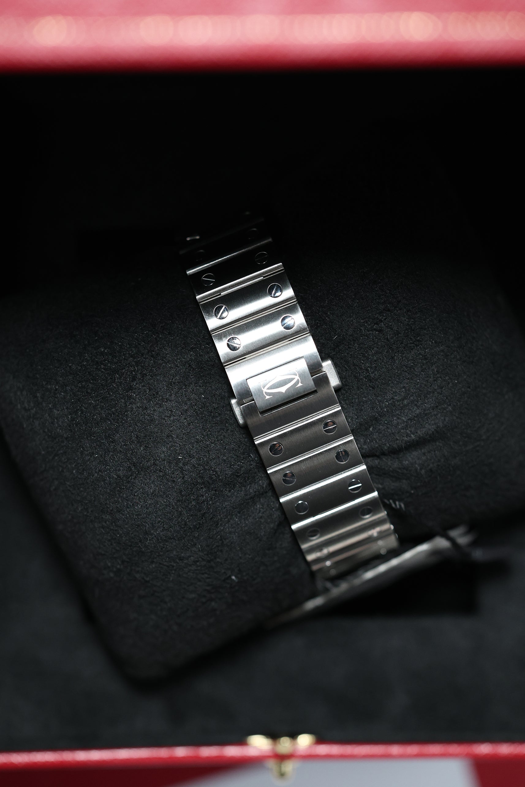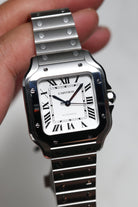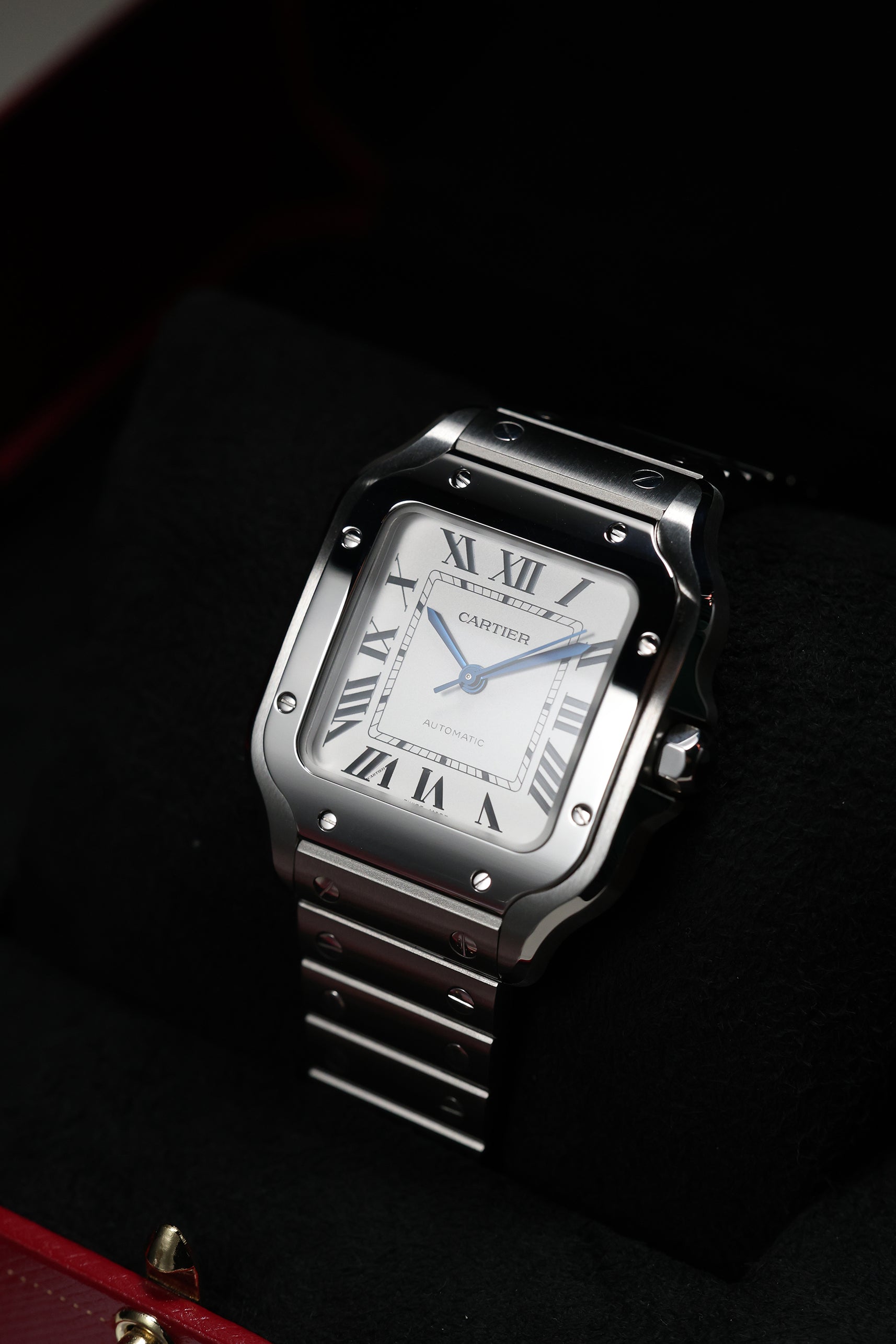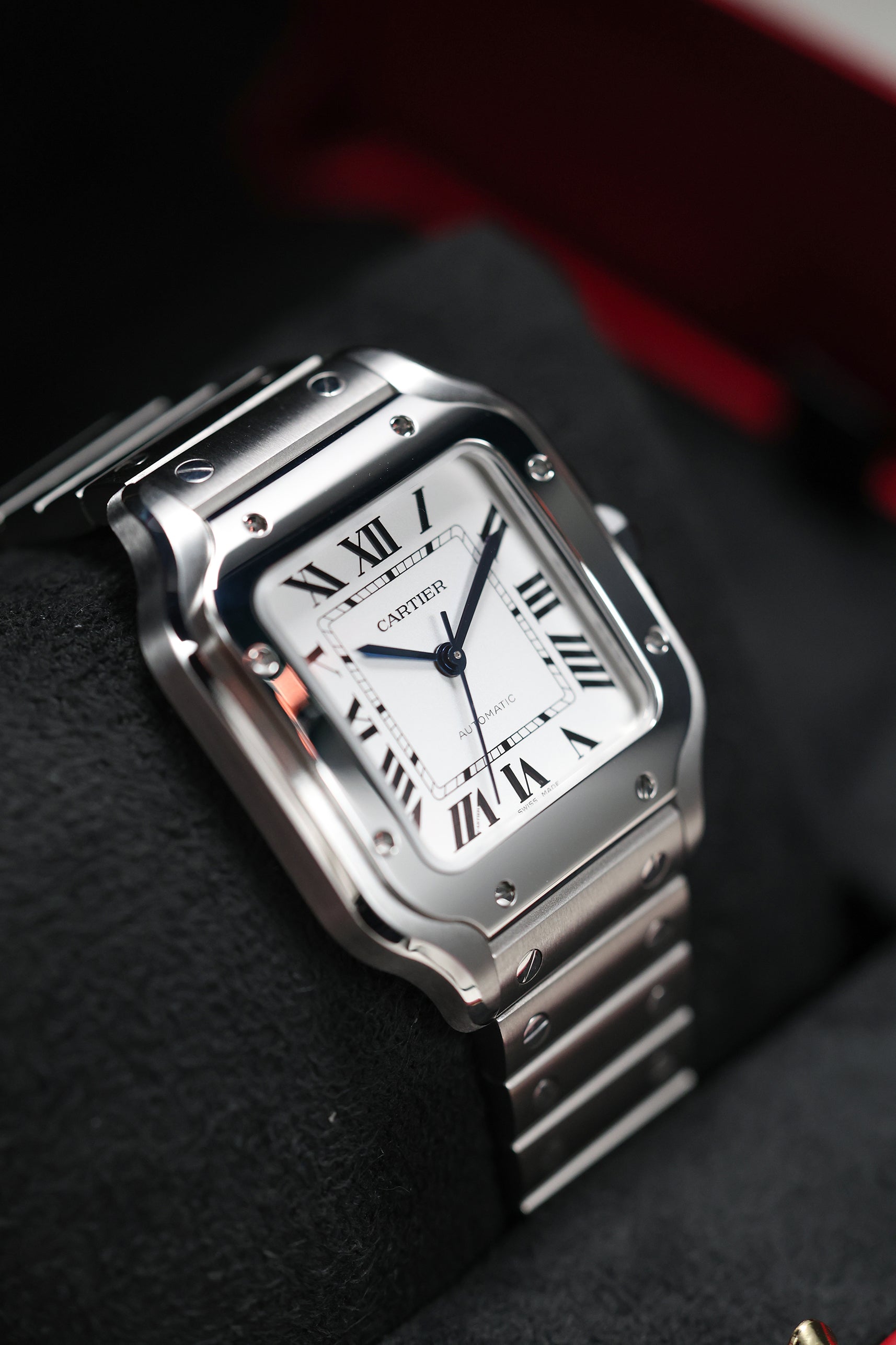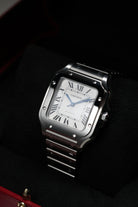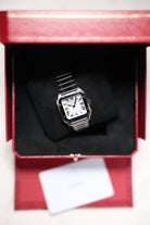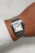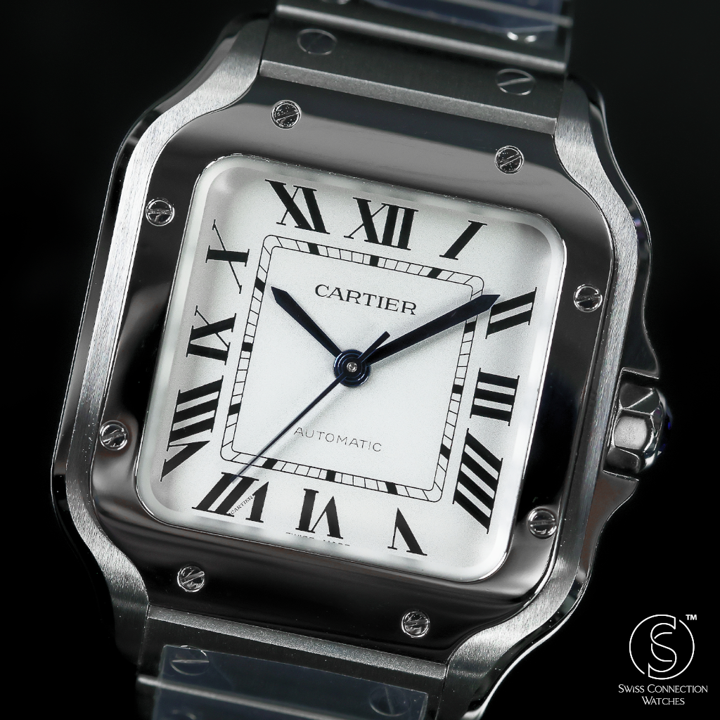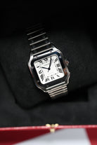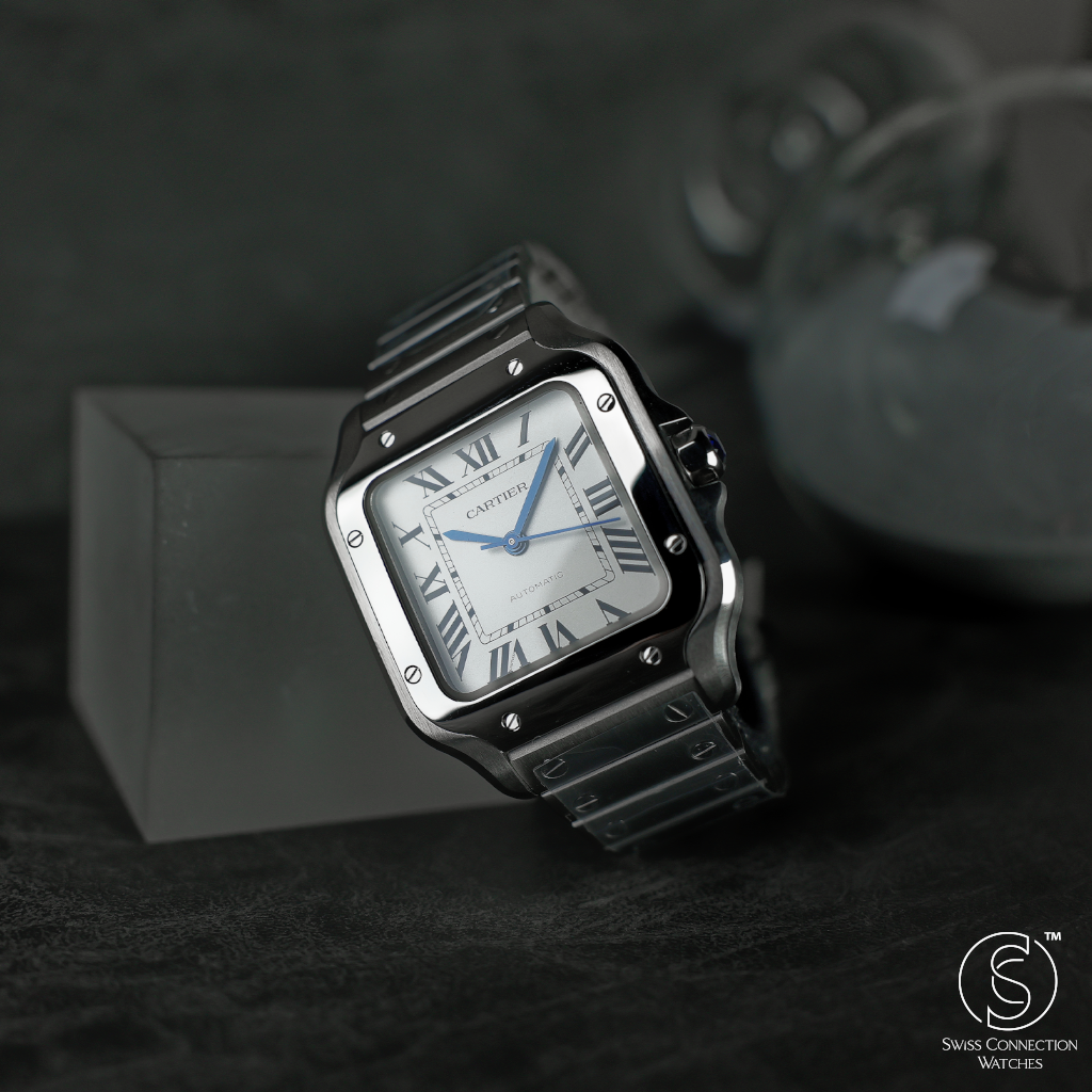 The 35.1mm stainless steel case offers a balanced presence — not oversized, yet far from discreet. Its distinctive square form is punctuated by eight visible screws on the bezel, a subtle nod to the industrial elegance that defines the Santos lineage. The silvered opaline dial is classic Cartier: Roman numerals, railroad minute track, and blued-steel sword hands—all housed under a sapphire crystal that plays gently with the light. It’s a composition that feels architectural, precise, and unmistakably Parisian.