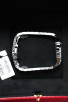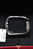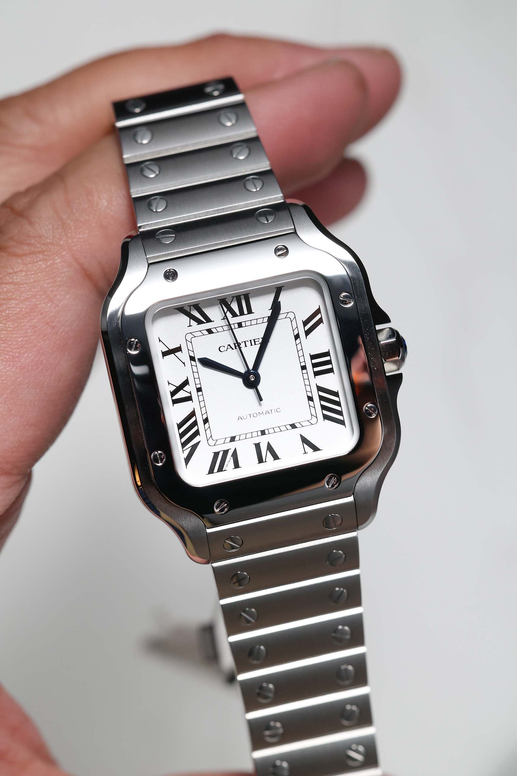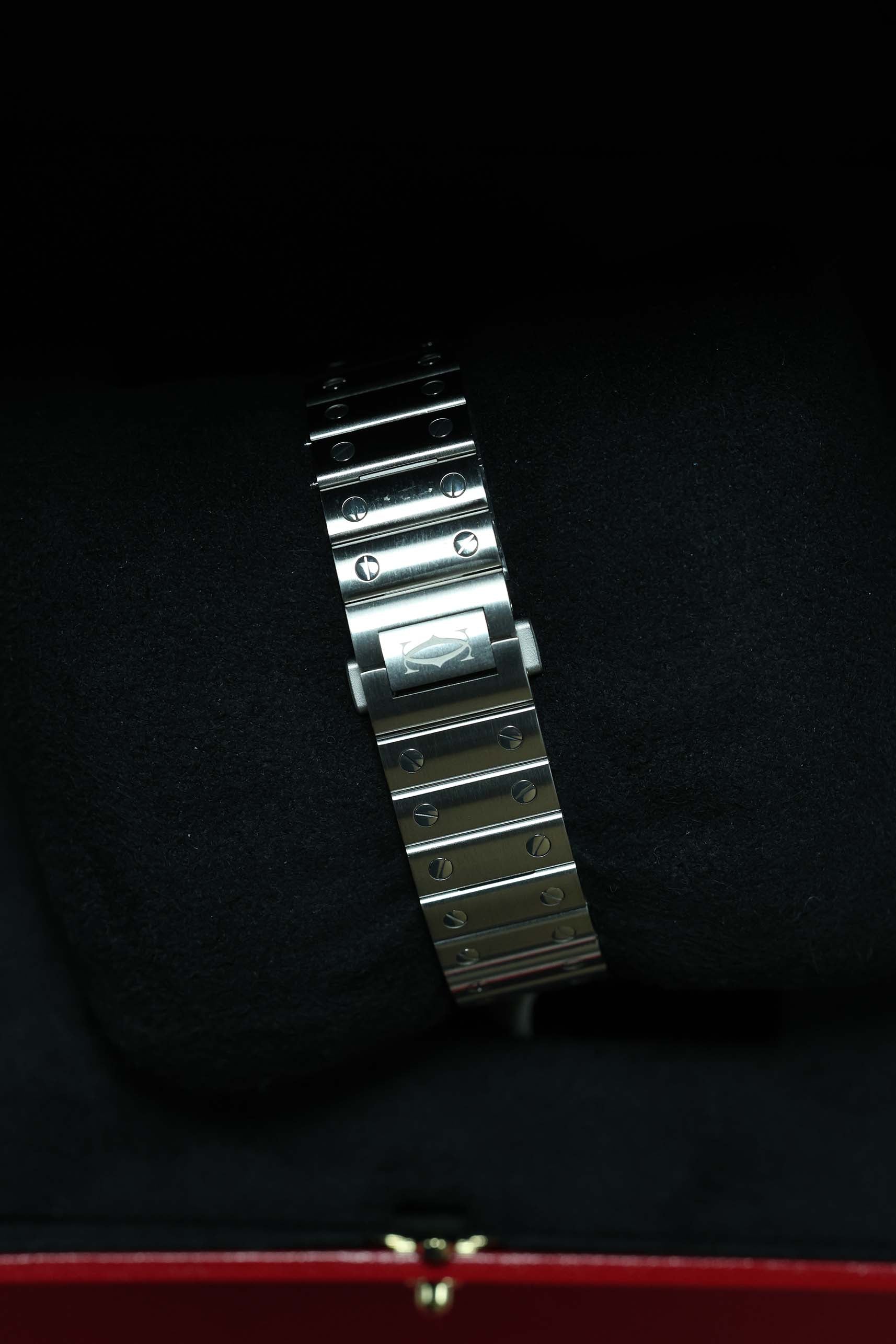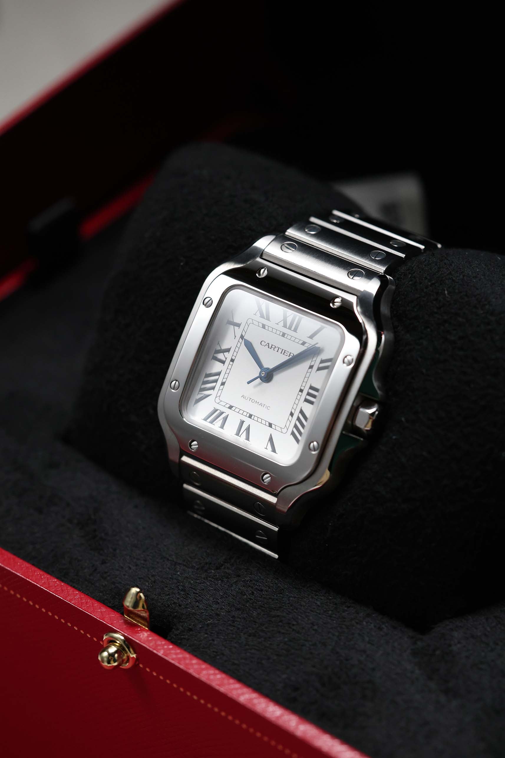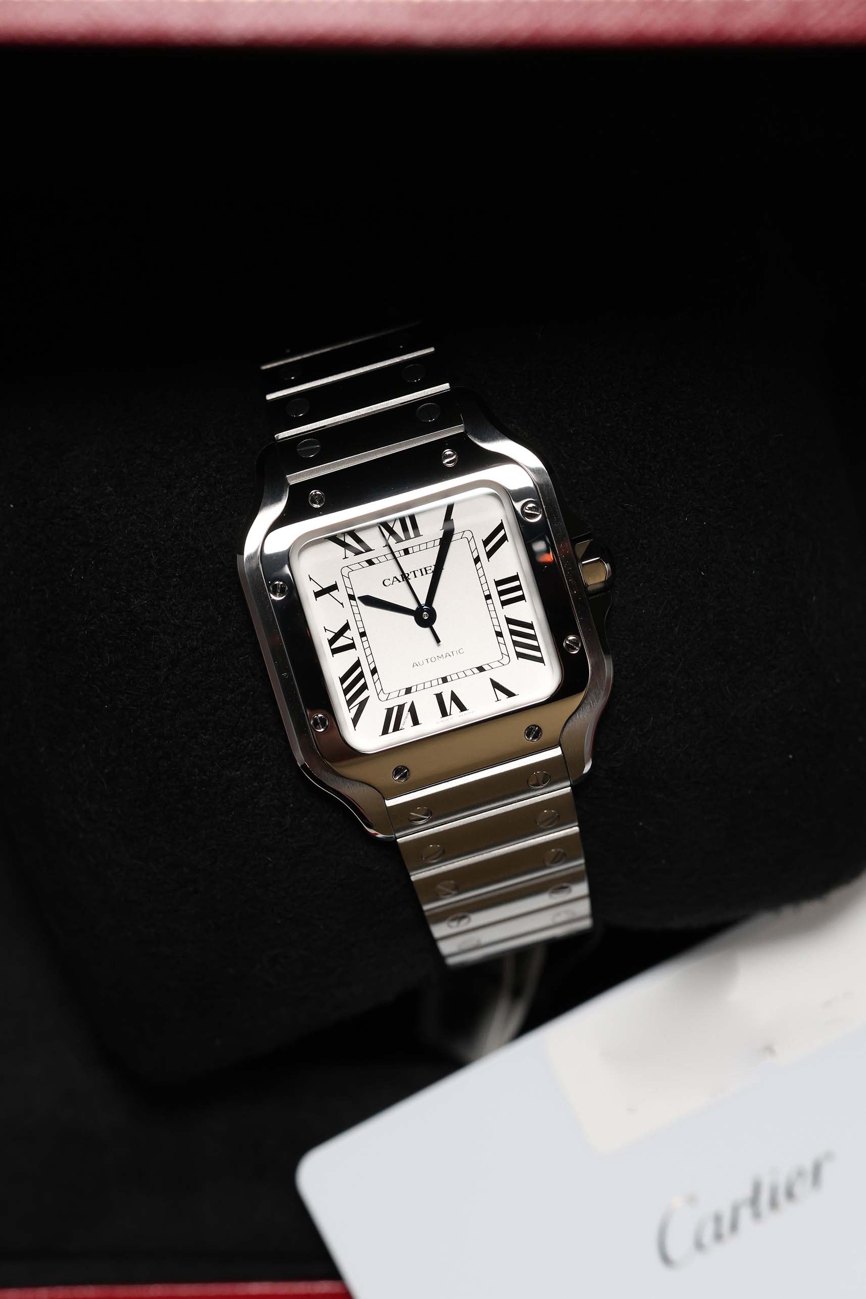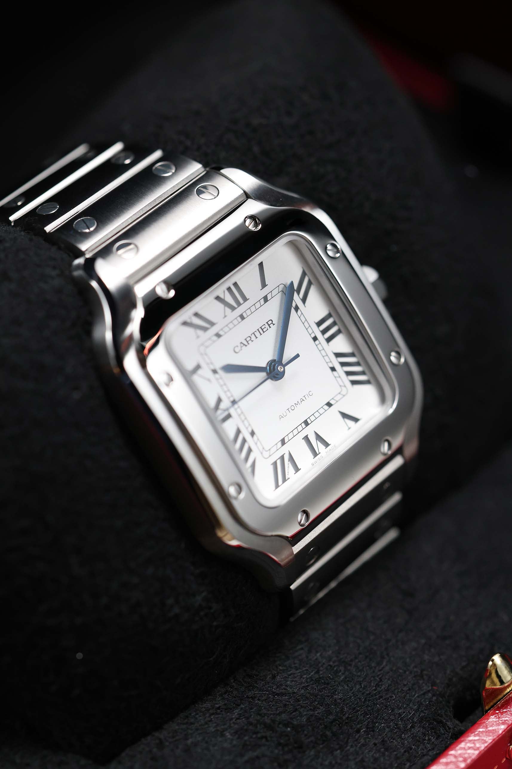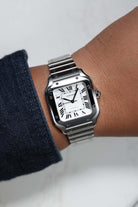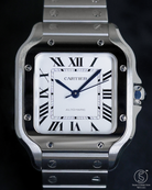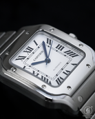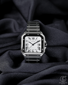 The 35.1mm stainless steel case offers a balanced presence — not oversized, yet far from discreet. Its distinctive square form is punctuated by eight visible screws on the bezel, a subtle nod to the industrial elegance that defines the Santos lineage. The silvered opaline dial is classic Cartier: Roman numerals, railroad minute track, and blued-steel sword hands—all housed under a sapphire crystal that plays gently with the light. It’s a composition that feels architectural, precise, and unmistakably Parisian.
