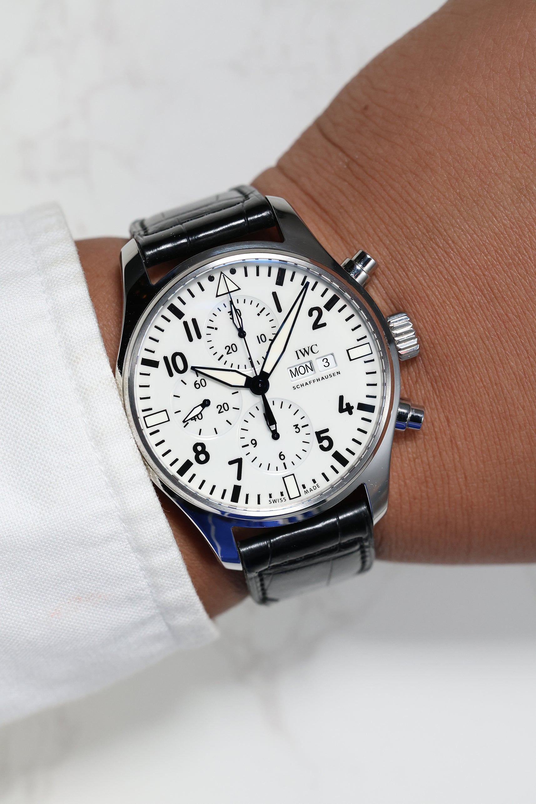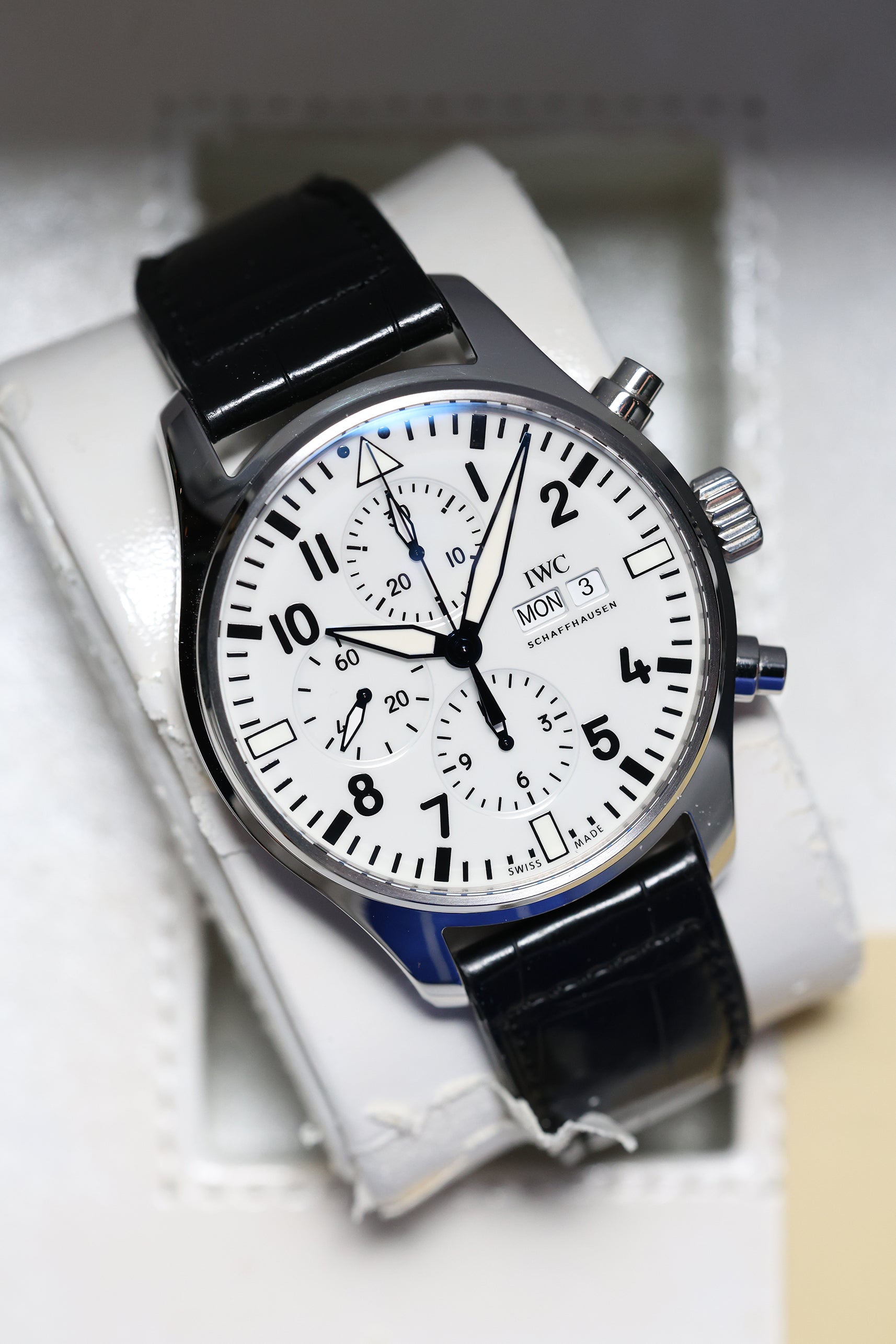 The centerpiece of the IW377725 is its breathtaking white lacquer dial. Crafted using multiple layers of translucent lacquer, the dial possesses a liquid-like gloss and an incredible sense of depth. This pristine backdrop provides a sharp, high-contrast canvas for the black printed Arabic numerals and the iconic pilot’s triangle at 12 o’clock.