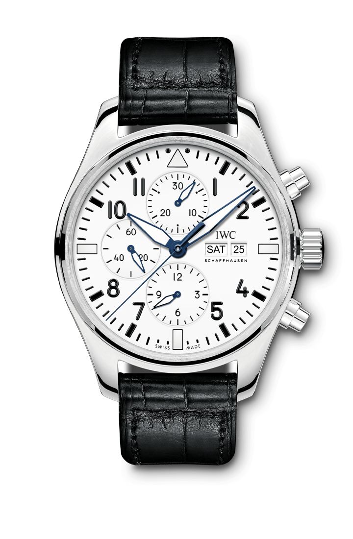 The 43mm stainless steel case retains the bold, purposeful architecture of the Pilot’s Watch Chronograph, featuring a mix of brushed and polished surfaces. Despite its elegant dial, the watch remains a true instrument of aviation, featuring a soft-iron inner case to protect the movement against magnetic fields and a screw-down crown that ensures a water resistance of 60 meters. The Day-Date complication at 3 o'clock—a hallmark of the Pilot’s Chronograph series—is rendered with crisp black-on-white discs that blend seamlessly into the lacquered aesthetic.