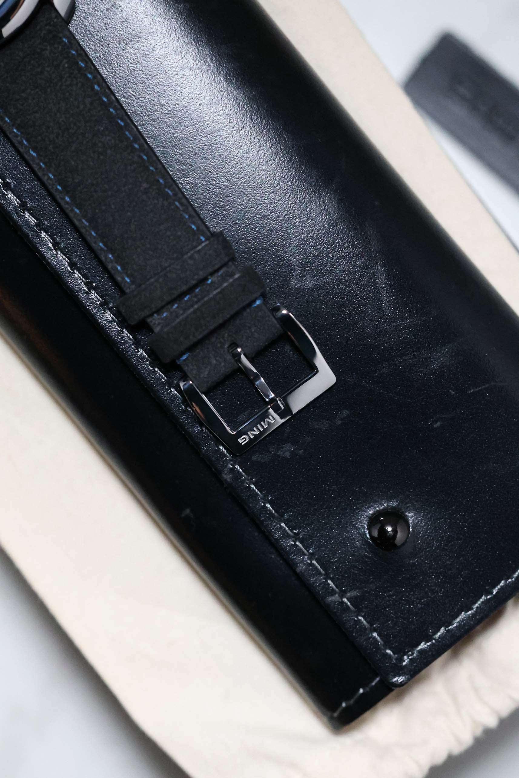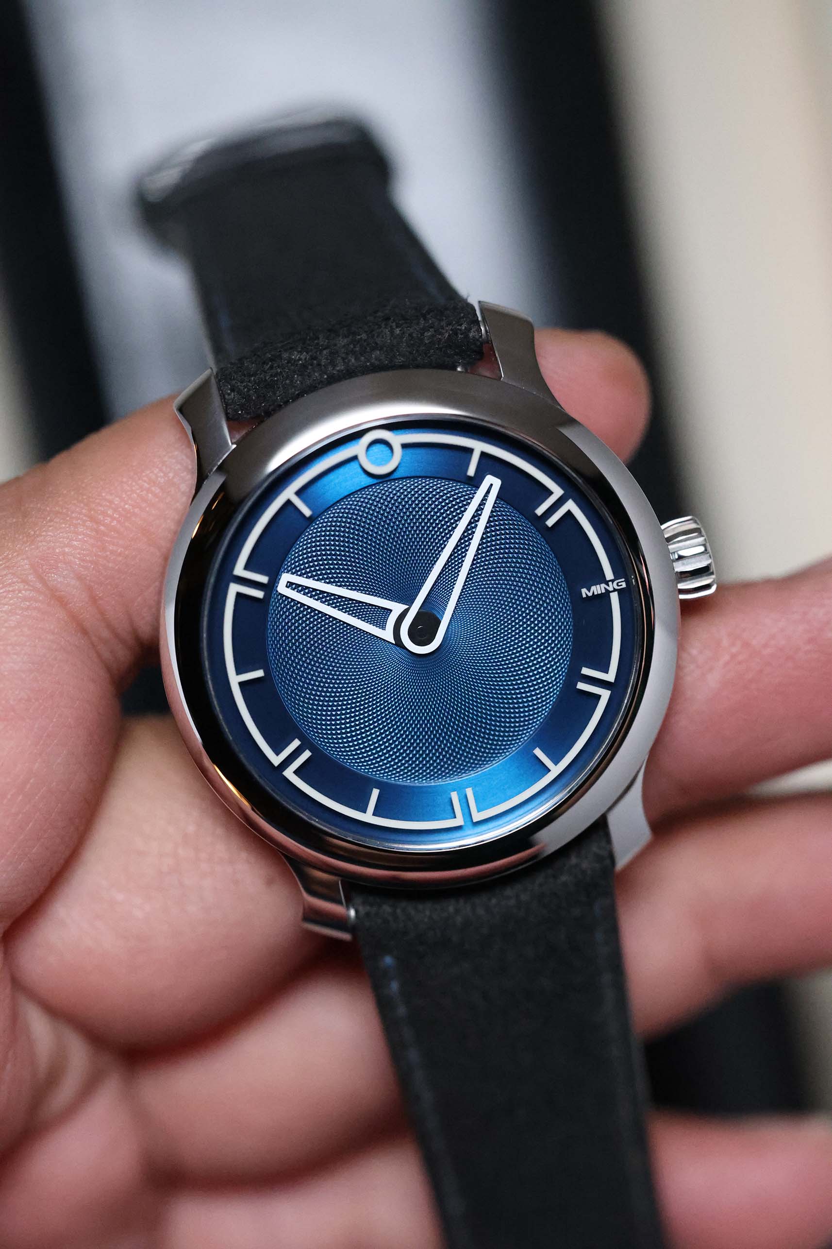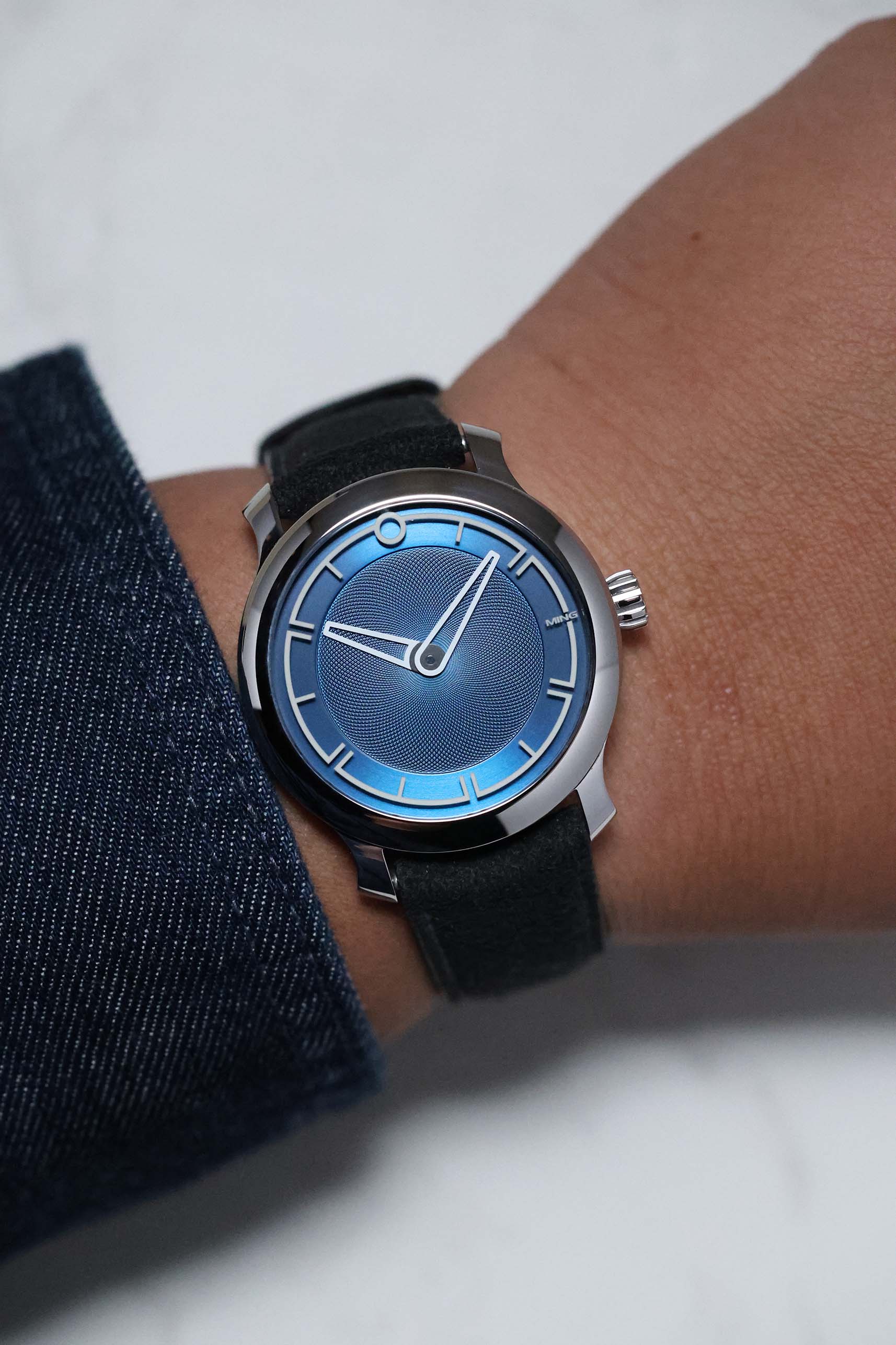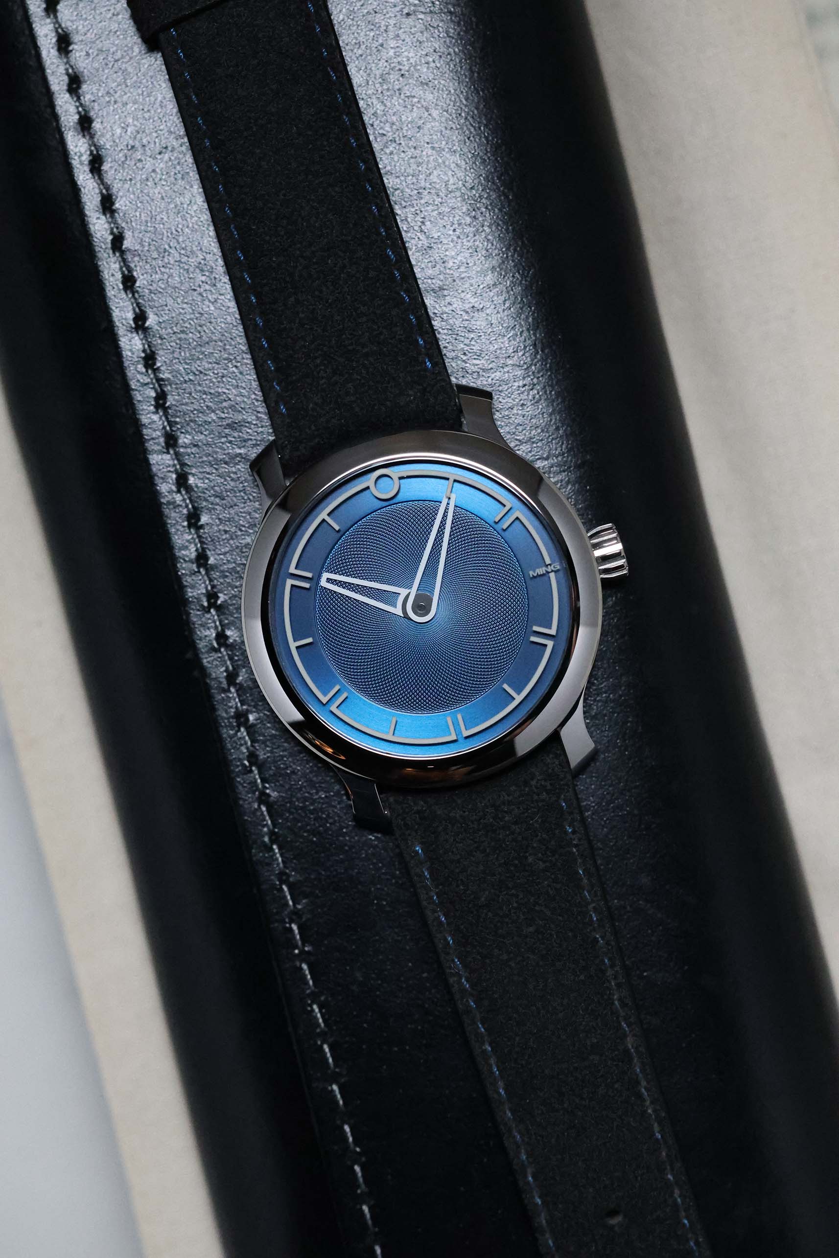 The dial is a masterclass in three-dimensional depth. Finished in a rich, metallic blue, the central portion features a distinct clous de Paris (guilloché) pattern that radiates from the center, creating a dynamic play of light. In a departure from traditional dial construction, the Arabic numerals are laser-etched into the underside of the sapphire crystal and filled with Super-LumiNova. This creates a mesmerizing "floating" effect over the dial surface, a hallmark of MING’s obsession with transparency and light. The absence of a seconds hand further emphasizes the watch's minimalist, serene aesthetic.