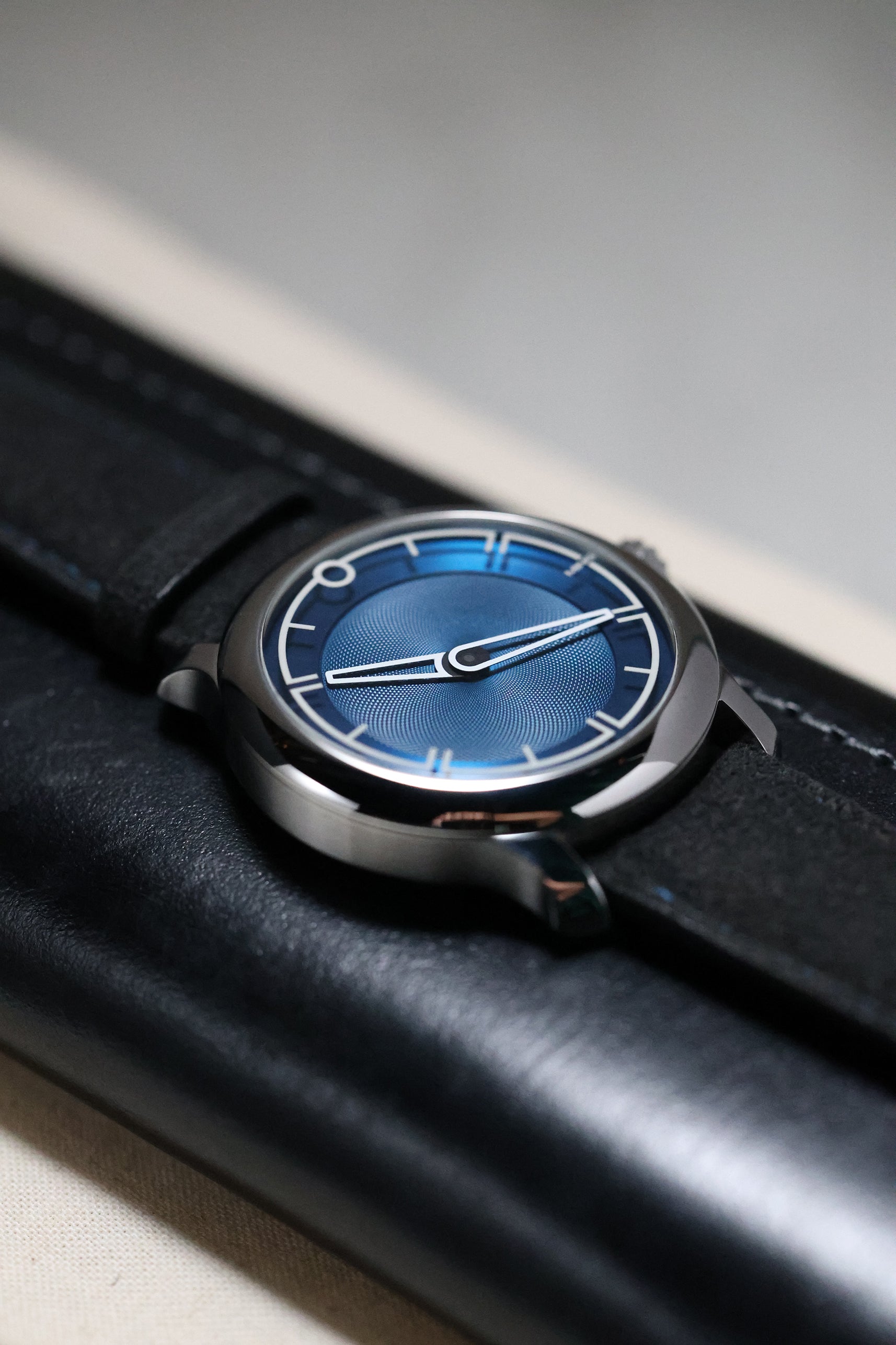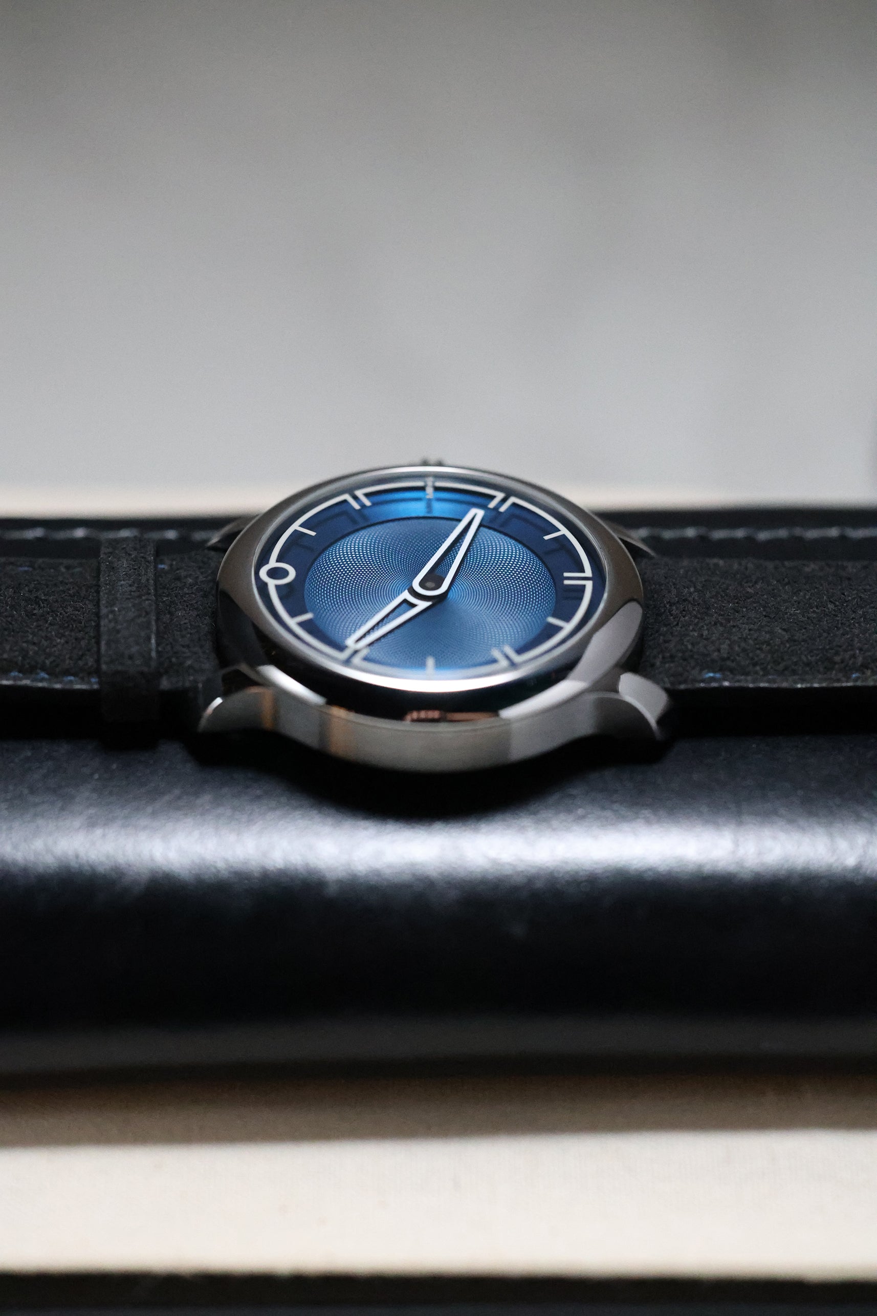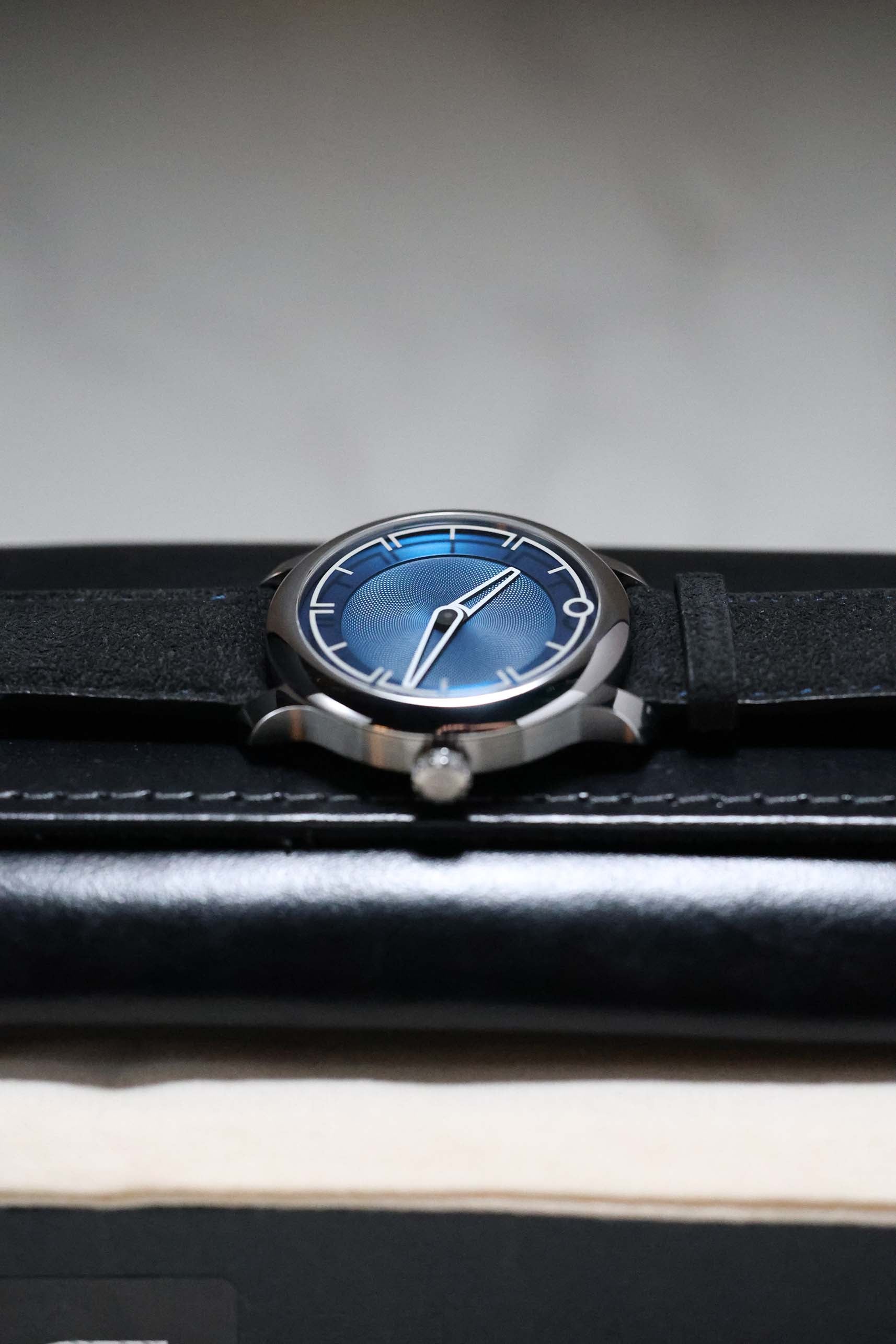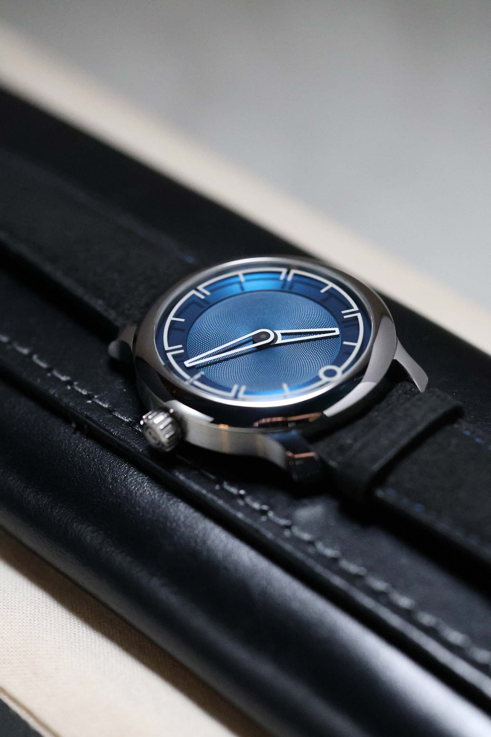 The dial is a masterclass in three-dimensional depth. Finished in a rich, metallic blue, the central portion features a distinct clous de Paris (guilloché) pattern that radiates from the center, creating a dynamic play of light. In a departure from traditional dial construction, the Arabic numerals are laser-etched into the underside of the sapphire crystal and filled with Super-LumiNova. This creates a mesmerizing "floating" effect over the dial surface, a hallmark of MING’s obsession with transparency and light. The absence of a seconds hand further emphasizes the watch's minimalist, serene aesthetic.