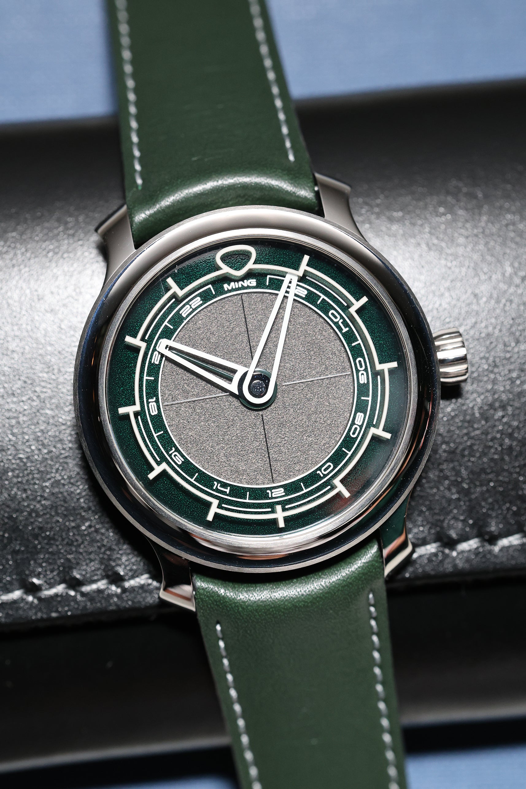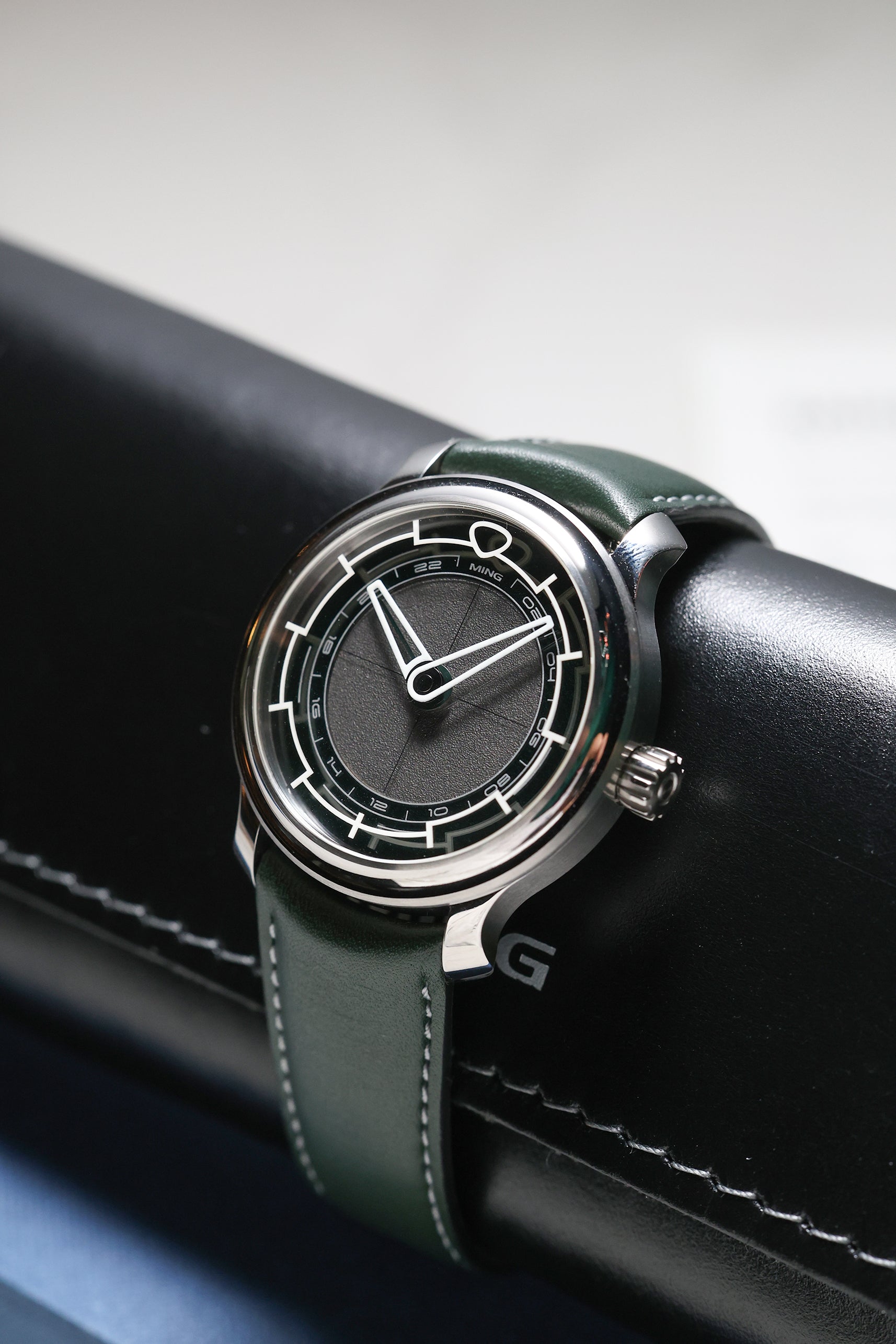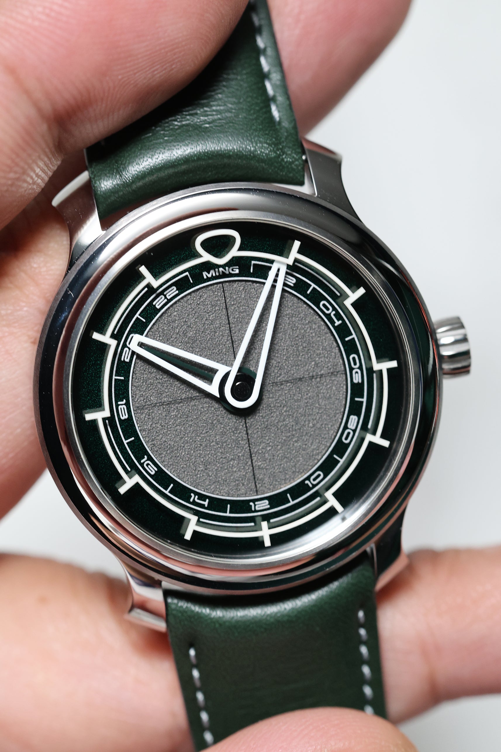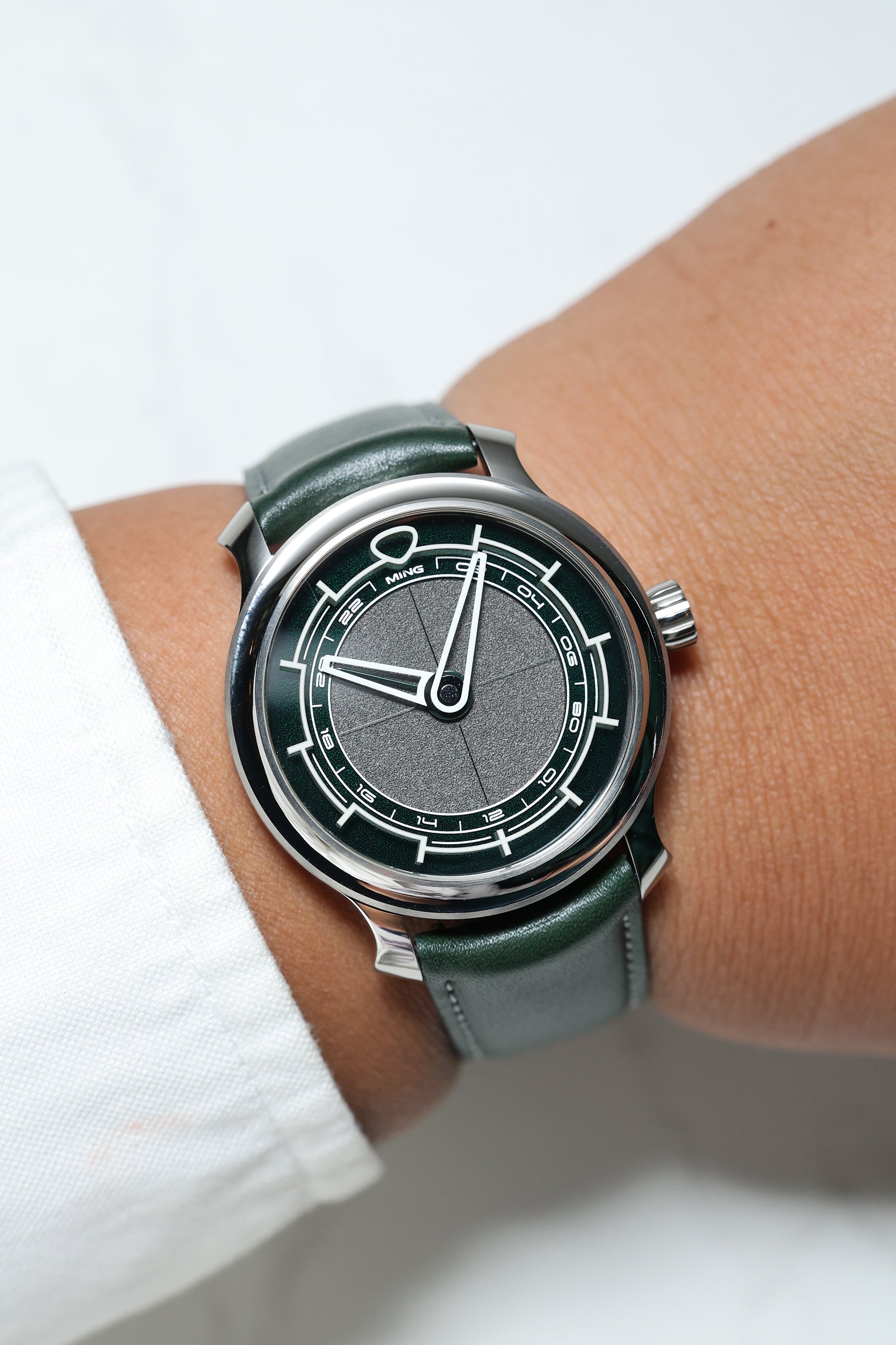 The MING 22.01 GMT Kyoto is a study in quiet restraint, transformed by a single dramatic detail: its combination of green and grey dial, inspired by the spirit and serenity of Kyoto. Unlike traditional travel watches that crowd the dial with information, the 22.01 Kyoto is stripped back and clean. It’s an unmistakably MING timepiece, defined by elegant proportions, thoughtful geometry, and a design philosophy that values clarity above clutter.