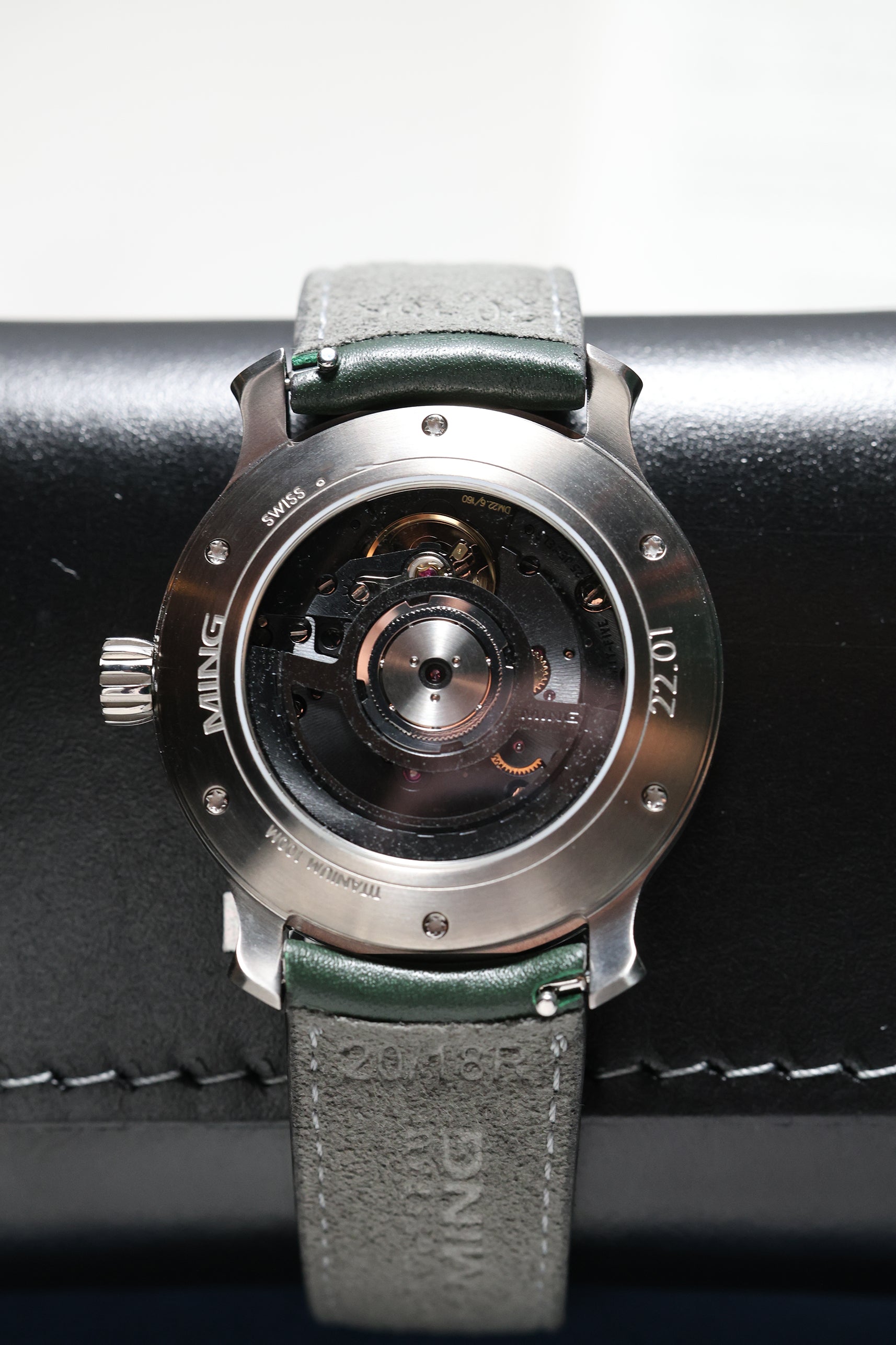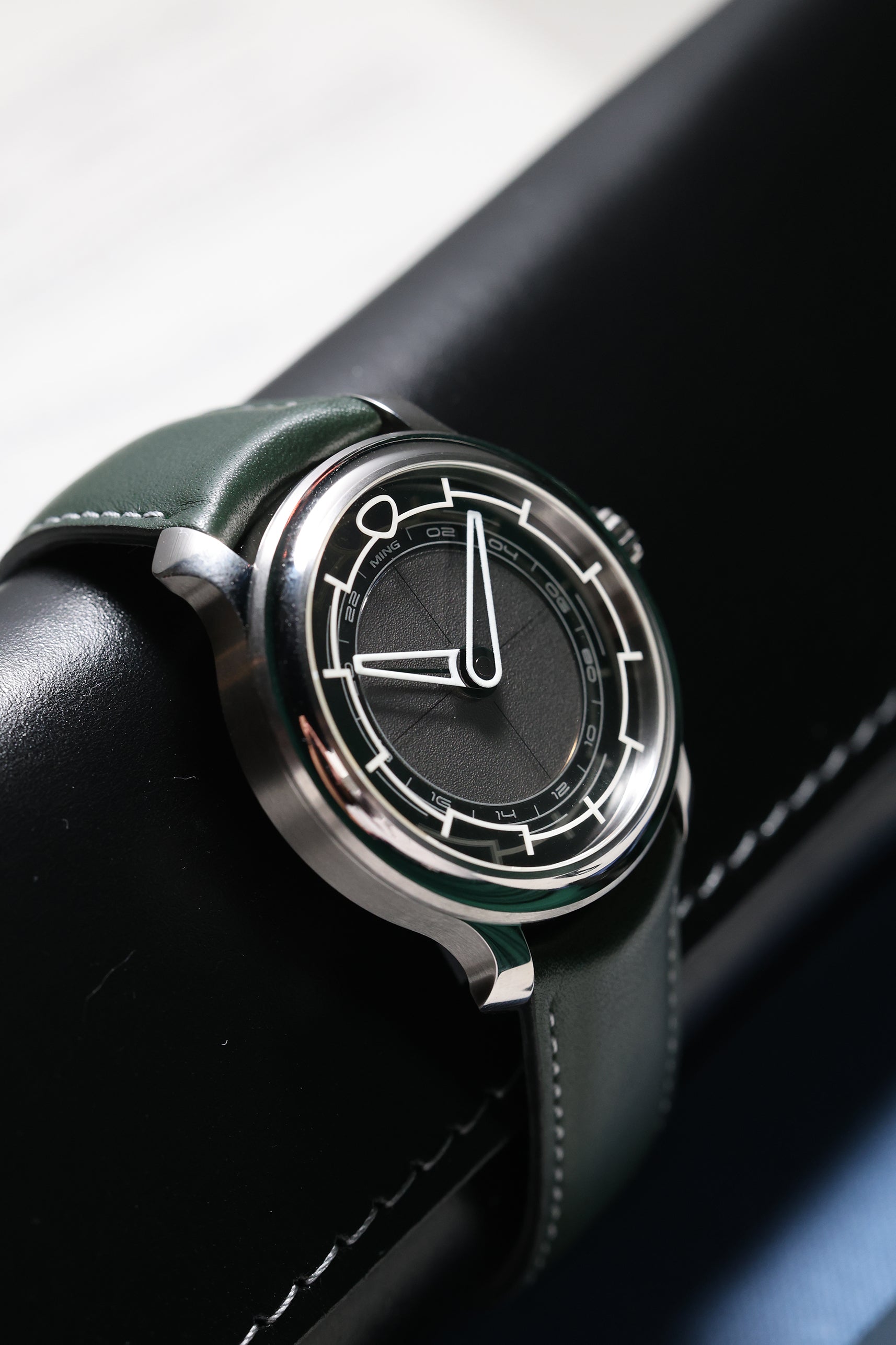 At 38mm, the case strikes a perfect balance between presence and wearability. It’s rendered in lightweight grade 5 titanium for everyday comfort, with smooth lines and distinctive flared lugs that echo MING’s design DNA. The combination of brushed and polished surfaces creates subtle depth, rewarding those who take the time for a closer look.