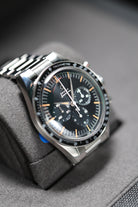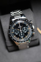 The stainless steel bracelet, with its polished and brushed finishing, enhances the versatility and everyday wearability of the watch. The combination of the compact 39.7mm case and the classic bracelet allows the "First Omega in Space" to sit snugly on the wrist, offering a comfortable, vintage-inspired proportion. Altogether, this timepiece is a thoughtful and technically advanced celebration of Omega's space exploration heritage, making it a highly desirable piece for modern Speedmaster enthusiasts.