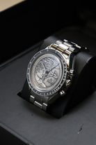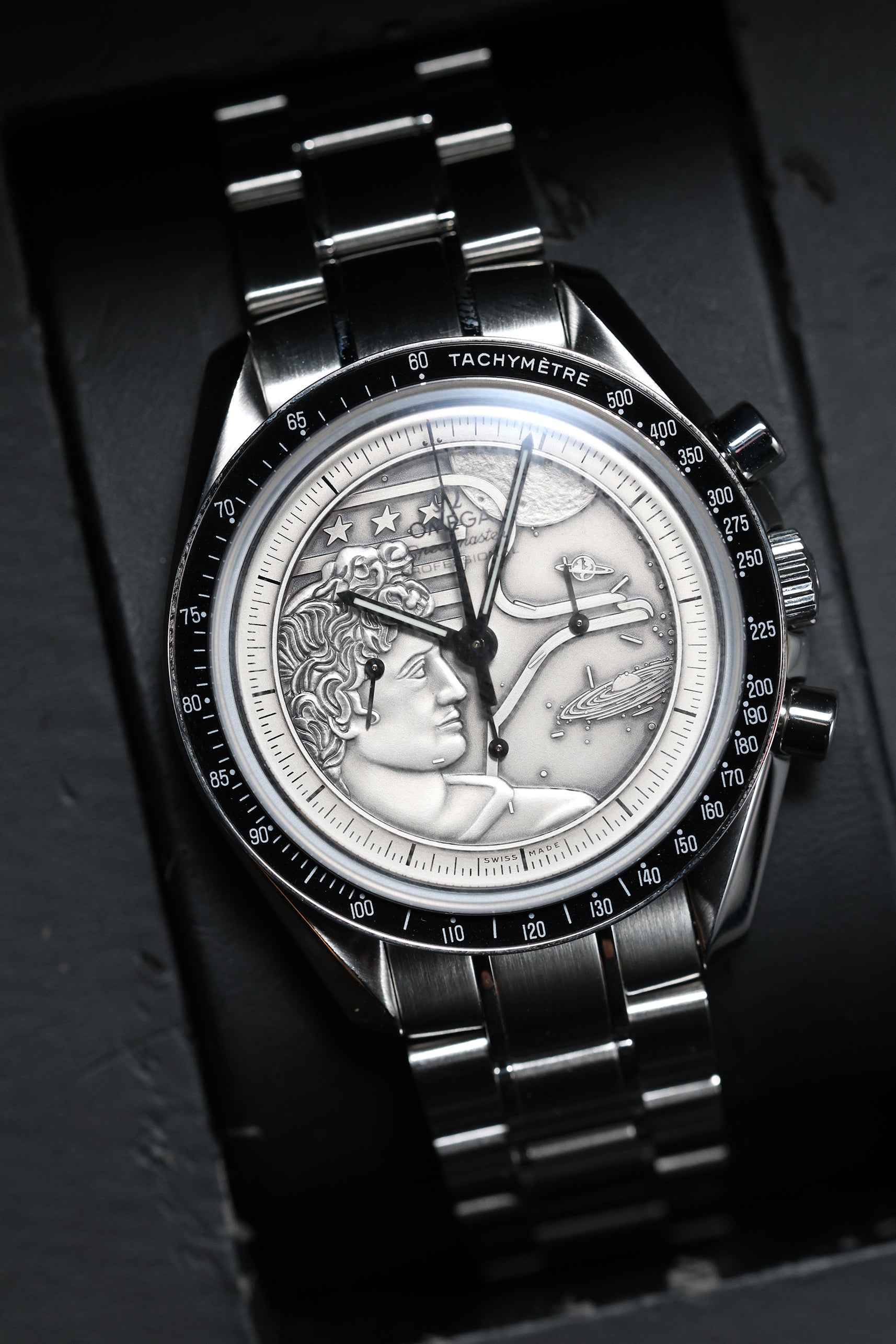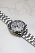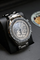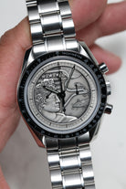 What immediately sets this Speedmaster apart is its striking silver 925 dial. This unique, artistic surface features a medallion-style engraving that intricately depicts the Apollo XVII mission patch, complete with the Greek god Apollo, an eagle with a US flag design, and the celestial bodies like the Moon, Saturn and a spiral galaxy. This complex design transforms the traditional Speedmaster into a wearable piece of art and history, while the classic triple-register chronograph layout, black minute track, and luminous hands remain clearly legible, all protected by a historically accurate Hesalite crystal.