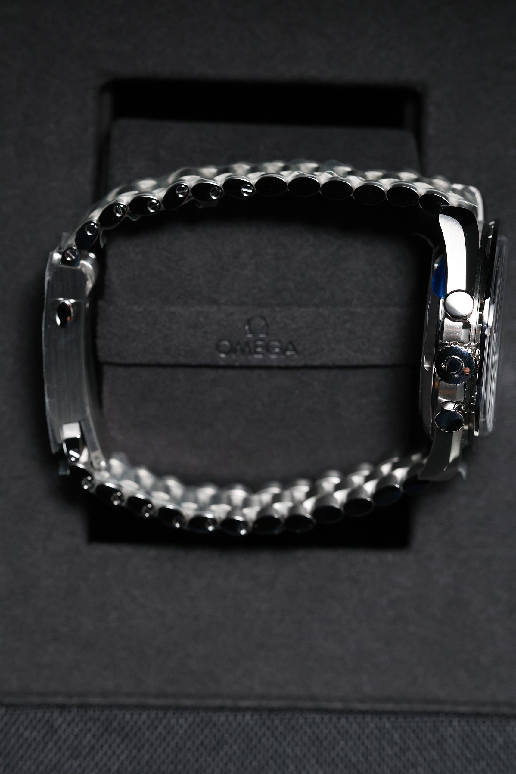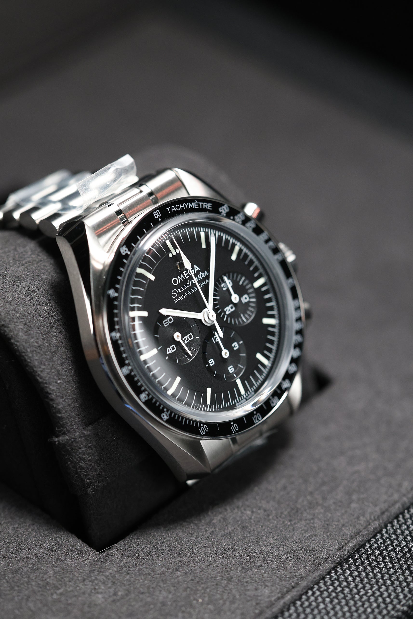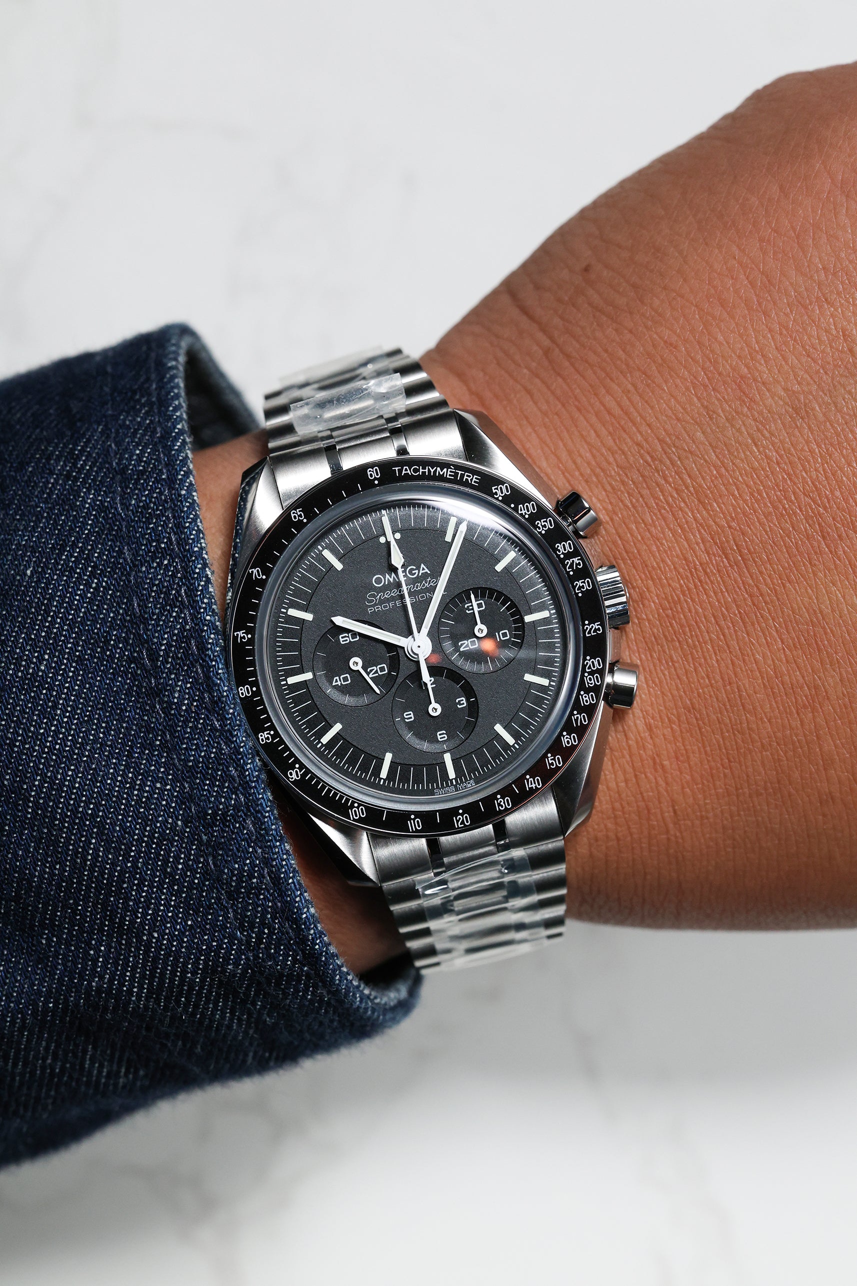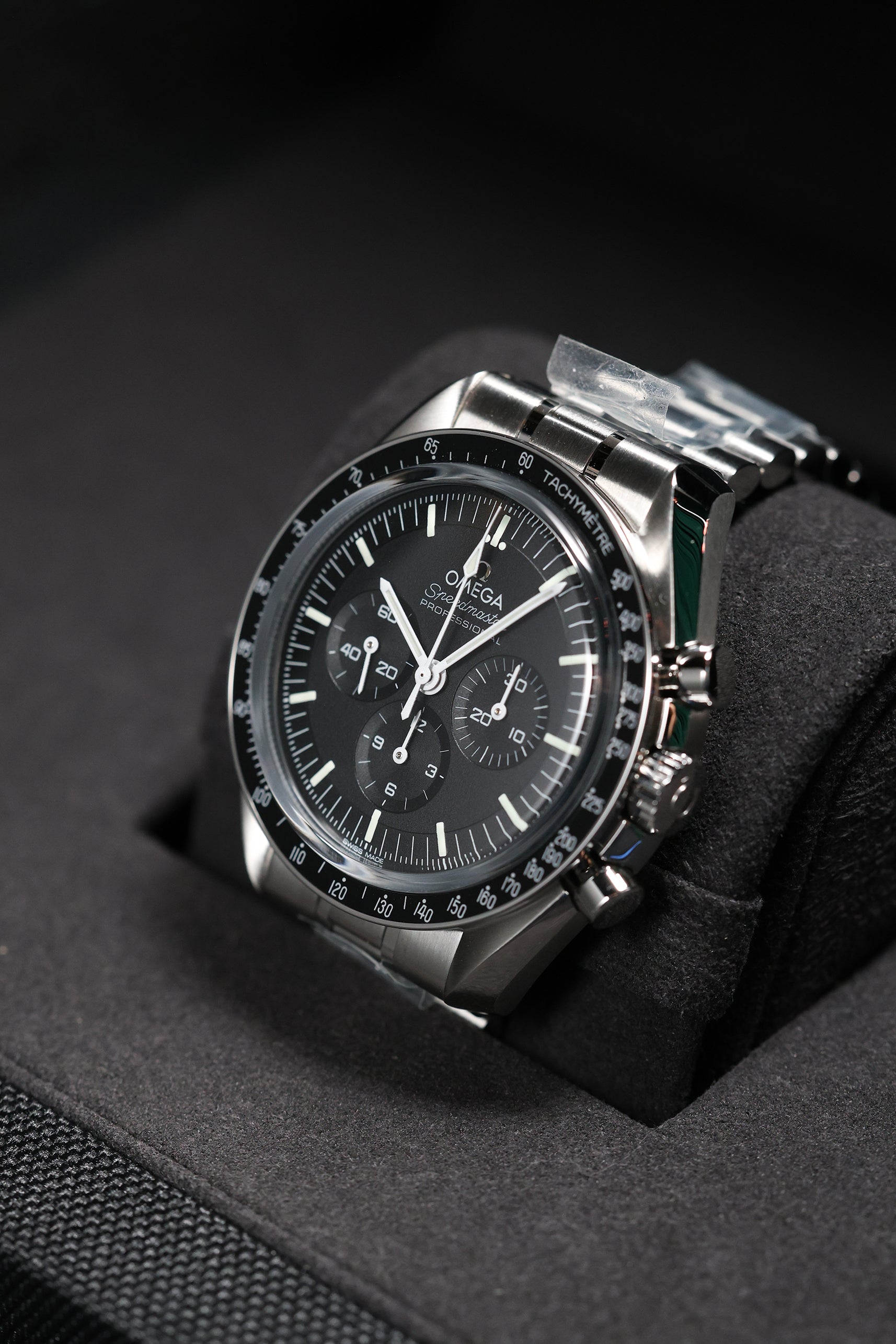 The watch’s 42mm stainless steel case faithfully adheres to the classic Moonwatch proportions, featuring Omega’s signature twisted lugs for a refined touch. A scratch-resistant sapphire crystal protects the iconic black step dial, which provides exceptional legibility with its contrasting white hour markers and hands. A black anodized aluminum tachymeter bezel, true to the "dot over 90" design, completes the iconic look, offering a bold and functional element for measuring speed. This model is paired with a robust brushed stainless steel bracelet, designed for optimal comfort and versatility across all occasions.