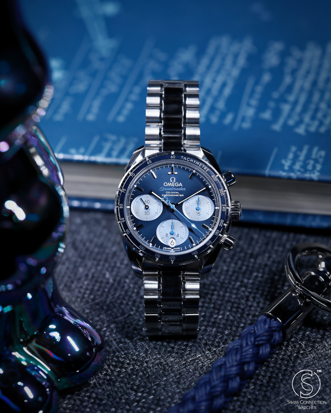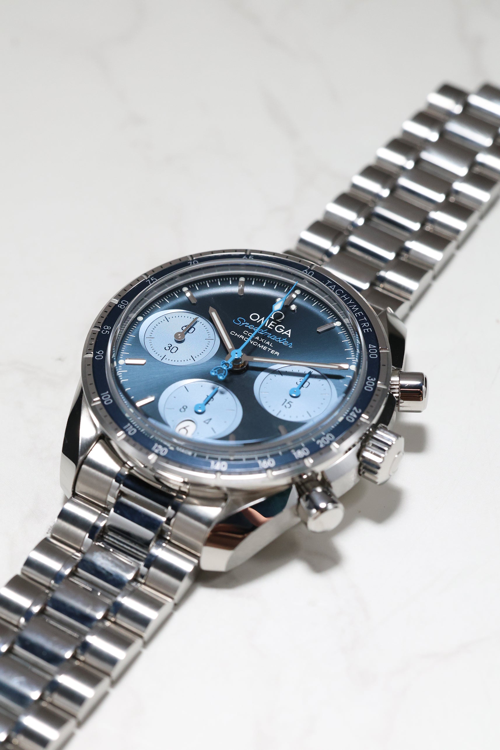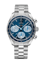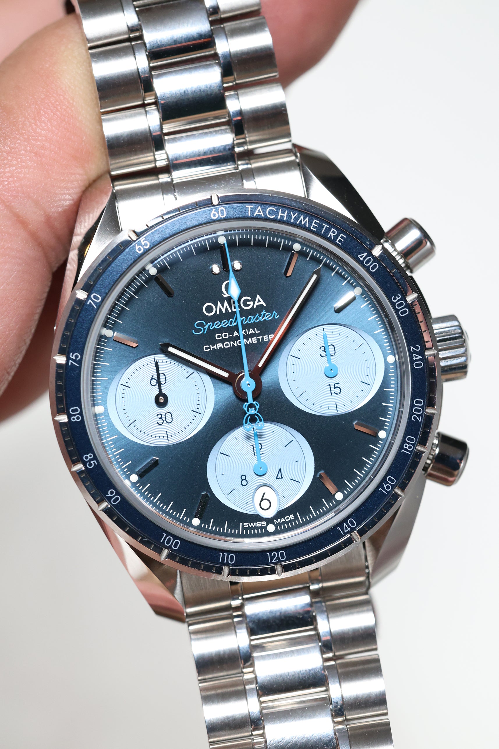 The dial is a masterful exercise in texture and color, featuring a vibrant blue sunray finish that radiates from the center. It is characterized by its unique "oval" sub-dials—a signature of the Speedmaster 38 collection—which are rendered in a lighter blue to provide a soft, "panda-style" contrast. In a delightful nod to the partnership, the central chronograph seconds hand features a blue teddy bear counterweight, a reference to the cuddly companions Orbis gives to the children they treat. This whimsical detail transforms the watch from a serious instrument into a piece with an approachable, compassionate character.