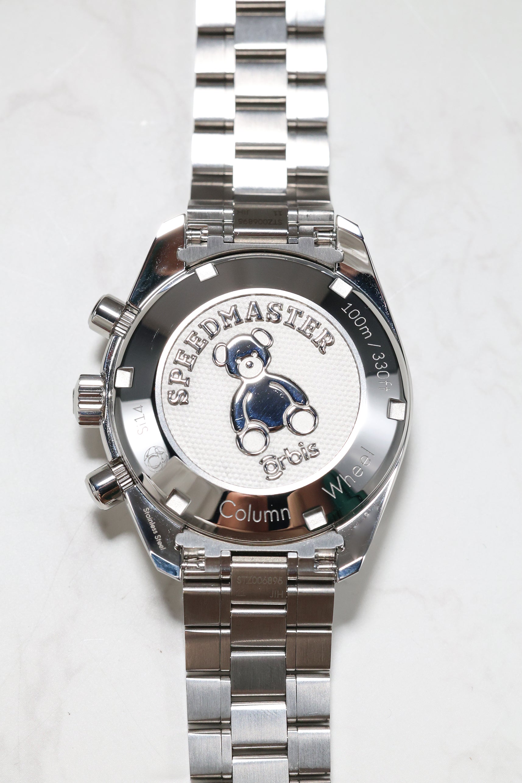 At the heart of the Orbis edition is the Omega Calibre 3330, a self-winding chronograph movement that reflects the brand’s modern mechanical standards. It features a column-wheel mechanism for precise pusher feel and Omega’s signature Co-Axial escapement for reduced friction and enhanced long-term accuracy. Equipped with a non-magnetic silicon balance spring and a 52-hour power reserve, the movement is as robust as it is refined. The caseback serves as a final tribute to the cause, featuring a specially engraved Orbis Teddy Bear logo.