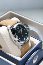 The dial is the epitome of utilitarian design: a crisp black backdrop contrasted with large white Arabic numerals and indices. True to its designation as a "Base Logo" model, the dial is clean and symmetrical, featuring no date or seconds hand. This simplicity maximizes legibility and pays direct homage to the rugged, functional nature of Panerai’s historic military tool watches. The iconic Panerai logo subtly placed at 6 o'clock ties the watch to its storied heritage.