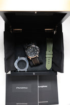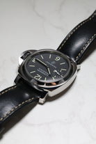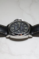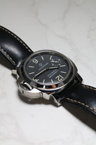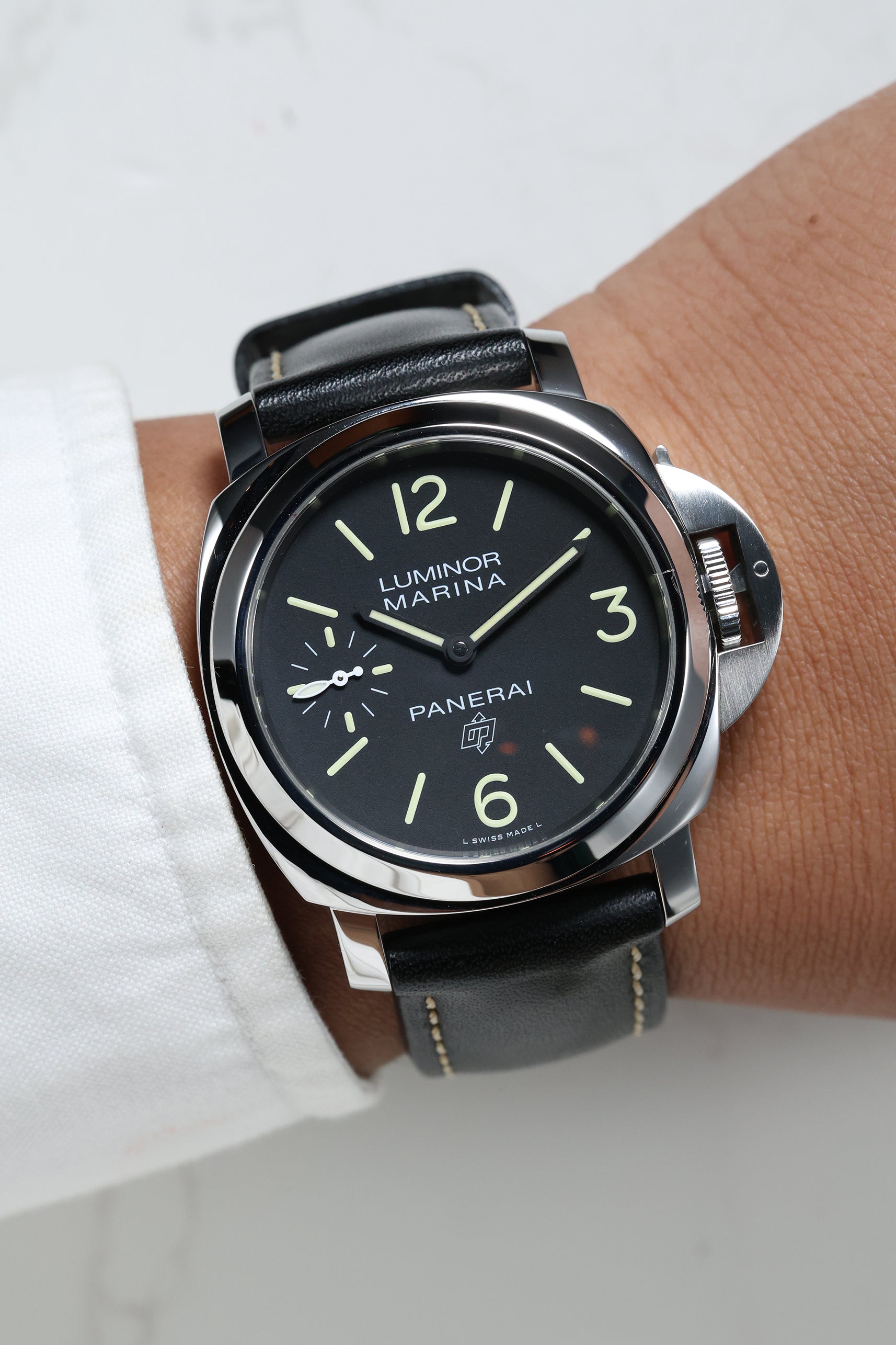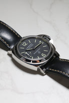 The dial is a study in purposeful minimalism. Finished in a deep matte black, it features bold luminous Arabic numerals and baton markers that ensure peerless legibility. The small seconds sub-dial at 9 o’clock provides visual balance, while the historic "OP" (Officine Panerai) logo sits proudly at 6 o’clock—a subtle yet meaningful nod to the brand's heritage as a supplier of naval instruments. This high-contrast, "Logo" dial layout is highly coveted by Paneristi for its clean aesthetic and historical continuity.