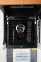 Inside beats the Calibre OP XI, a hand-wound movement based on the ultra-reliable ETA/Unitas 6497-2 architecture. A defining feature of this era is the sapphire crystal caseback, which proudly displays the movement’s "Panerai" engraved bridges, swan-neck regulator, and 56-hour power reserve. This transparency is particularly cherished by collectors today, as many modern Panerai models have transitioned to solid casebacks, hiding the mechanical heart from view. Paired with a rugged leather or rubber strap, the PAM00177 remains a definitive example of Panerai’s golden era—a bold, mechanically transparent tool watch that wears with surprising lightness.