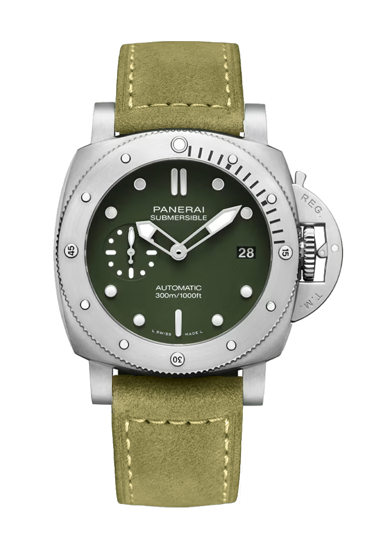 The 42mm AISI 316L brushed steel case represents a significant "sweet spot" in the Submersible lineup. It offers the commanding presence Panerai is known for but in a more versatile dimension that comfortably fits a wider variety of wrists. Its defining aesthetic is the "Verde Militare" (Military Green) dial—a matte, olive-toned surface that evokes the camouflage and equipment of elite naval units. This is framed by a unidirectional rotating bezel with a graduated scale, allowing for precise tracking of immersion times. The iconic Crown Guard ensures a hermetic seal, contributing to a professional water resistance of 300 meters.