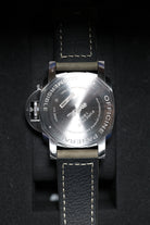 Legibility is paramount for any diver, and the PAM01055 delivers with a high-contrast layout. Large applied luminous markers and bold, skeletonized hands ensure clarity in the darkest depths, while the vibrant blue-glowing Super-LumiNova provides a sharp contrast against the green dial. A discreet date window at 3 o'clock and the signature small seconds sub-dial at 9 o'clock maintain the dial’s functional symmetry, reinforcing its identity as a technical instrument rather than a mere accessory.