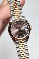 This elegant Datejust 31 captivates with its sophisticated Dark Grey sunray dial. This deep, nuanced color provides a striking and contemporary background, beautifully adorned with 10 brilliant-cut diamond hour markers. Meticulously set to catch the light, the diamonds enhance the watch's luxurious appeal. The iconic fluted bezel, crafted from radiant 18k yellow gold, frames the dial with brilliant precision, while the signature Cyclops lens magnifies the date, a hallmark of Rolex's commitment to clear utility.