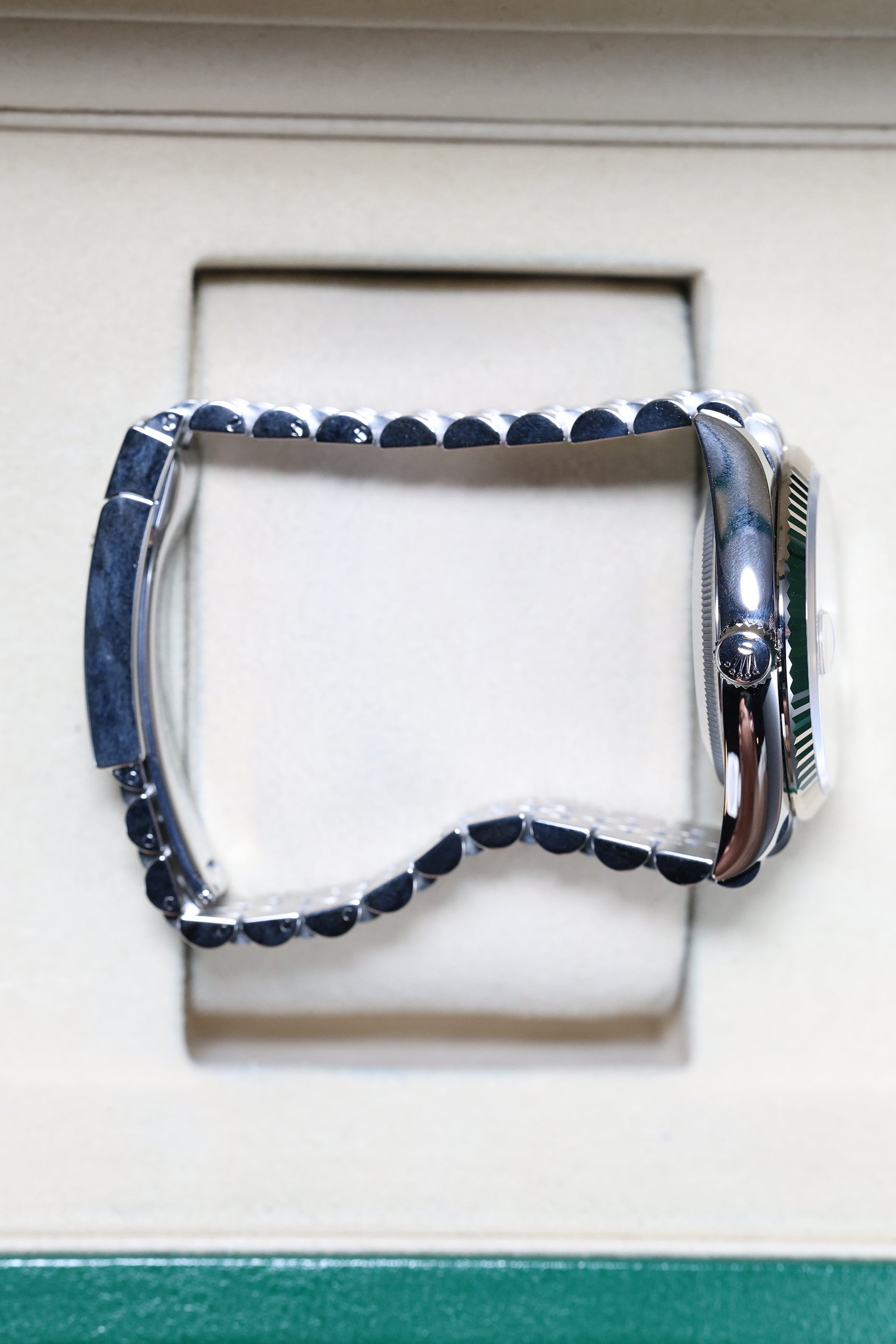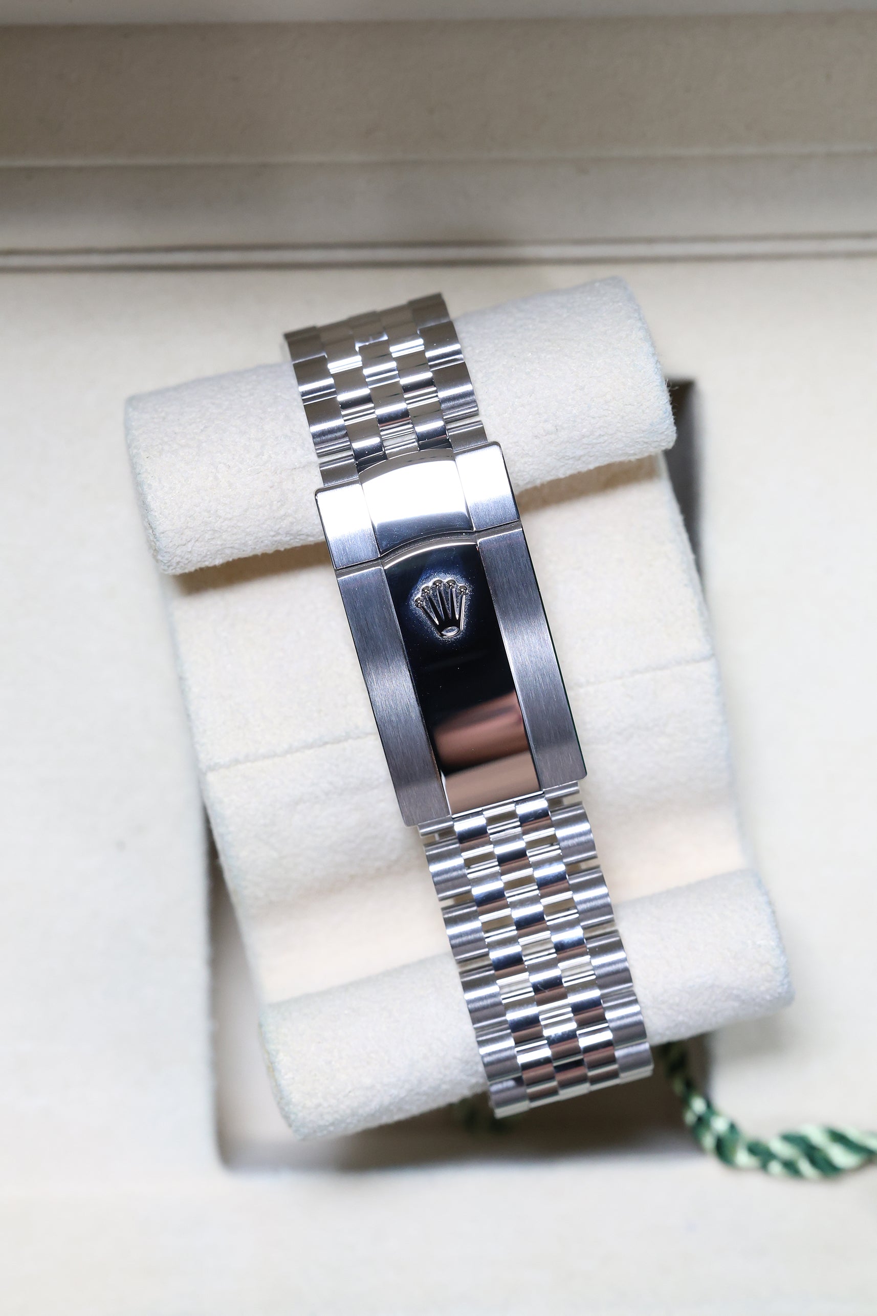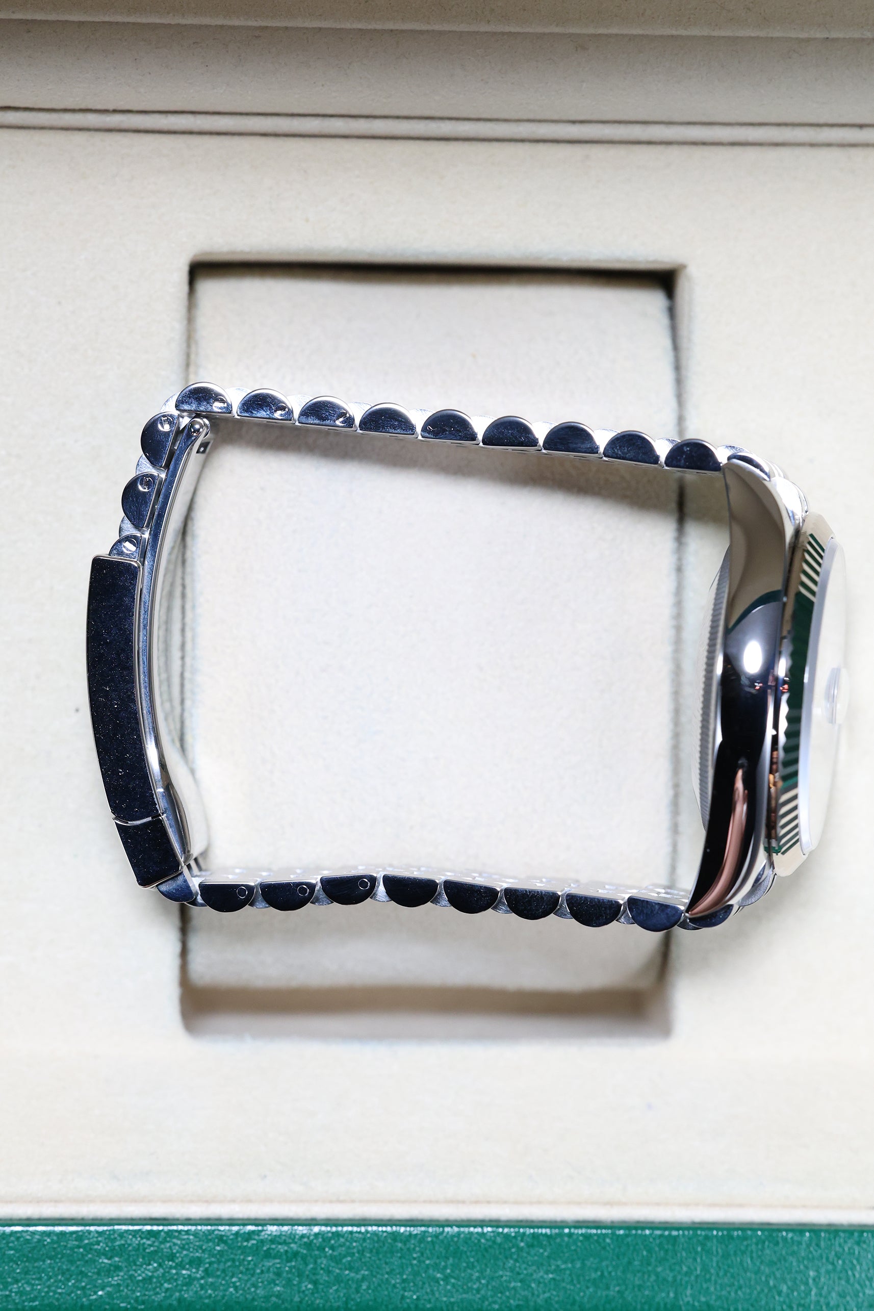 Completing the elegant aesthetic is the iconic Jubilee bracelet in Oystersteel. Renowned for its intricate five-piece link construction, the Jubilee offers a liquid-like drape and exceptional comfort, making it the preferred choice for those seeking a more refined, jewelry-like feel on the wrist. Unlike vintage models, this modern reference is equipped with the robust Oysterclasp and the Easylink comfort extension, allowing for 5mm of tool-free adjustment to ensure a perfect fit in any environment. The combination of the white gold bezel and the polished steel links creates a harmonious, luminous look that transitions effortlessly from formal galas to elevated daily wear.