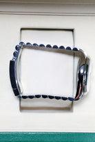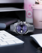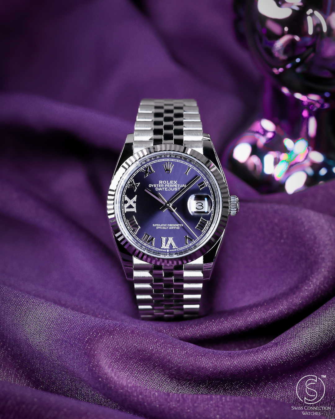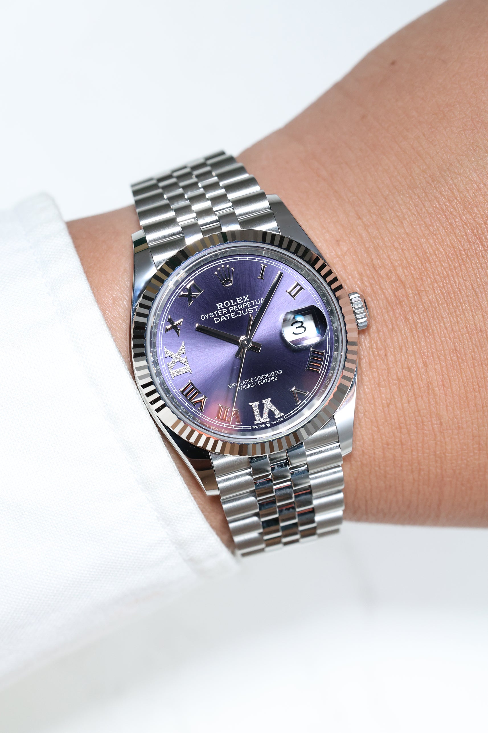 The heart of this timepiece is its captivating Aubergine dial, a deep, royal purple with a sunray finish that shifts from dark velvet to vibrant plum depending on the light. This rich backdrop serves as the perfect stage for the magnificent VI and IX Roman numerals, each meticulously set with 24 brilliant-cut diamonds. This symmetrical diamond placement provides a sophisticated sparkle that is both opulent and tastefully restrained. Framing the dial is the signature 18k white gold fluted bezel, an architectural hallmark of Rolex that brilliantly captures and reflects light, amplifying the watch’s prestigious presence.