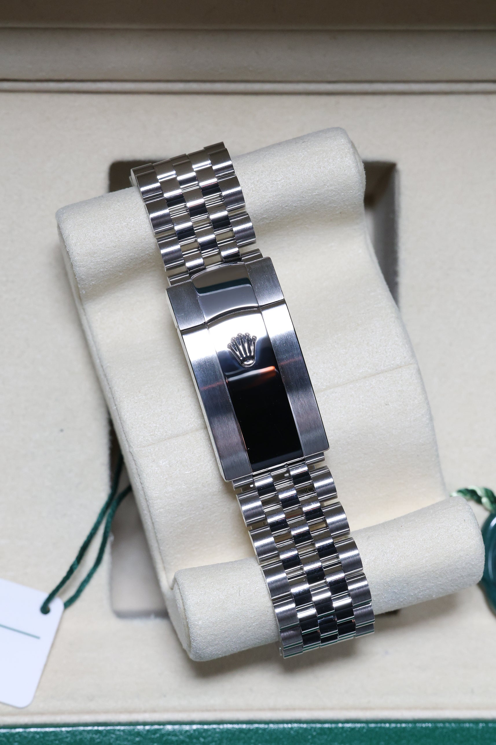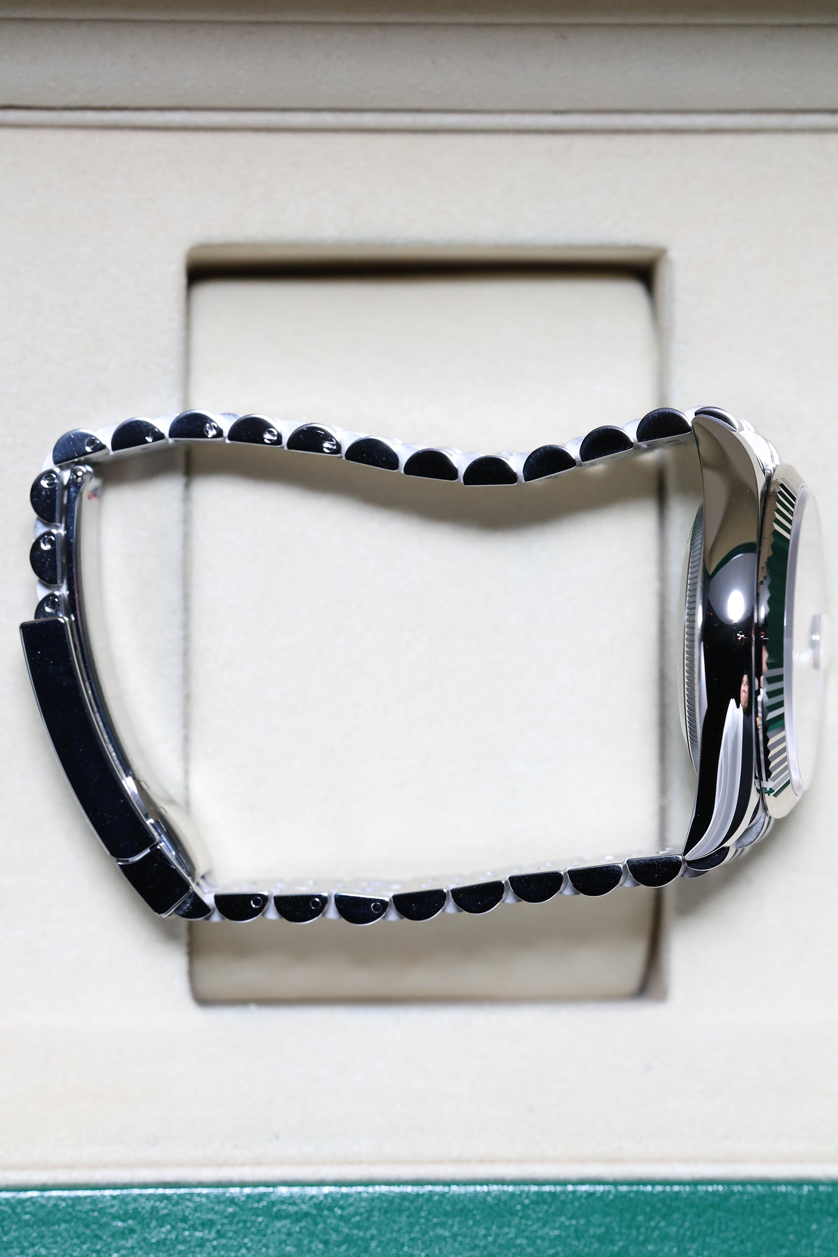 Accompanying the refined case is the legendary Jubilee bracelet in Oystersteel. Renowned for its five-piece link construction, the Jubilee provides a fluid, silk-like drape on the wrist, making it one of the most comfortable bracelets in horology. While it retains its classic, jewelry-like aesthetic, this modern reference features the robust Oysterclasp and the Easylink comfort extension, allowing the wearer to adjust the bracelet length by 5mm without tools. This combination of the white gold bezel and the Jubilee bracelet ensures the watch transitions seamlessly from formal evening wear to a sophisticated daily staple.