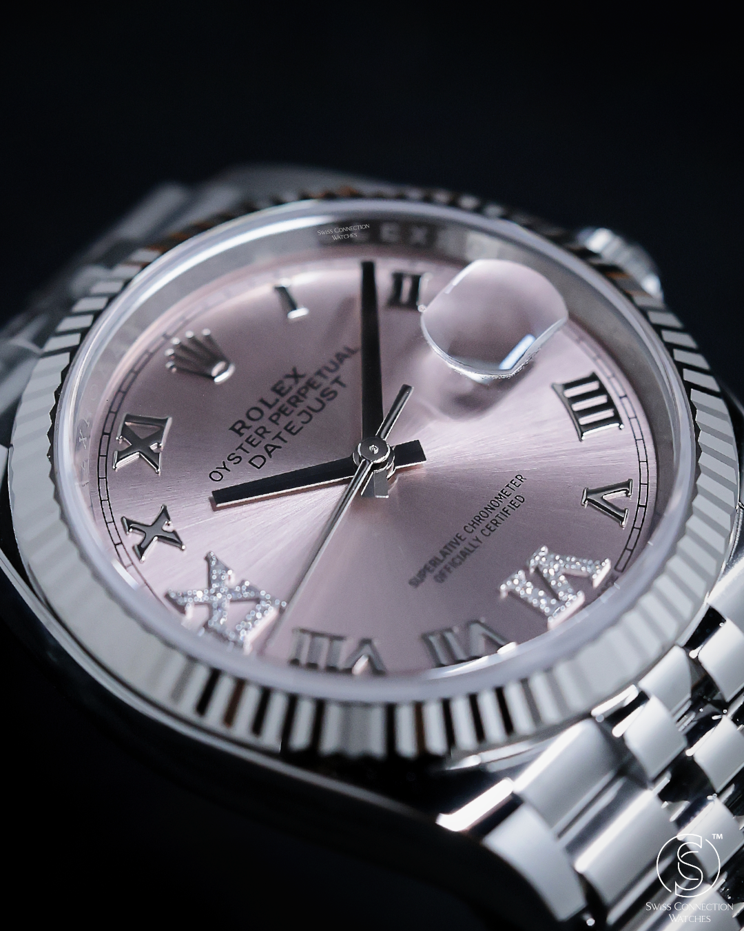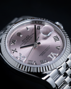The centerpiece of this timepiece is its delicate and radiant pink sunray dial, a hue that brings a soft, feminine, yet distinctly modern energy to the classic Datejust design. This elegant backdrop is elevated by the magnificent VI and IX Roman numerals, each meticulously set with 24 brilliant-cut diamonds. This symmetrical gem-setting provides a captivating play of light, offering a luxurious sparkle that is perfectly framed by the light-reflecting facets of the fluted bezel. The iconic Cyclops lens at 3 o'clock completes the dial, ensuring the date remains as legible as it is iconic.