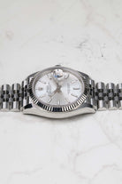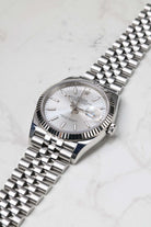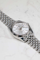 While the Datejust is available in a kaleidoscope of colors, this specific configuration features the Silver Sunray dial. This tonal, monochromatic choice offers an "executive" elegance that is both understated and timeless. The fine sunburst finish creates a dynamic play of light, allowing the dial to shift between a bright, metallic white and a deeper brushed steel hue. This luminous backdrop is punctuated by applied 18k white gold index markers, providing a clean, architectural look that is more contemporary than traditional Roman numerals. Framing the dial is the signature fluted bezel, crafted from radiant 18k white gold, which serves as the hallmark of Rolex’s "White Rolesor" aesthetic.