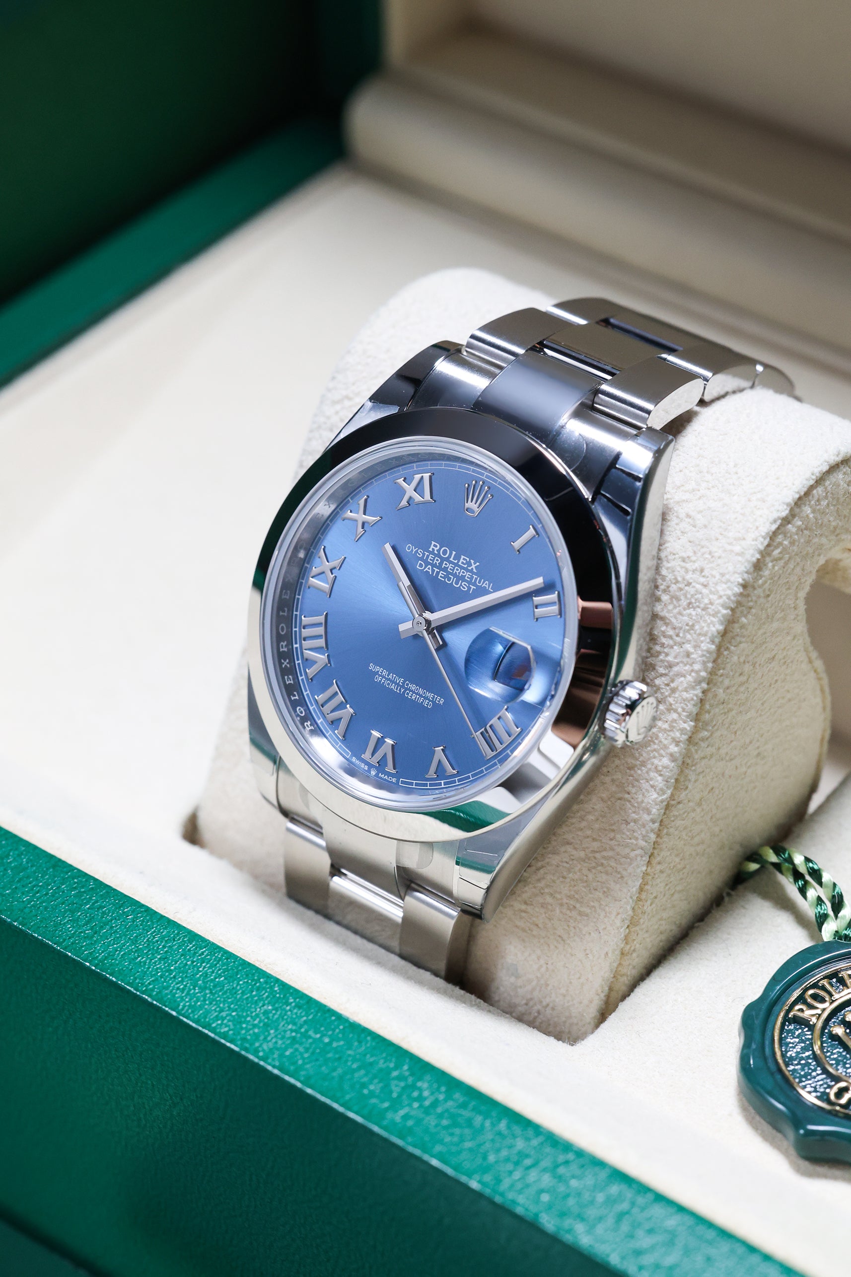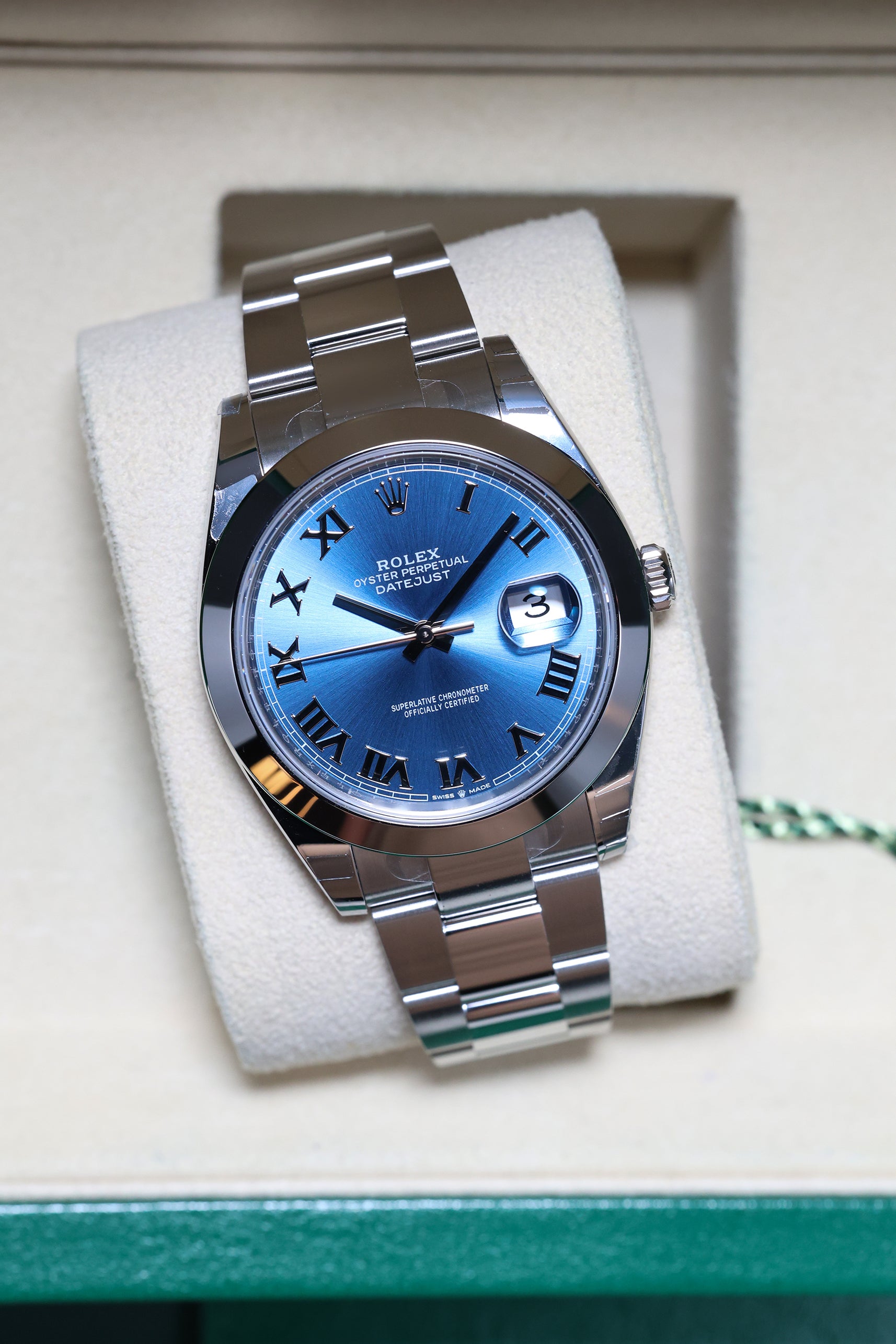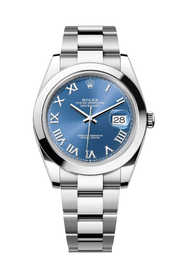 The watch’s centerpiece is the captivating Azzurro Blue dial, a vibrant and sophisticated shade that sits between traditional navy and sky blue. This sunray finish plays spectacularly with light, shifting in tone to provide a dynamic visual experience. Distinct from the standard index models, this version features polished Roman numeral markers, adding a classical, "old-world" prestige to the modern 41mm frame. The iconic Cyclops lens at 3 o'clock magnifies the date, maintaining the perfect harmony of aesthetics and utility that has defined Rolex for decades.
