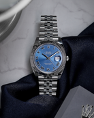 The soul of this specific configuration is the Azzurro Blue dial. Unlike the deeper, more serious "Bright Blue," Azzurro is a vibrant, sky-leaning hue that breathes an air of Mediterranean elegance into the design. The sunray finish allows the color to shift from a brilliant electric blue to a soft metallic azure depending on the light. Adorning the dial are applied 18k white gold Roman numerals, which lend the watch a "stately" and sophisticated character compared to the sportier index markers. Framing this vibrant face is the signature 18k white gold fluted bezel, a masterclass in light reflection that ensures the watch is recognizable from across any room.