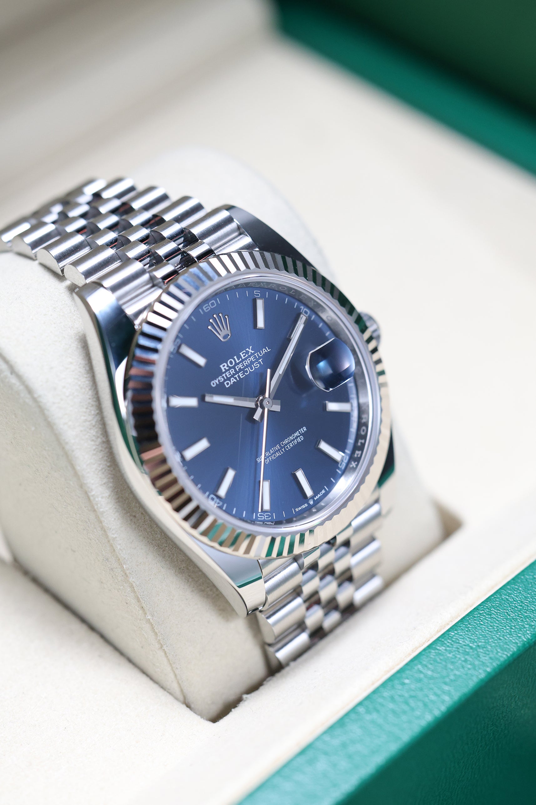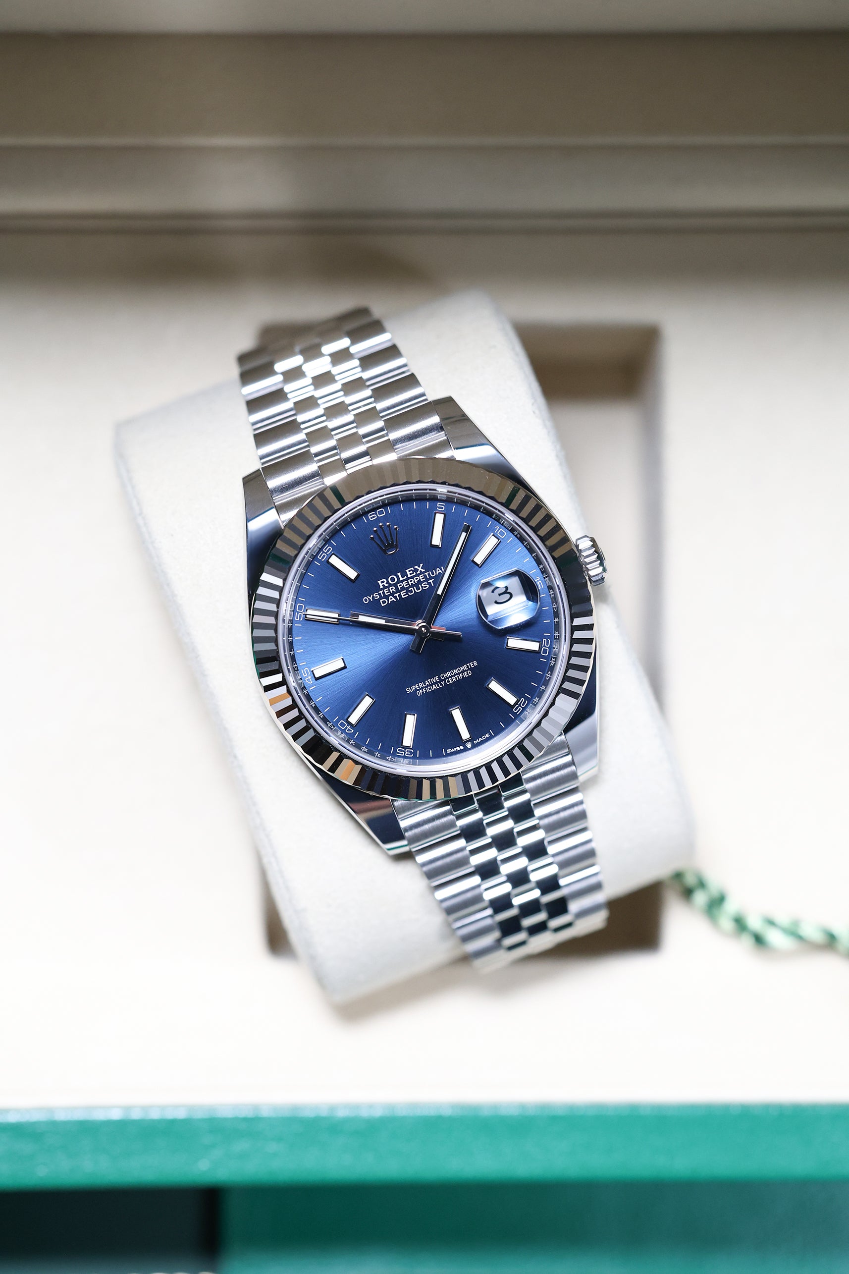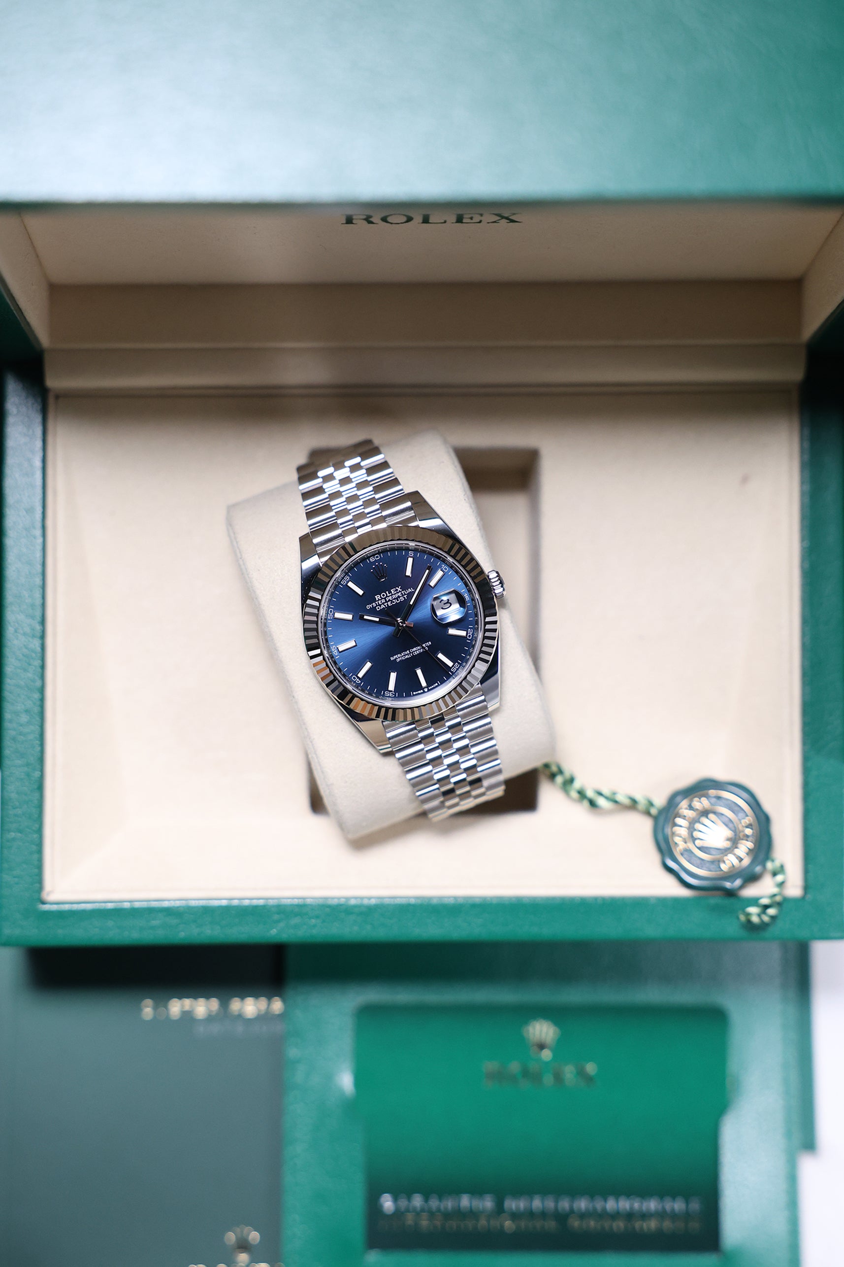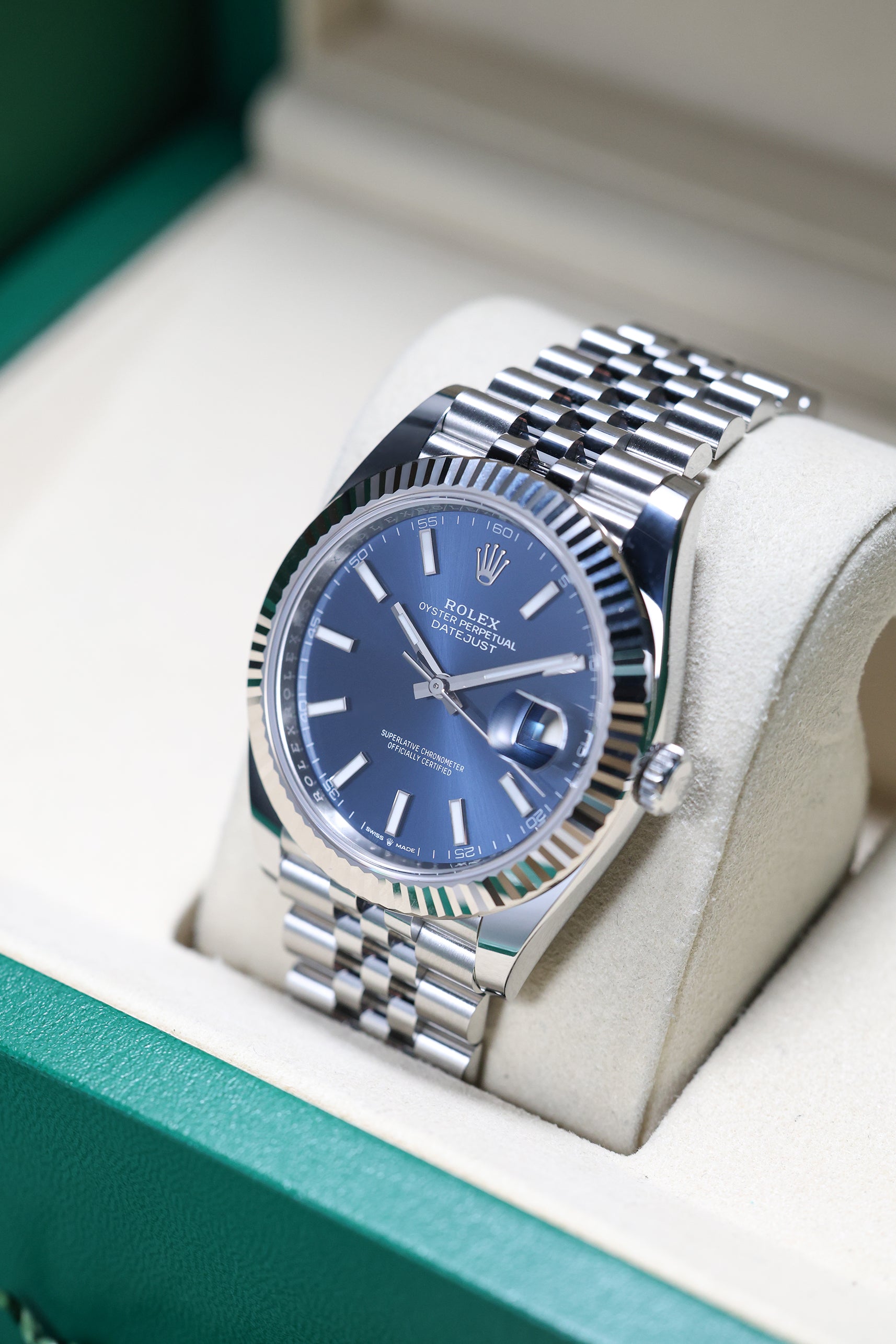 Powering this exquisite timepiece is Rolex's latest generation in-house automatic movement, boasting an impressive 70-hour power reserve. This mechanism ensures superior precision, durability, and reliability, all certified as a Superlative Chronometer. With a robust 100-meter water resistance, the Datejust 41mm in Blue Index on Jubilee is not merely a refined dress watch; it's a dependable and robust everyday companion, perfectly balancing cherished tradition with modern innovation and a vibrant personality.