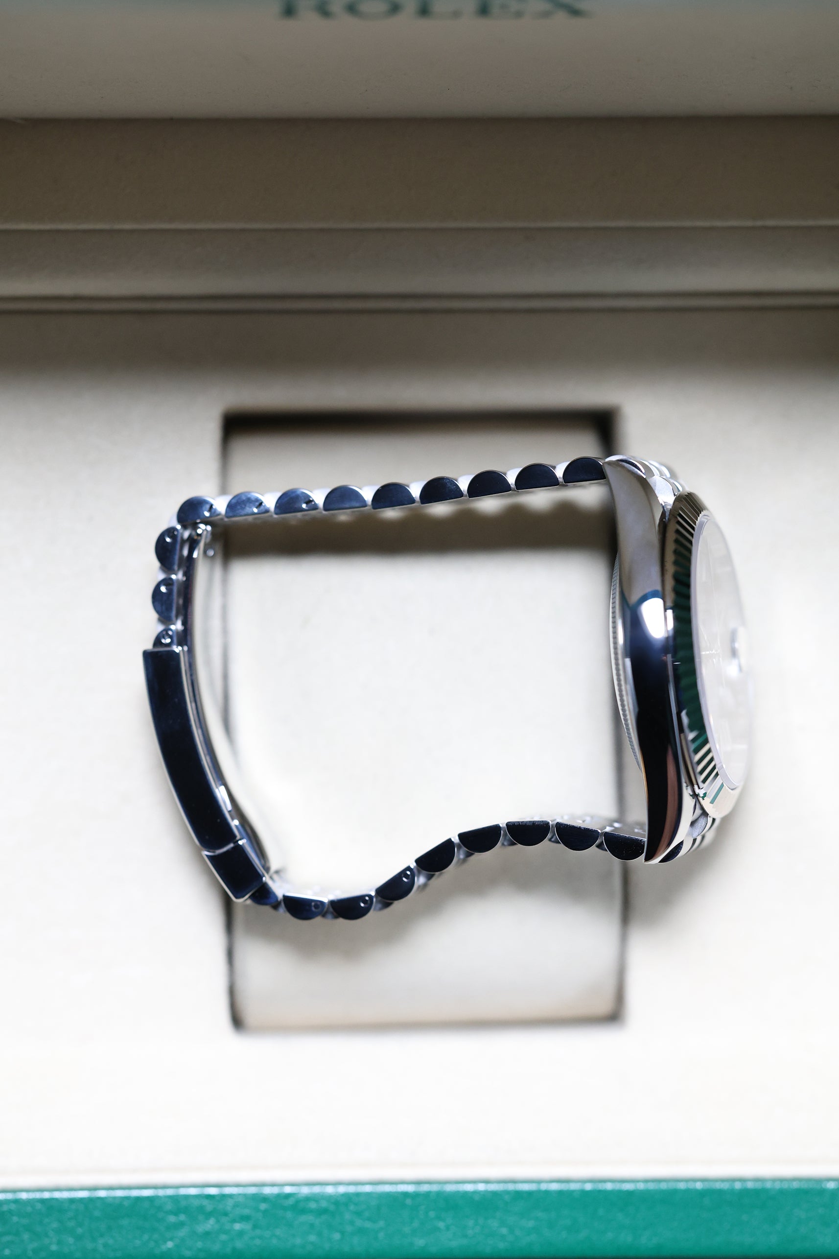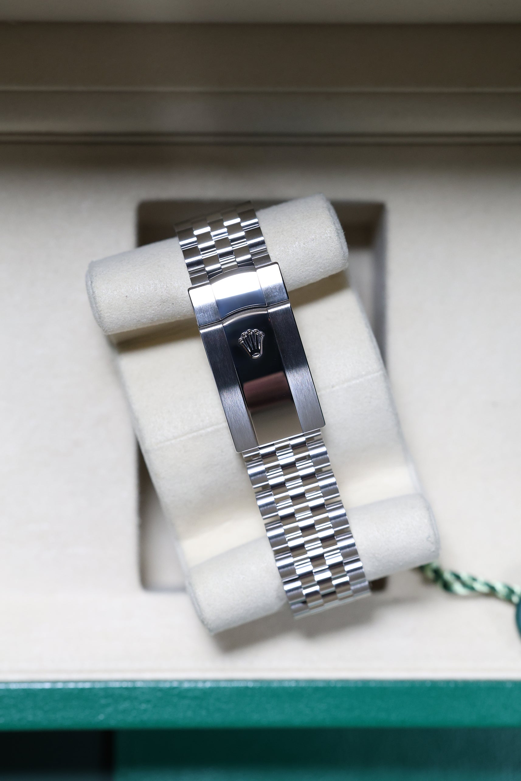 The 41mm Oystersteel case offers a commanding yet balanced presence on the wrist. It's paired with the distinguished Jubilee bracelet, renowned for its intricate five-piece links that provide exceptional comfort and a refined drape. This combination of the fluted bezel and Jubilee bracelet is a classic pairing that exudes an air of understated luxury, making the watch equally suited for formal occasions and refined daily wear.