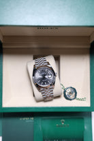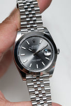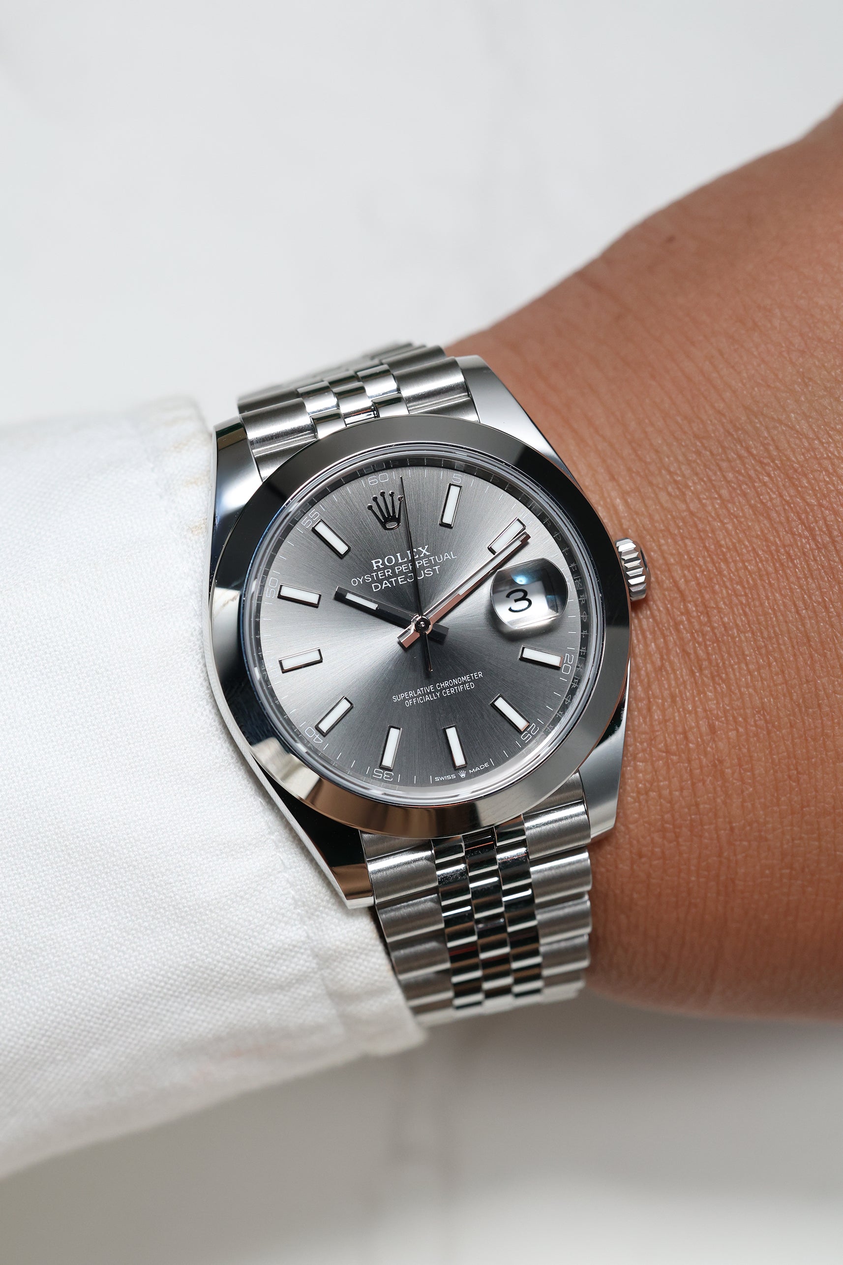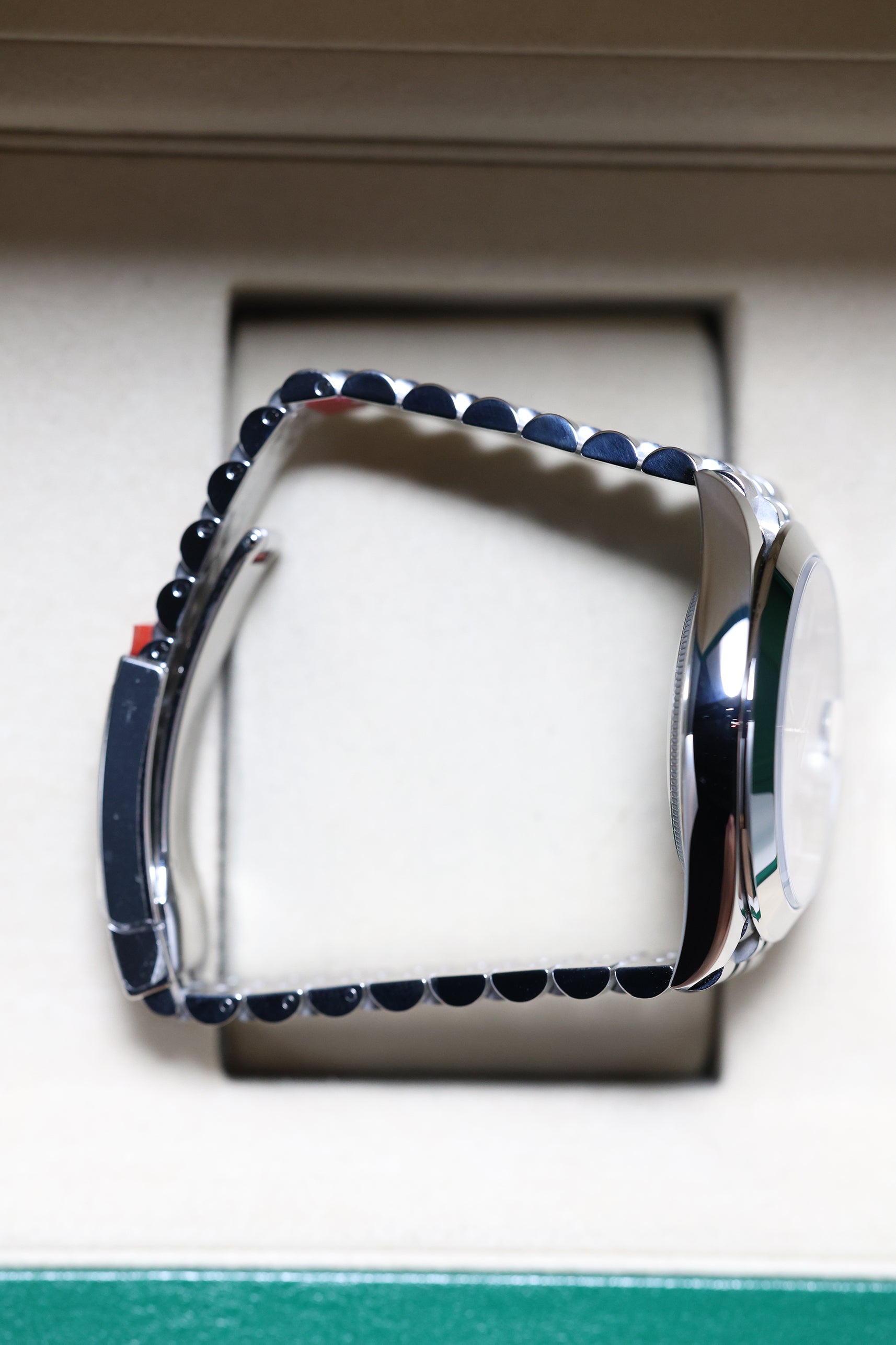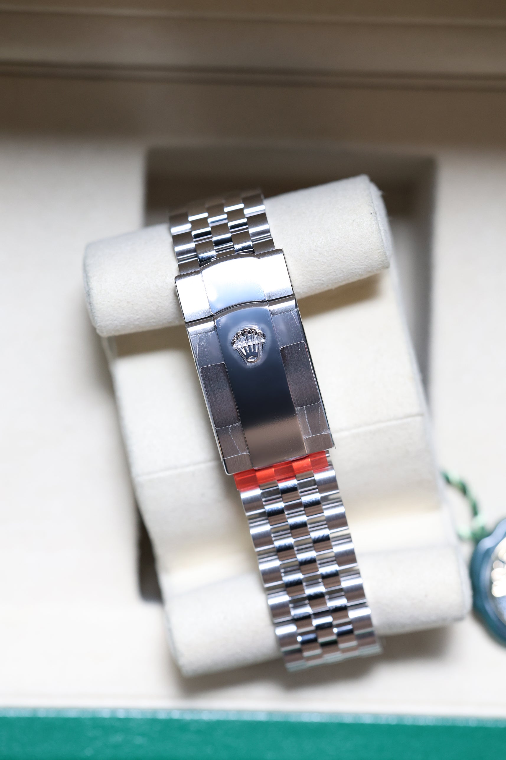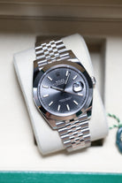 This Datejust 41mm is secured by the iconic Jubilee bracelet, renowned for its comfortable five-piece links and refined drape on the wrist. While the smooth bezel and index dial offer a minimalist elegance, the intricate Jubilee bracelet adds a touch of classic sophistication, appealing to those who desire a balanced blend of modernity and traditional Rolex refinement.