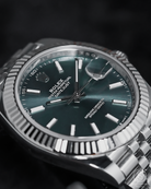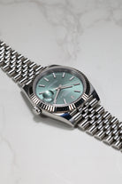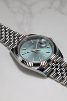 This specific Datejust 41 captivates with its highly sought-after Mint Green dial. This contemporary hue, celebrated for its subtle yet vibrant character, is finished with a stunning sunray effect, allowing the color to shift beautifully with the light. The dial is elegantly marked by crisp luminous index hour markers that ensure superb clarity. The iconic fluted bezel frames the dial with brilliant precision, while the signature Cyclops lens magnifies the date, a hallmark of Rolex's commitment to both aesthetics and clear utility.