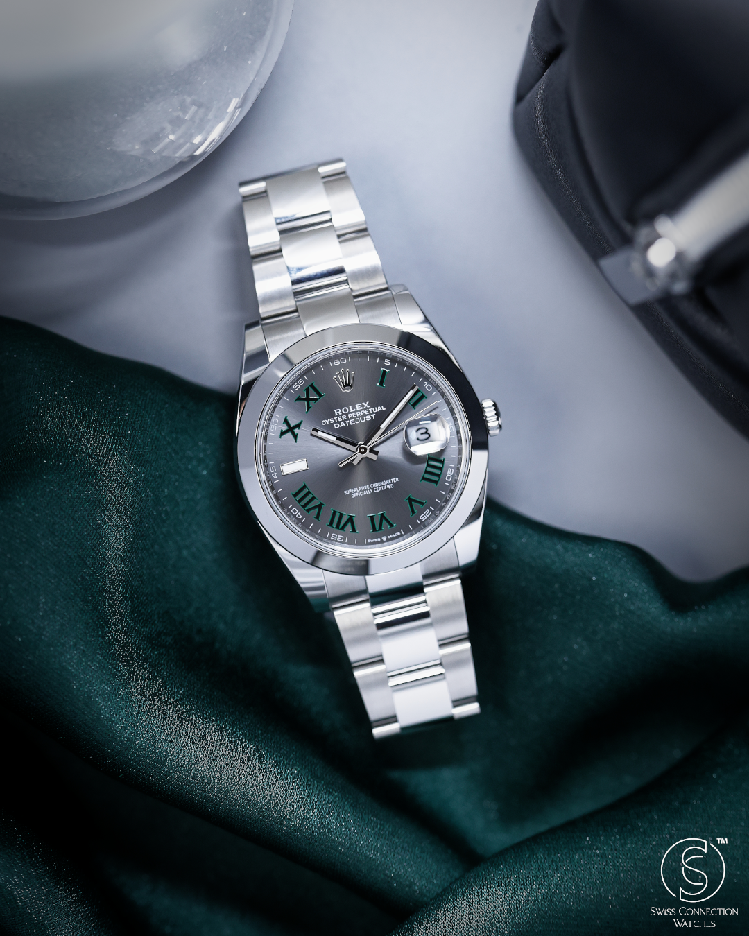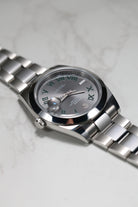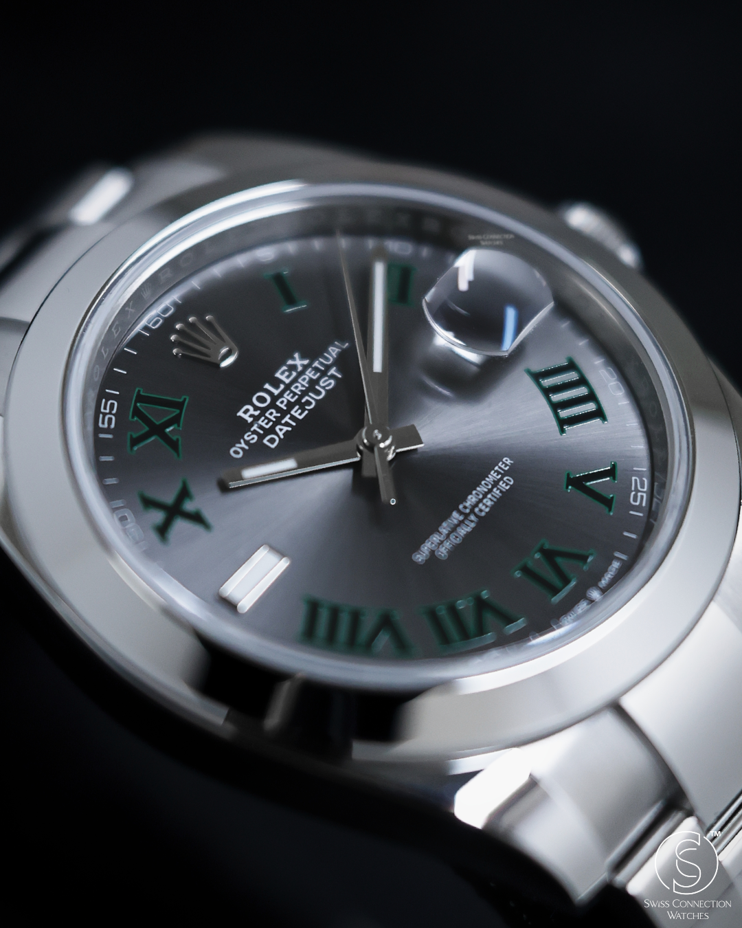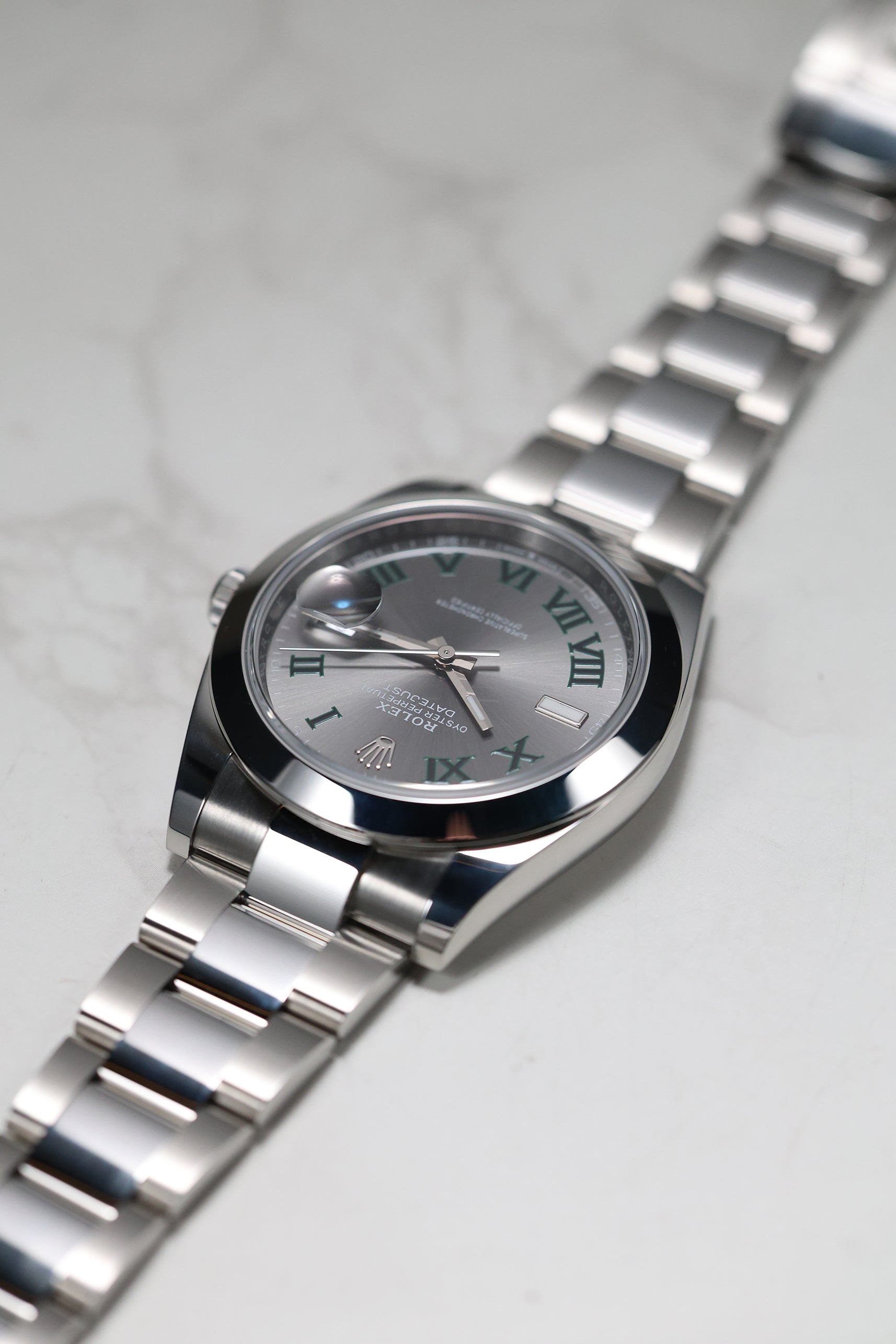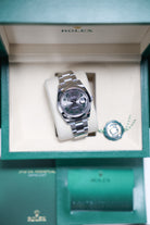 The watch's centerpiece is the now-iconic "Wimbledon" dial, an instantly recognizable feature. Its slate grey sunray finish provides a sophisticated and unique backdrop for the bold green Roman numerals that pay tribute to Rolex's long-standing heritage with the tennis championship. The dial’s monochromatic color scheme is elegantly broken up by the striking green markers, giving the watch a distinguished and captivating personality.