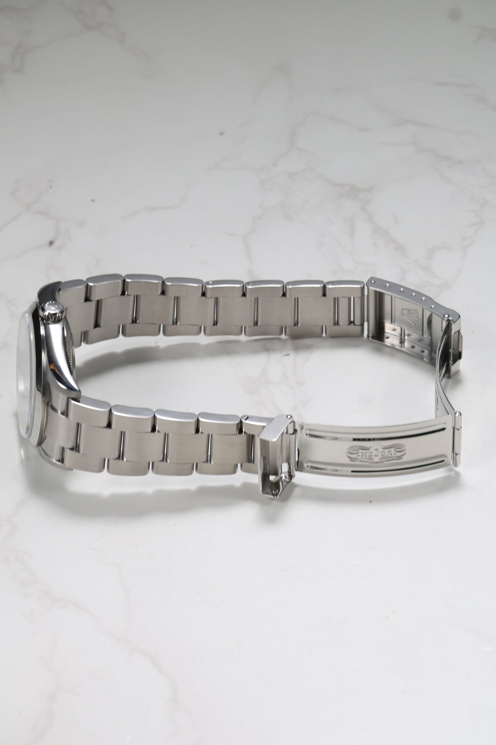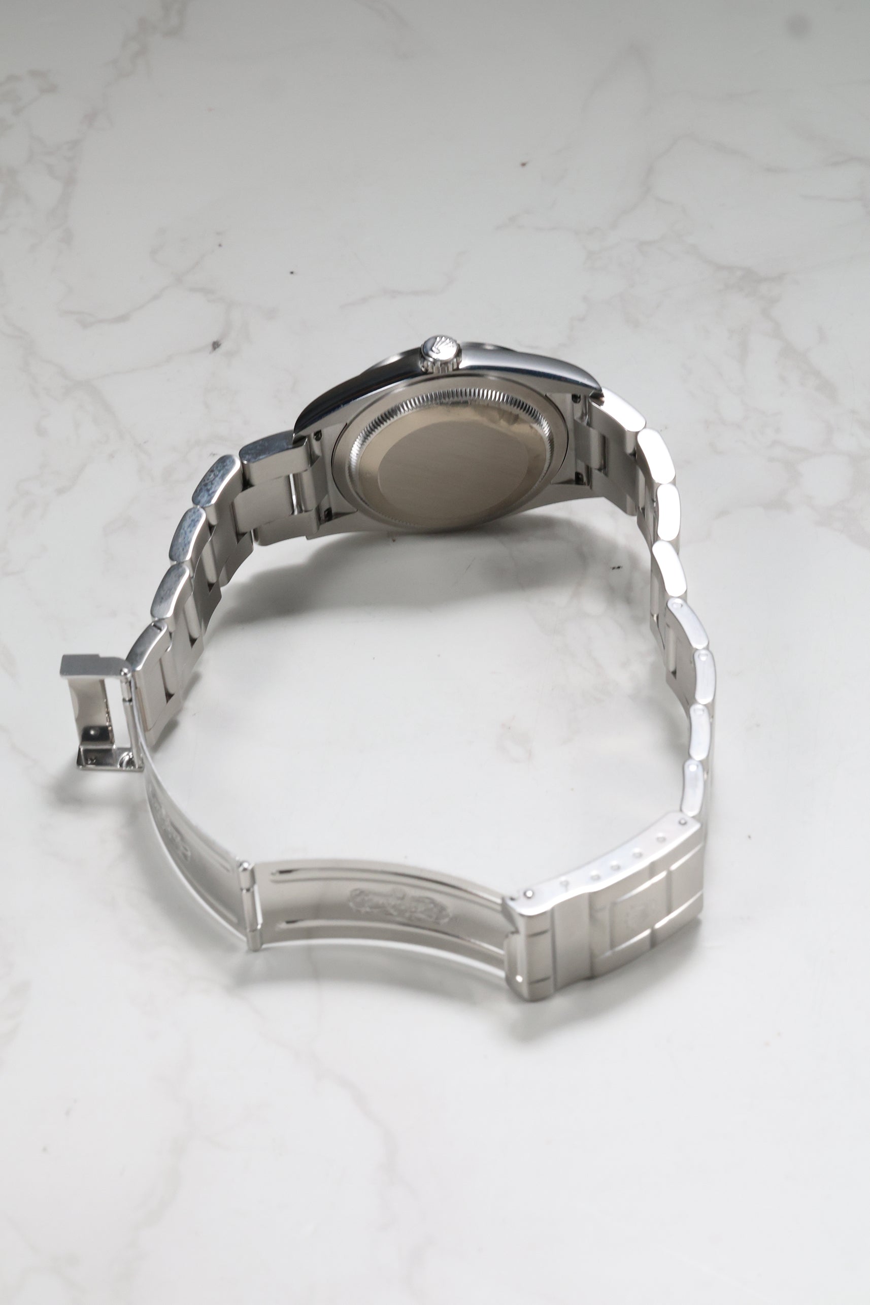 Powering the 114270 is the robust and highly reliable Rolex Calibre 3130, an in-house automatic movement certified as a Superlative Chronometer. This movement ensures exceptional precision and durability, living up to Rolex's stringent performance standards. The watch is completed by the solid Oyster bracelet and secured by the Oysterlock clasp, providing a rugged yet refined appeal.