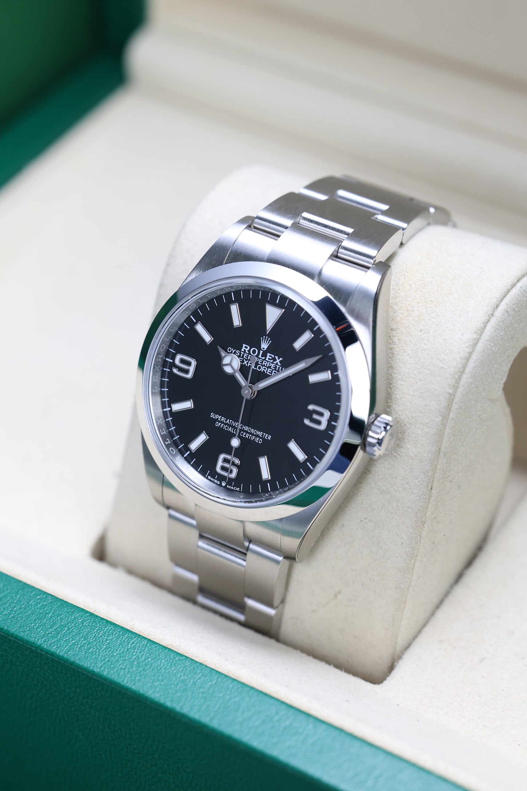 Beneath the surface, the 124270 is powered by Rolex’s latest-generation Calibre 3230 automatic movement. This state-of-the-art engine features the highly efficient Chronergy escapement and a Parachrom hairspring for superior resistance to shocks and temperature variations. Certified as a Superlative Chronometer, the movement delivers a robust 70-hour power reserve, ensuring the watch is not just aesthetically pleasing but built for sustained performance in the harshest conditions.