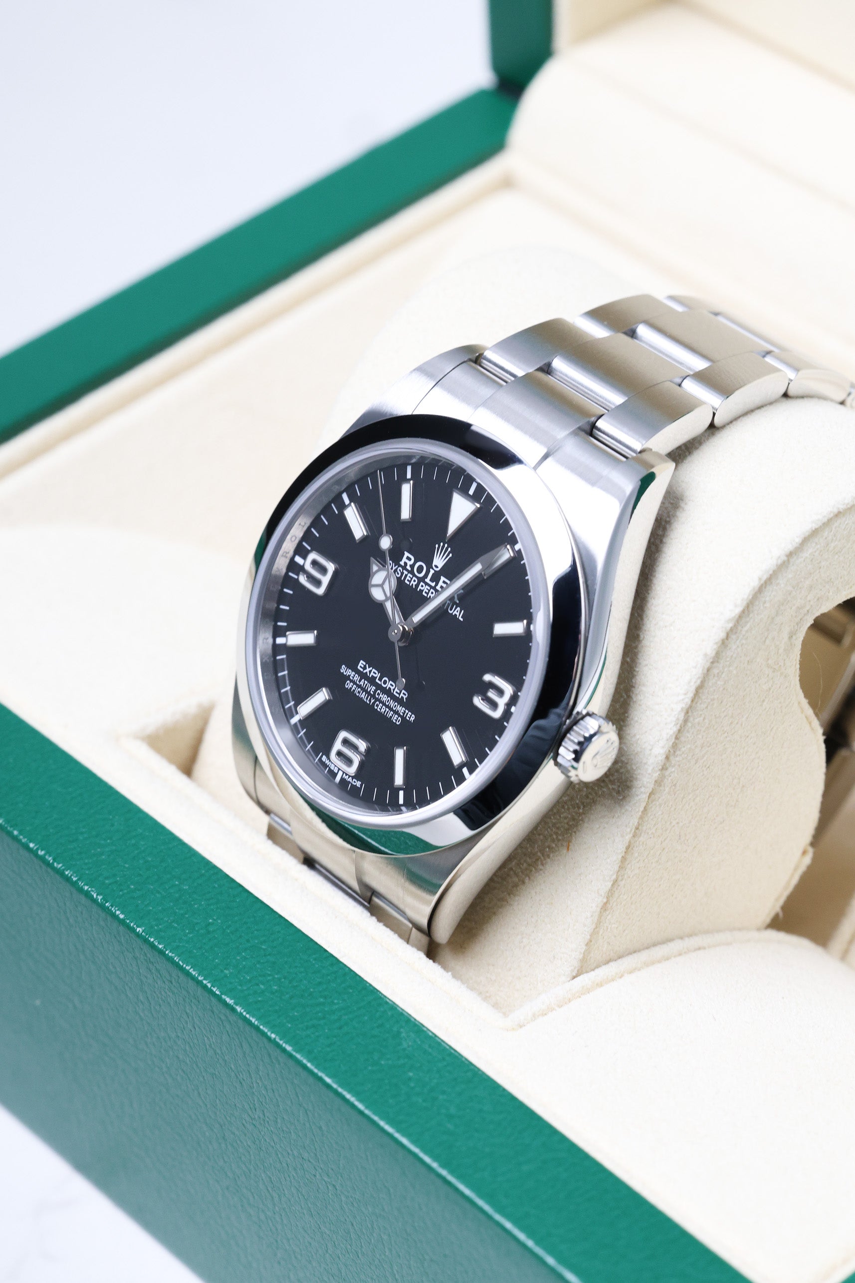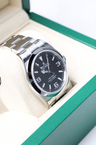 Powering the 214270 is the dependable Rolex Calibre 3132, a self-winding mechanical movement that delivers unparalleled precision and reliability. This robust caliber features a Parachrom hairspring and high-performance Paraflex shock absorbers, significantly enhancing its resistance to shocks and magnetic fields. With a reliable 48-hour power reserve, the Explorer 214270 is ready for any challenge, whether scaling urban landscapes or navigating untamed wilderness. The 2019 Explorer 214270 is particularly celebrated as one of the final iterations of the 39mm size before the reintroduction of the 36mm Explorer in 2021, making it a highly sought-after model for collectors who appreciate its modernized proportions while honoring the profound legacy of this iconic Rolex timepiece.