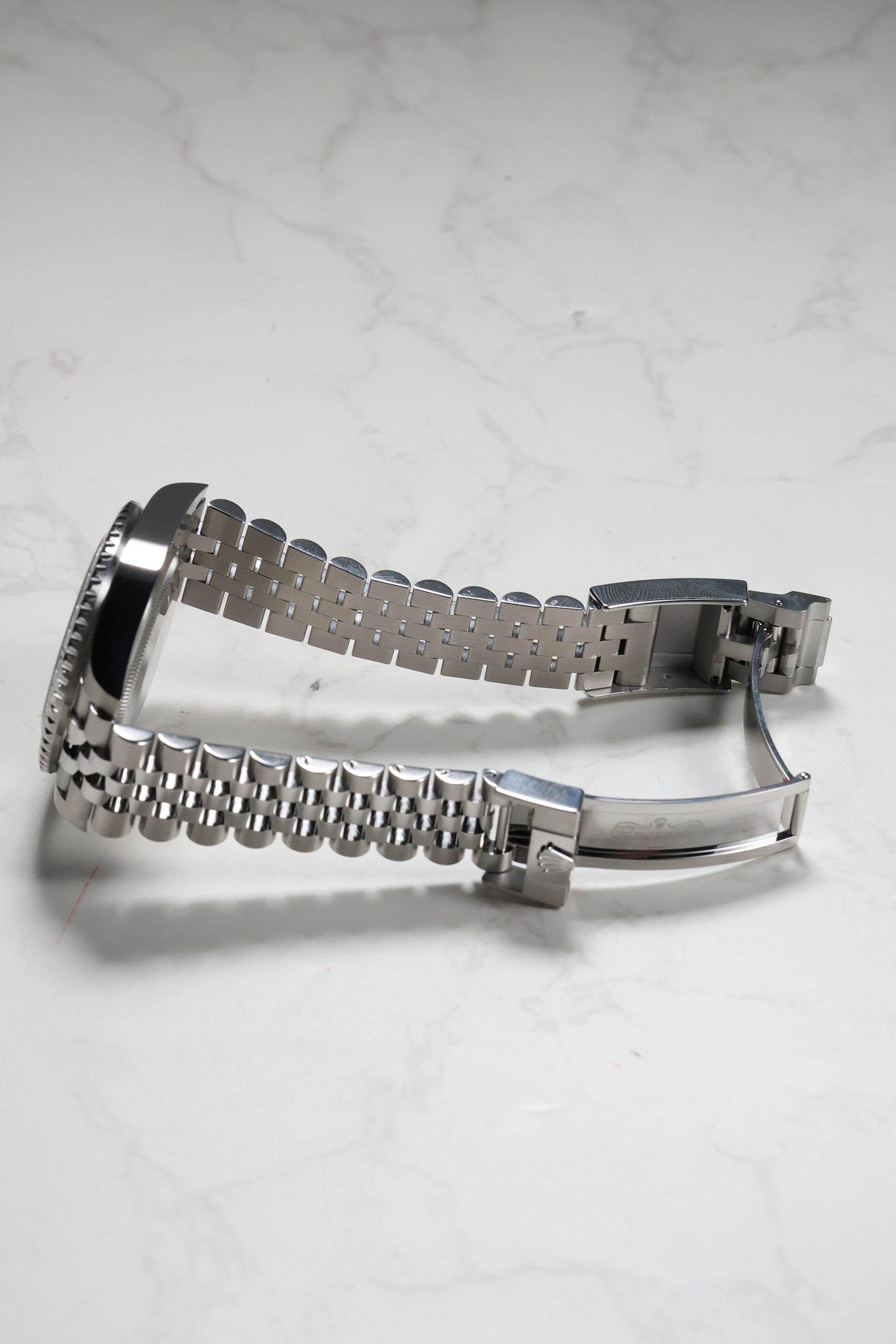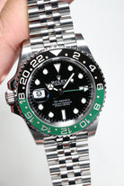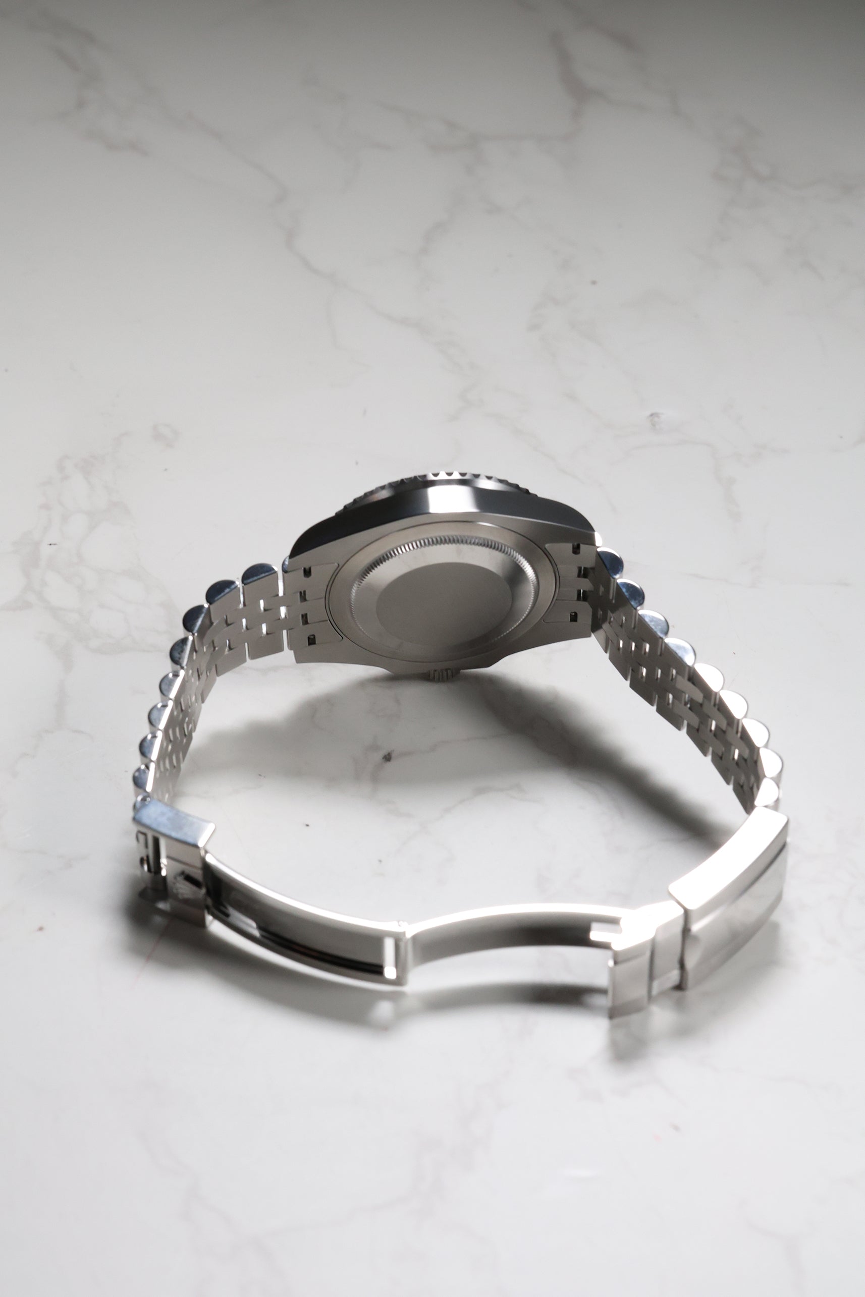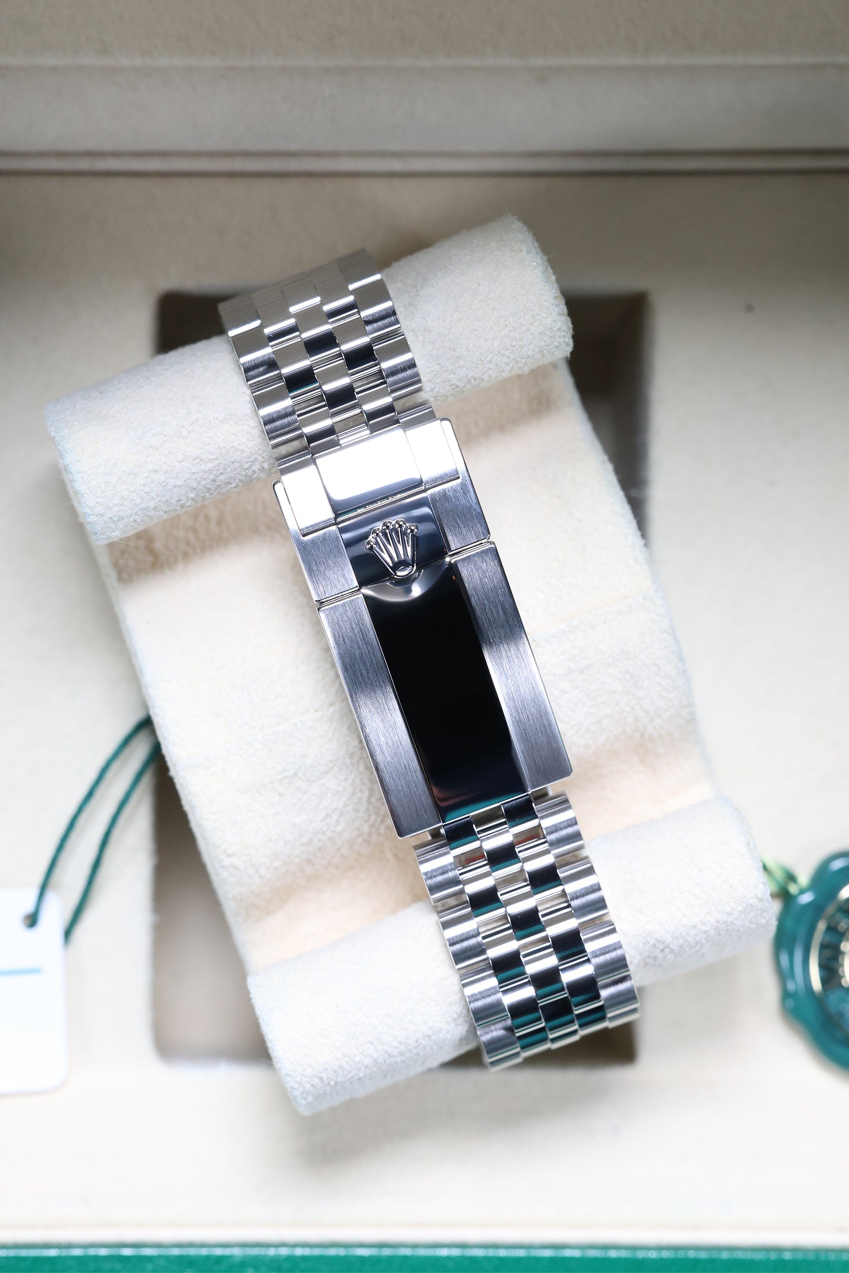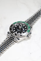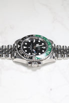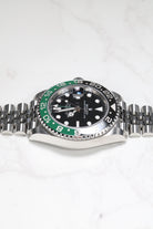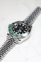 Designed with the elegant Jubilee bracelet, the "Sprite" beautifully marries rugged functionality with an undeniable air of sophistication. This five-link Jubilee, a hallmark of Rolex's lineup, enhances wrist comfort and adds a refined, dressier look to this unique GMT-Master II. Equipped with the secure Oysterlock clasp and the convenient Easylink extension system, the bracelet ensures a perfect fit and on-the-go adjustability, making it ideal for everything from long-haul travel to daily wear.