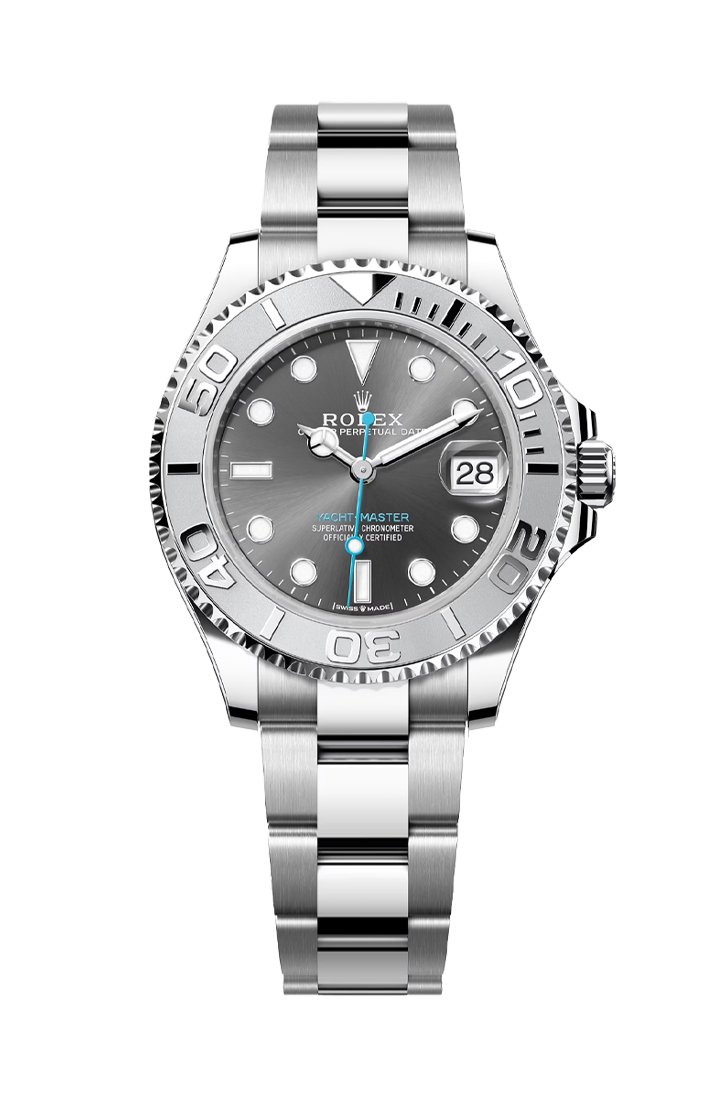 What makes this Yacht-Master truly stand out is its Rolesium construction, a harmonious blend of robust Oystersteel and the soft, elegant glow of platinum. The rhodium sunburst dial shifts subtly under different lighting, transitioning from a deep metallic gray to a bright silver sheen. A vibrant touch of personality is added by the aqua blue seconds hand and matching "YACHT-MASTER" text, offering a playful yet tasteful contrast. The platinum bezel, with its raised numerals and sandblasted finish, adds a layer of quiet luxury, differentiating it from the more tool-like ceramic bezels found on other Rolex models.