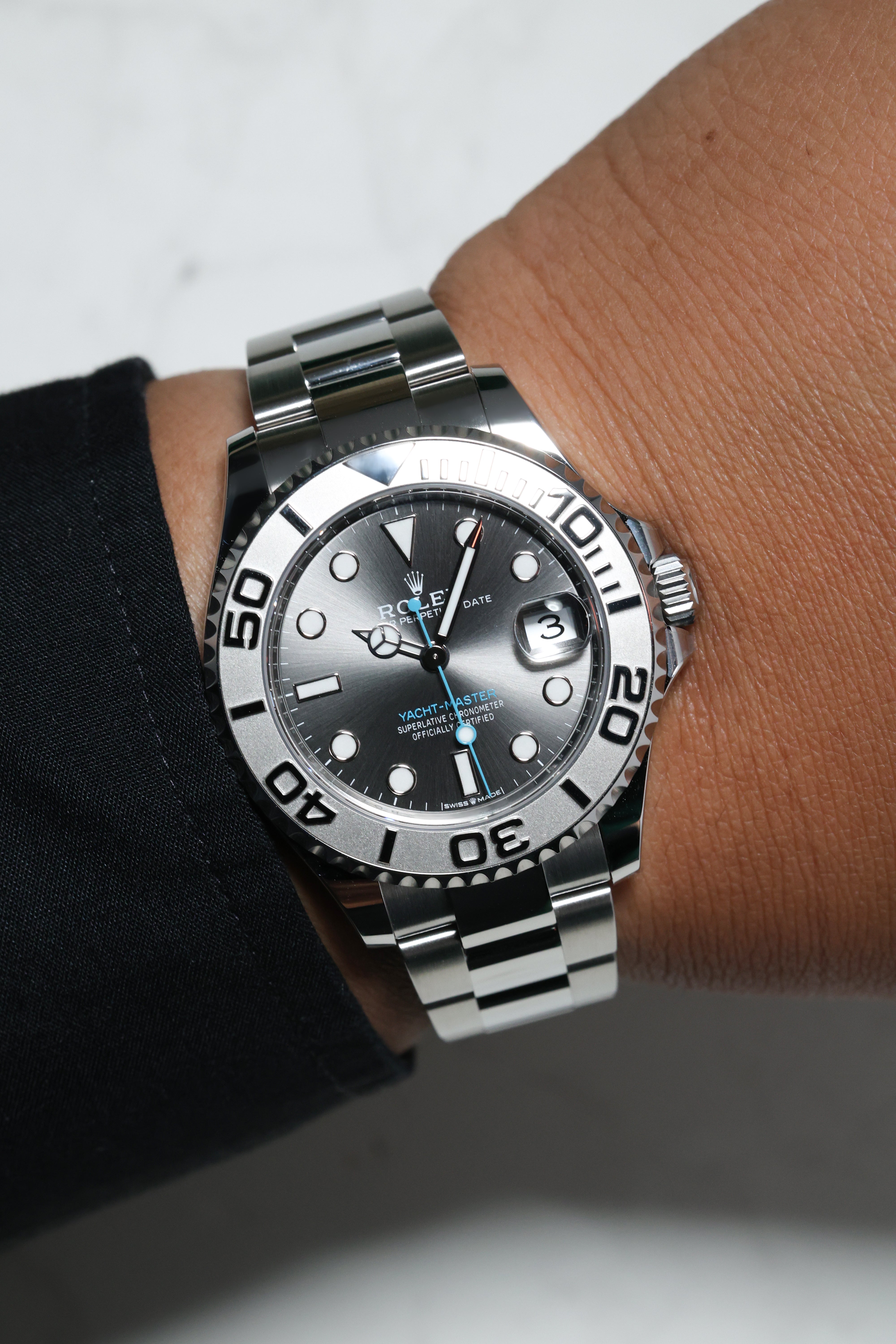 On the wrist, the 37mm case makes the watch feel incredibly wearable, particularly for those who prefer a more compact profile. It wears smaller and lighter than a Submariner but still carries the signature robustness of a Rolex sports watch. The polished center links of the Oyster bracelet give it a dressier feel, adding to its effortless crossover appeal between casual and formal occasions.