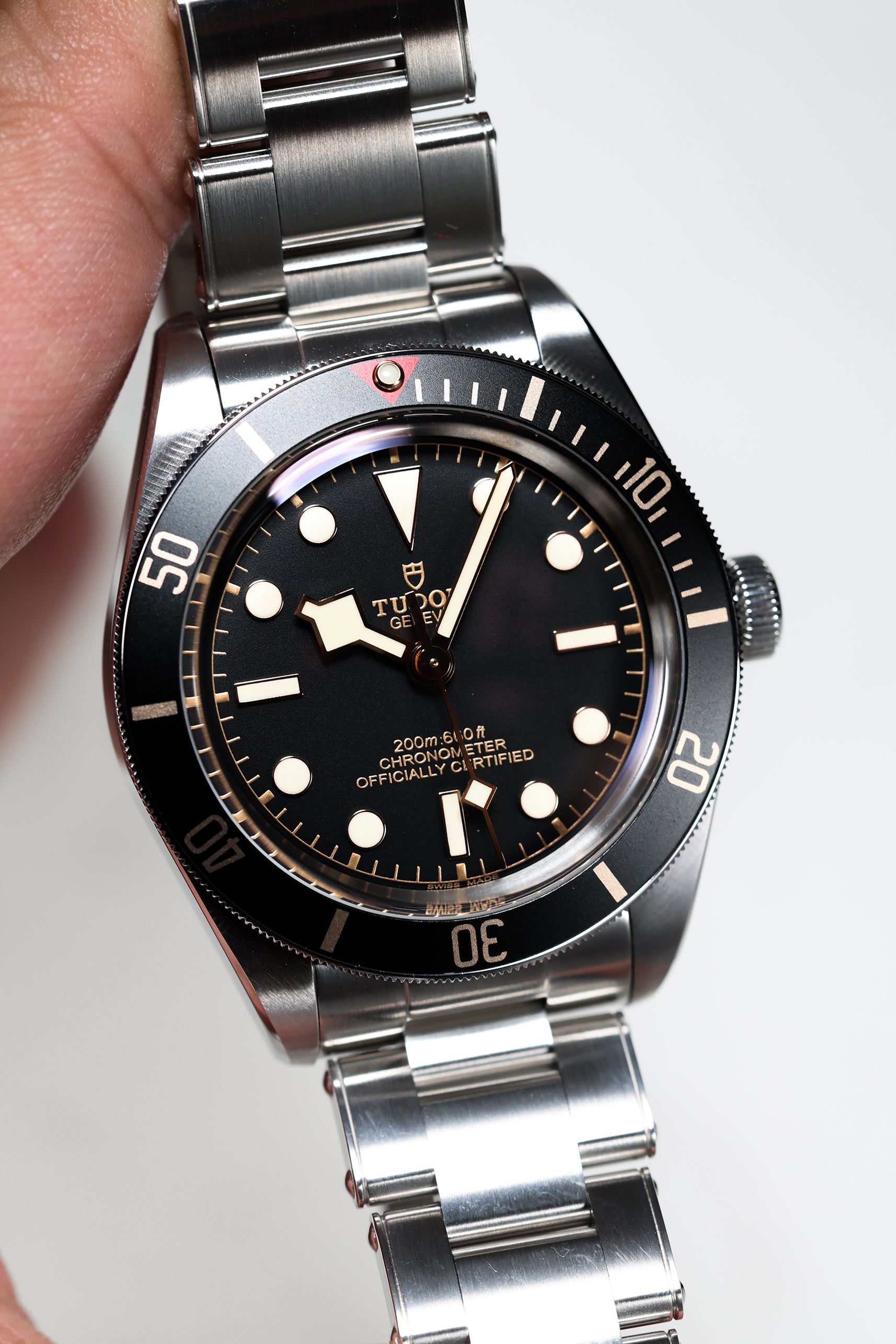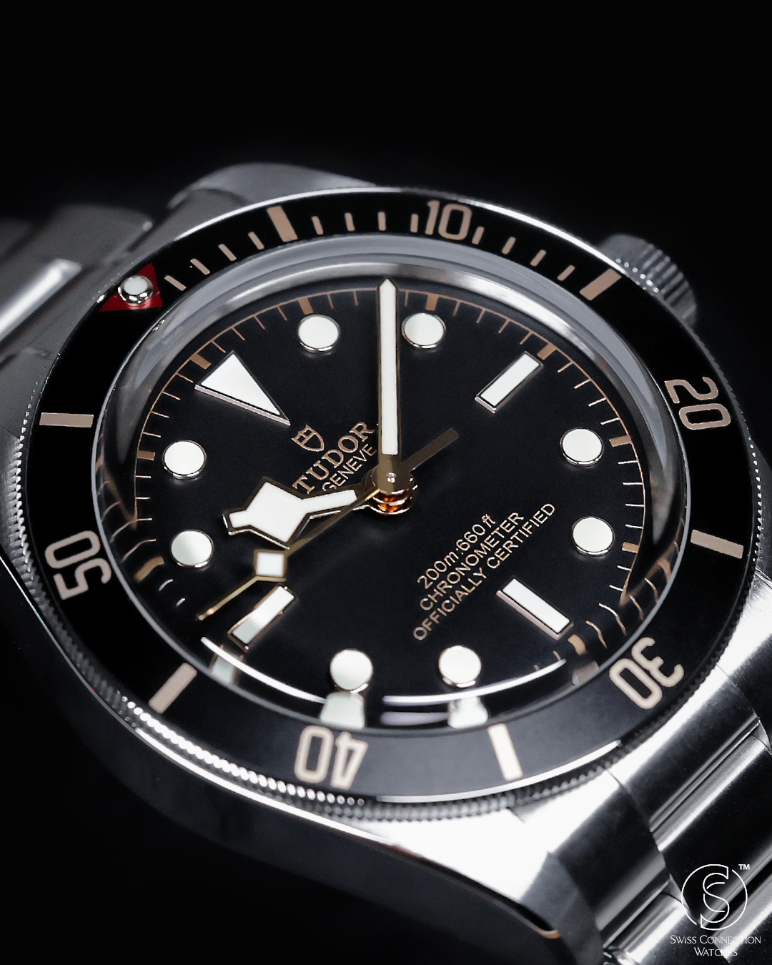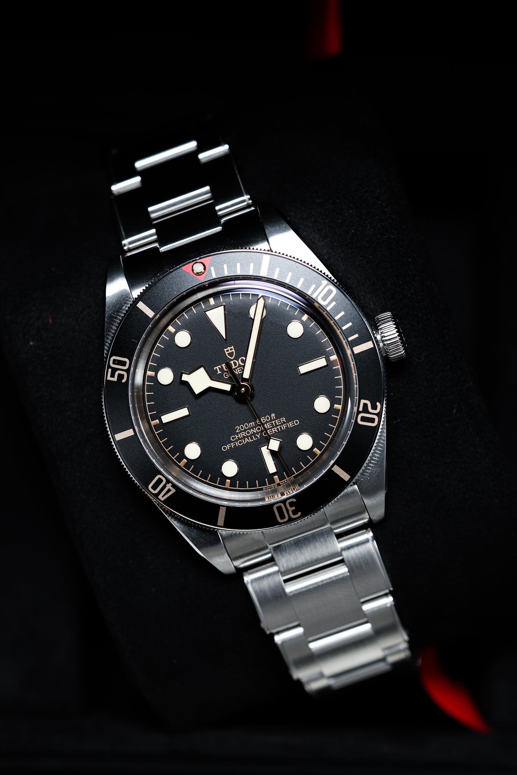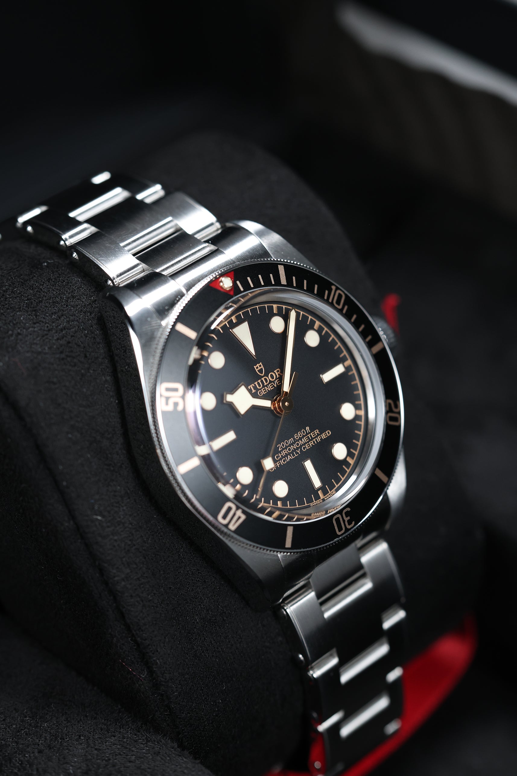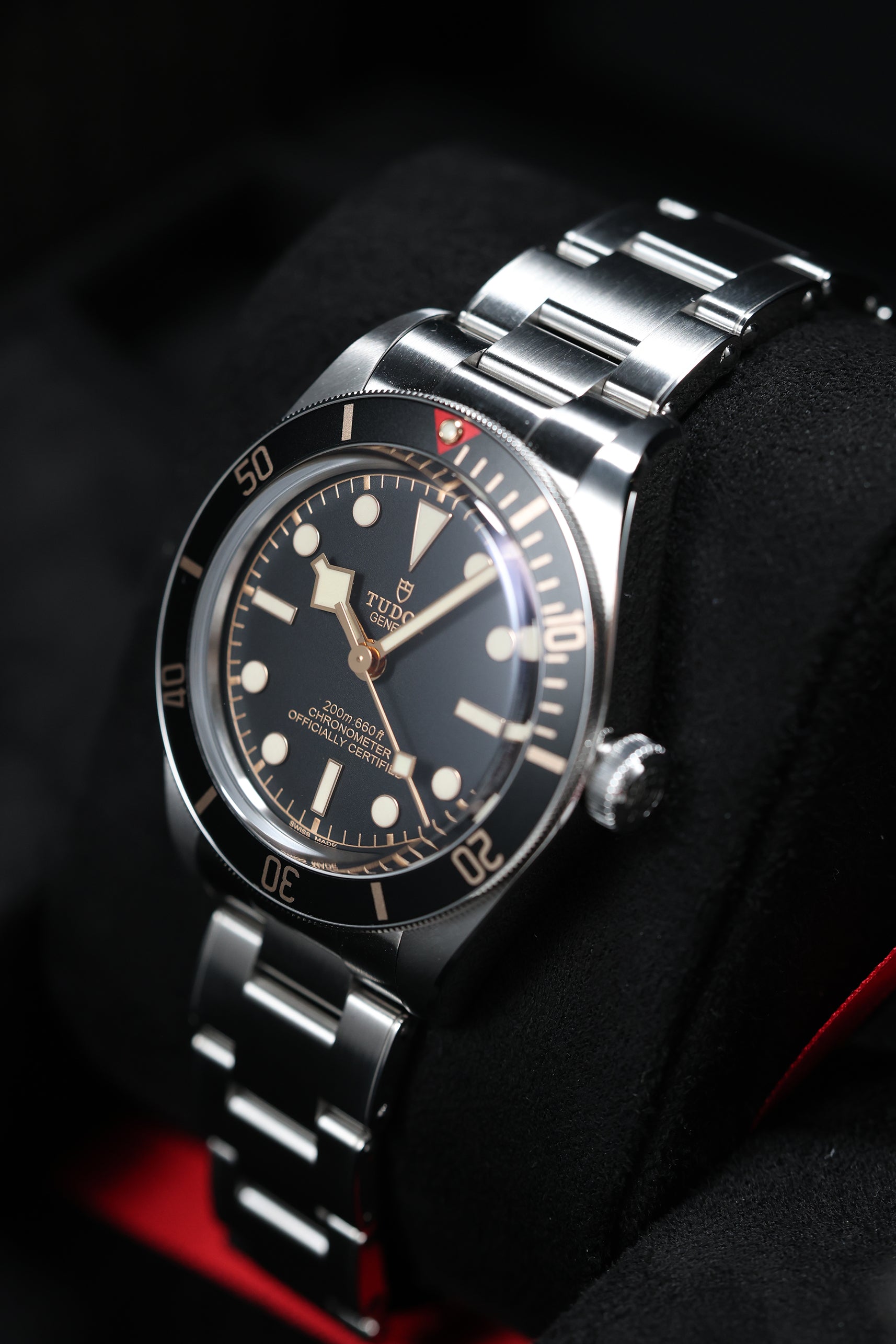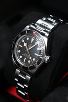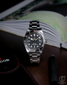 The matte black dial is clean and legible, featuring Tudor’s signature snowflake hands and large hour markers, both filled with luminous material for excellent visibility in low-light conditions. The gilt accents on the hands, markers, and bezel markings add a warm, vintage-inspired contrast to the monochrome dial, creating a striking visual appeal. The absence of a date window keeps the dial symmetrical and true to its dive watch roots, while the domed sapphire crystal adds a subtle retro touch. Every detail on the dial is thoughtfully designed to evoke the spirit of Tudor’s early dive watches while maintaining a modern edge.