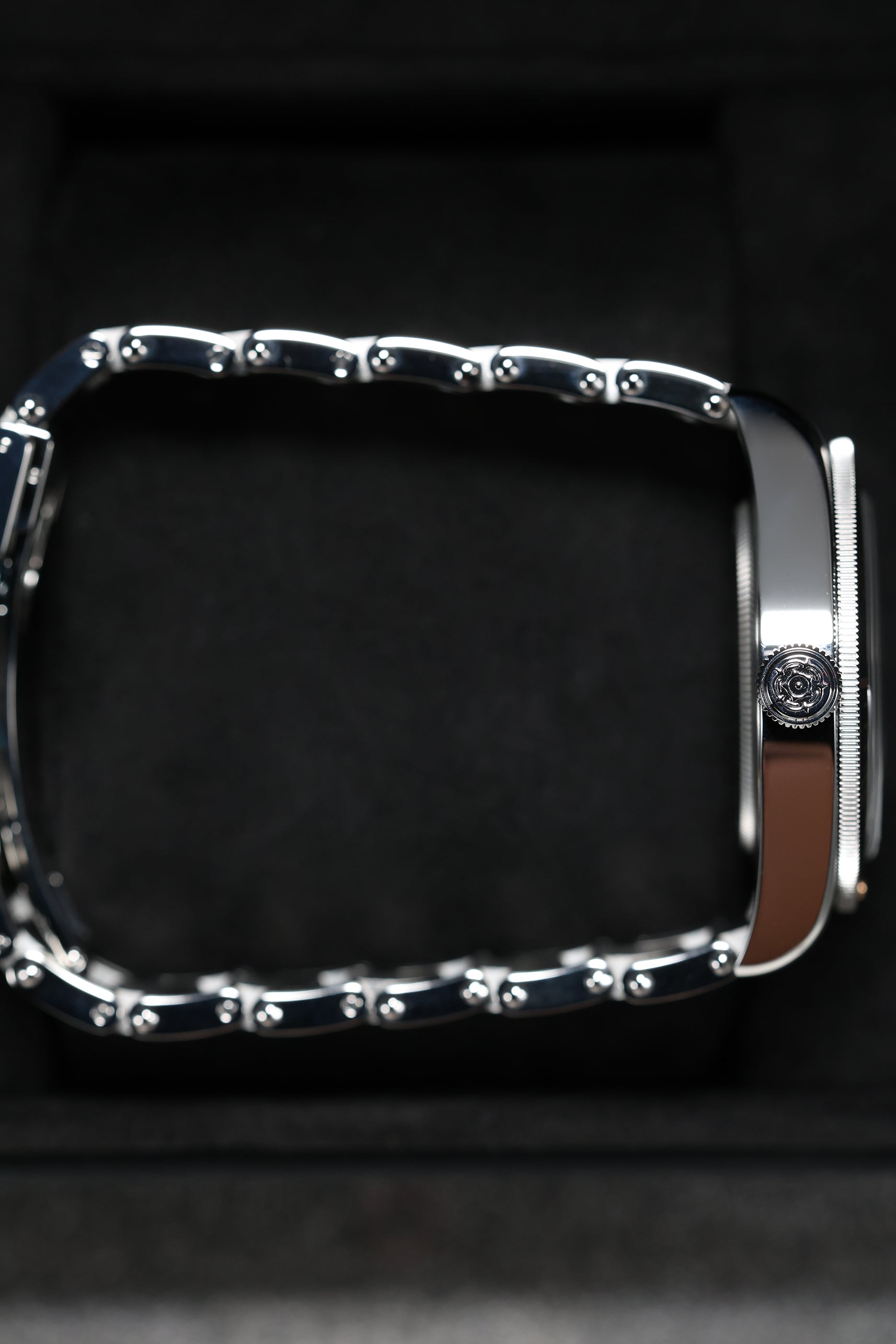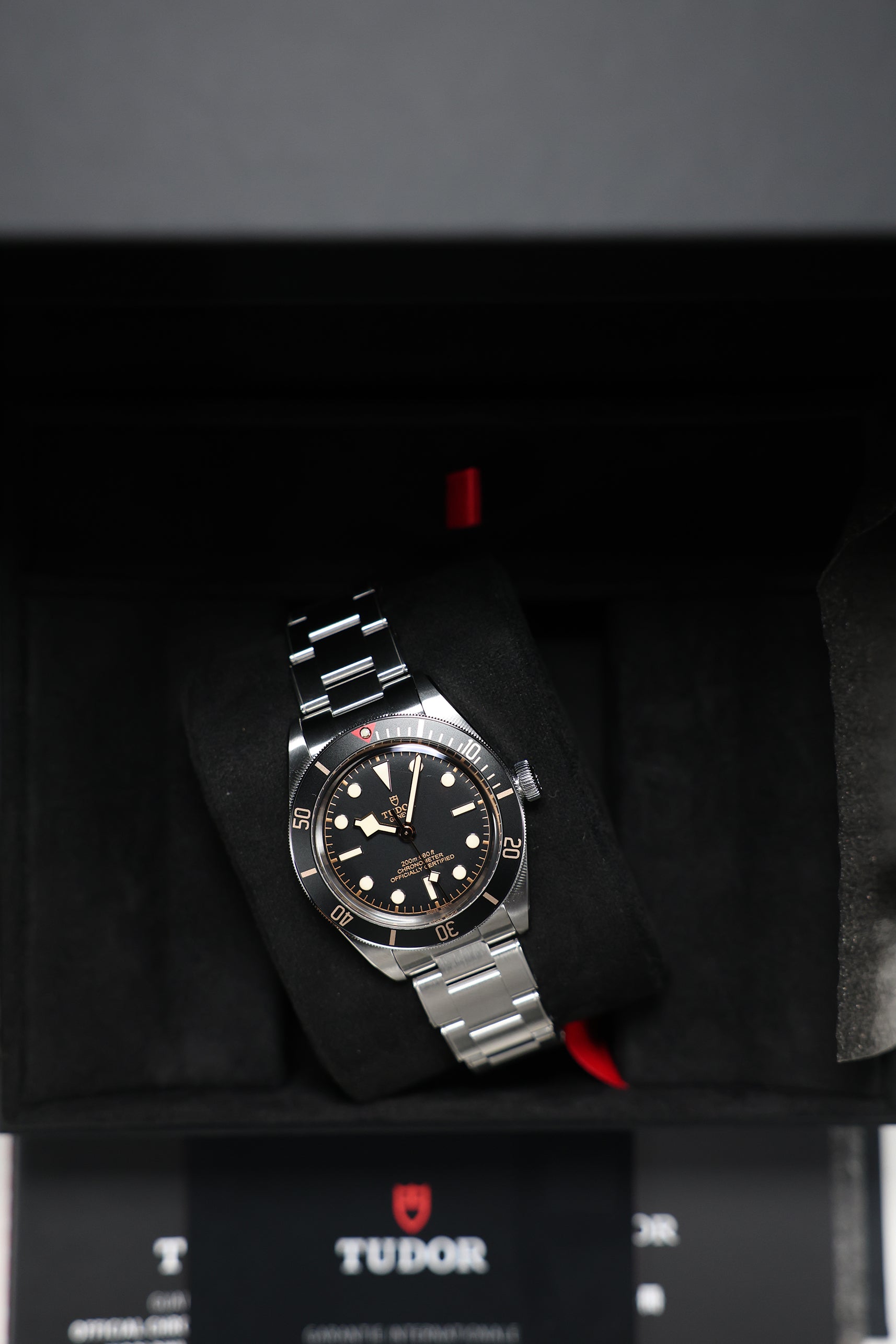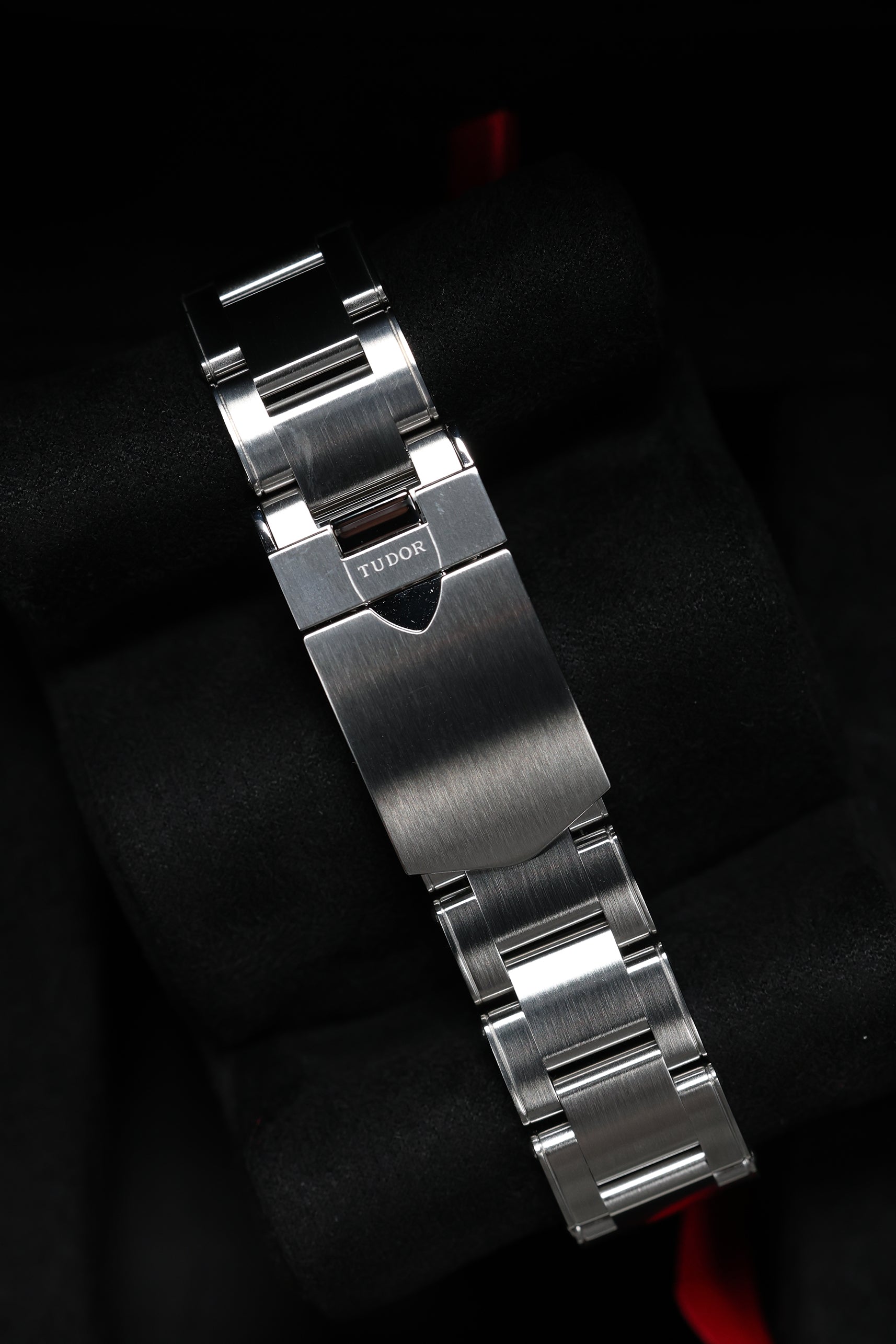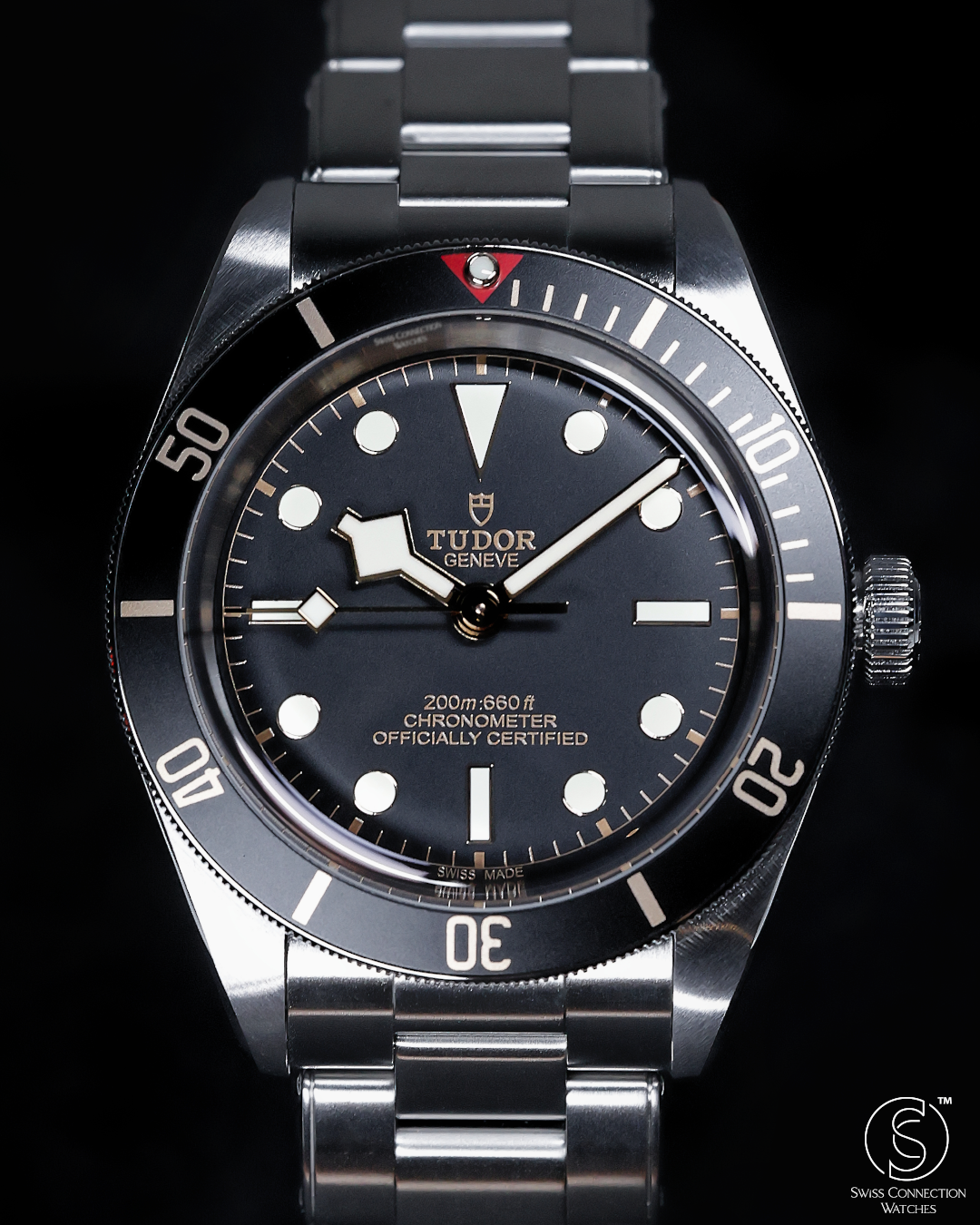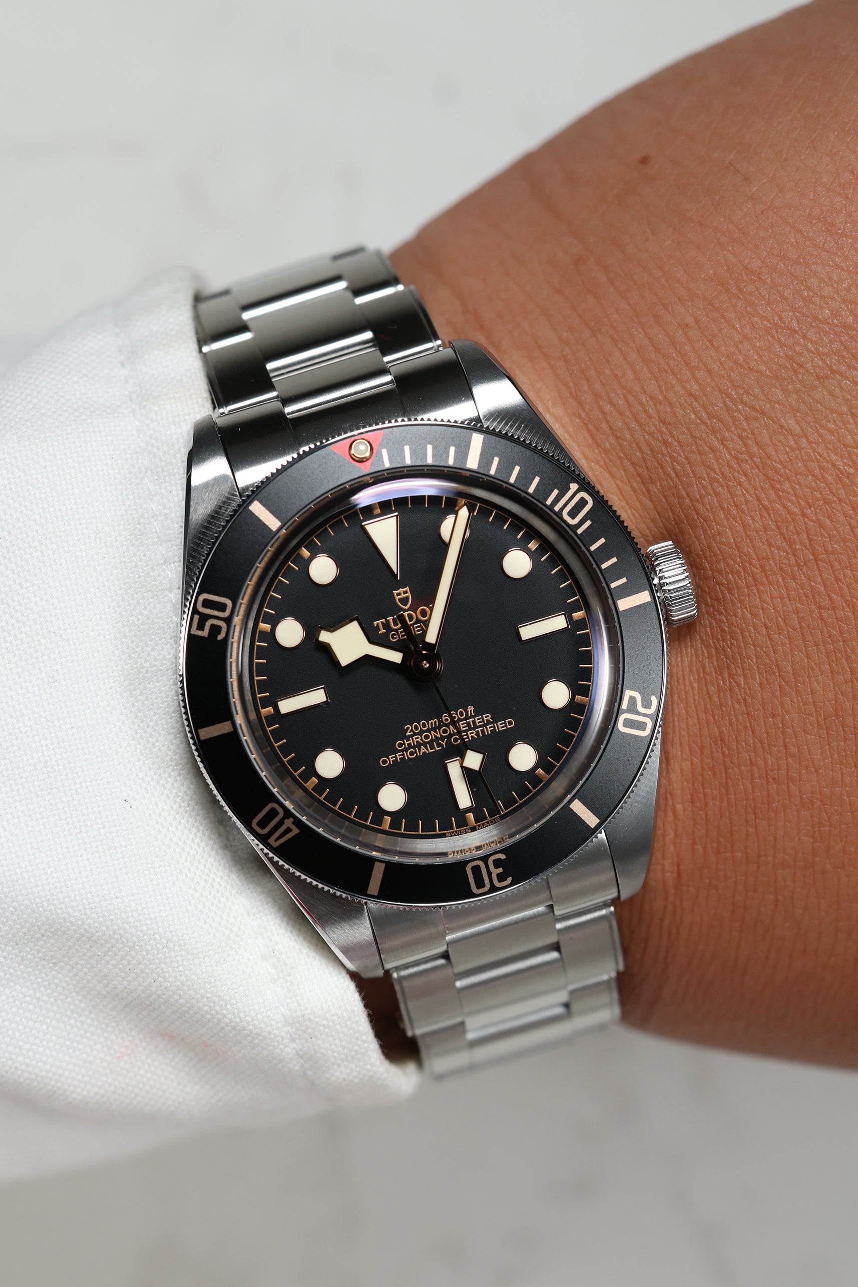 The matte black dial is clean and legible, featuring Tudor’s signature snowflake hands and large hour markers, both filled with luminous material for excellent visibility in low-light conditions. The gilt accents on the hands, markers, and bezel markings add a warm, vintage-inspired contrast to the monochrome dial, creating a striking visual appeal. The absence of a date window keeps the dial symmetrical and true to its dive watch roots, while the domed sapphire crystal adds a subtle retro touch. Every detail on the dial is thoughtfully designed to evoke the spirit of Tudor’s early dive watches while maintaining a modern edge.