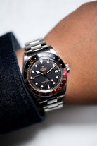 The dial features a clean black finish with Tudor’s signature snowflake hands, which are now accented in gold to match the bold GMT hand. The gold detailing adds a touch of warmth and luxury, beautifully complementing the tool-watch DNA of the Black Bay series. The red and black bezel inserts provide excellent contrast against the luminous markers and hands, ensuring optimal legibility in any lighting condition. This design creates a cohesive and versatile look, suitable for both casual and formal settings.