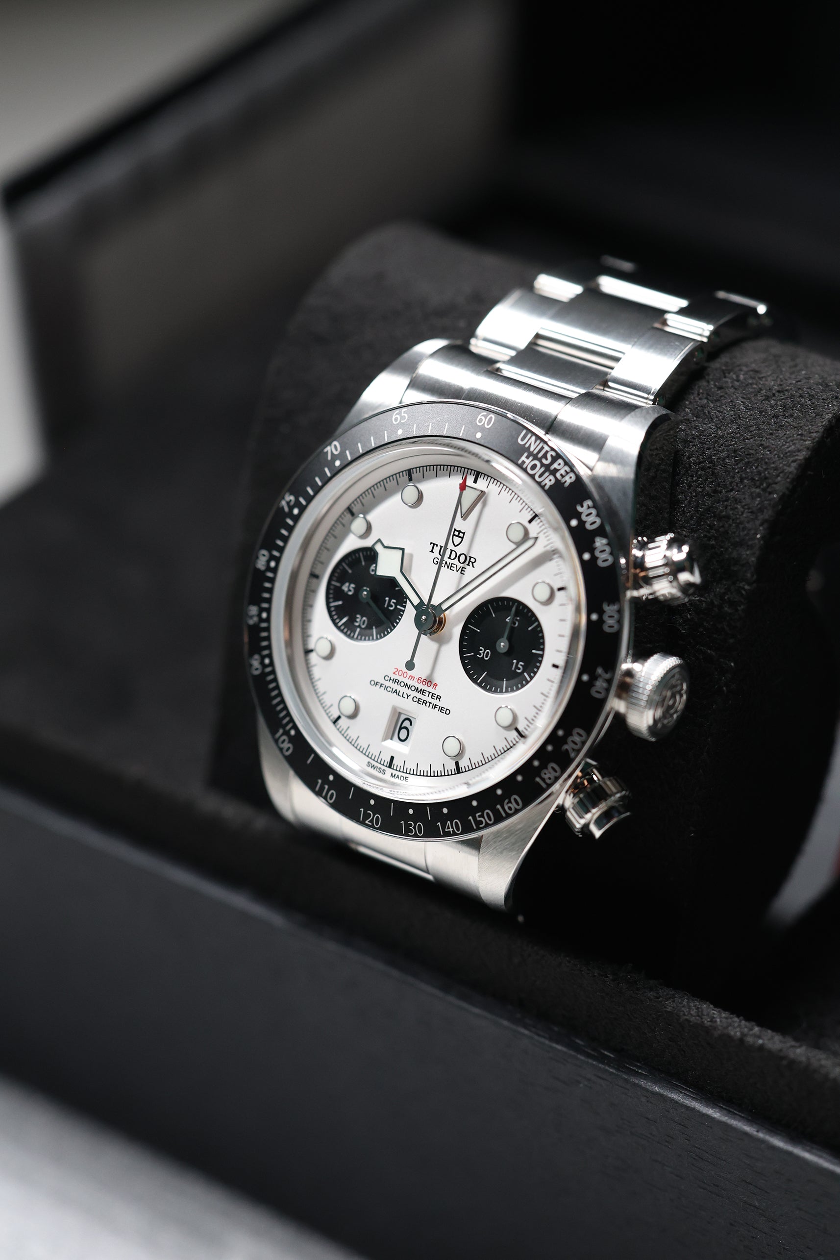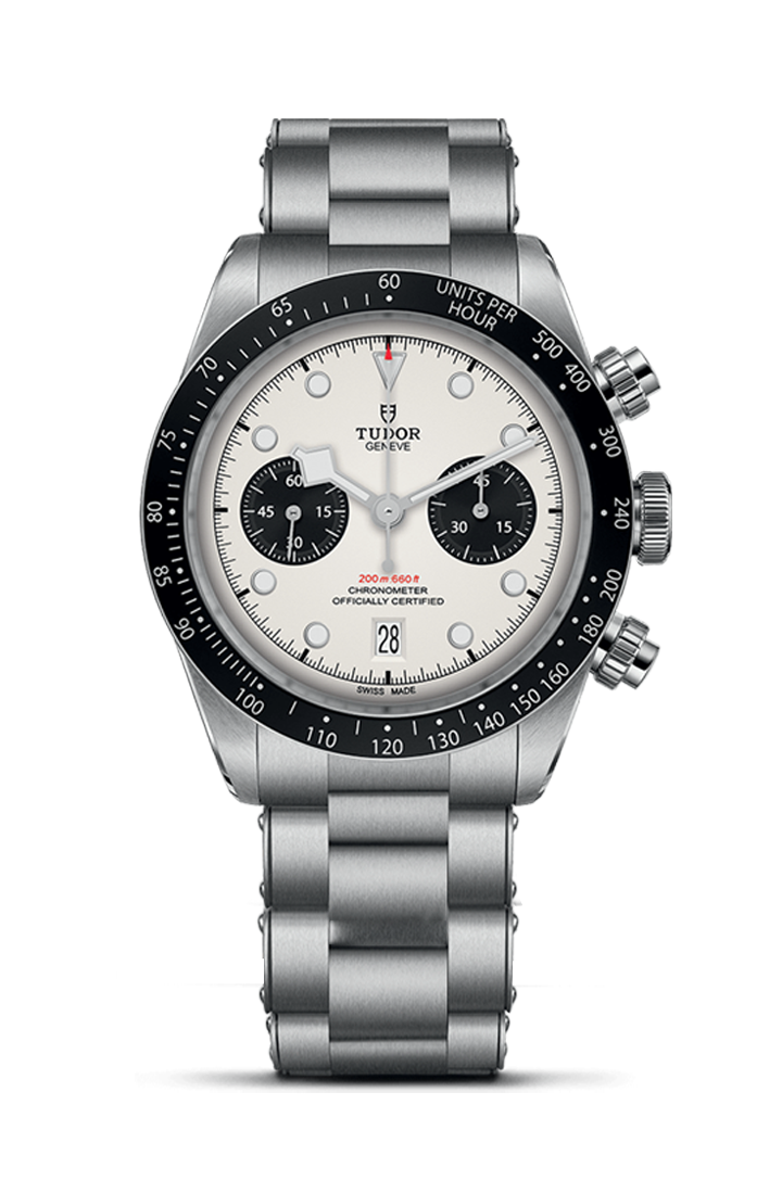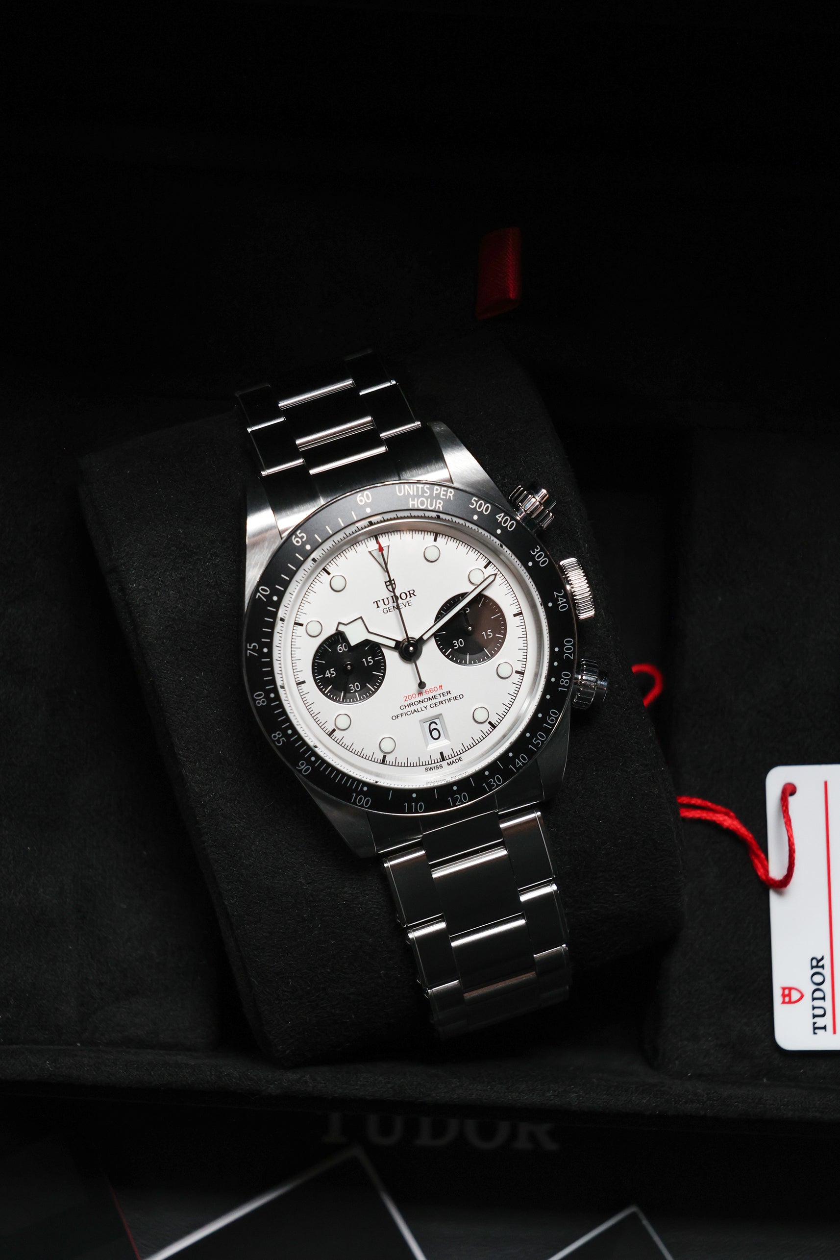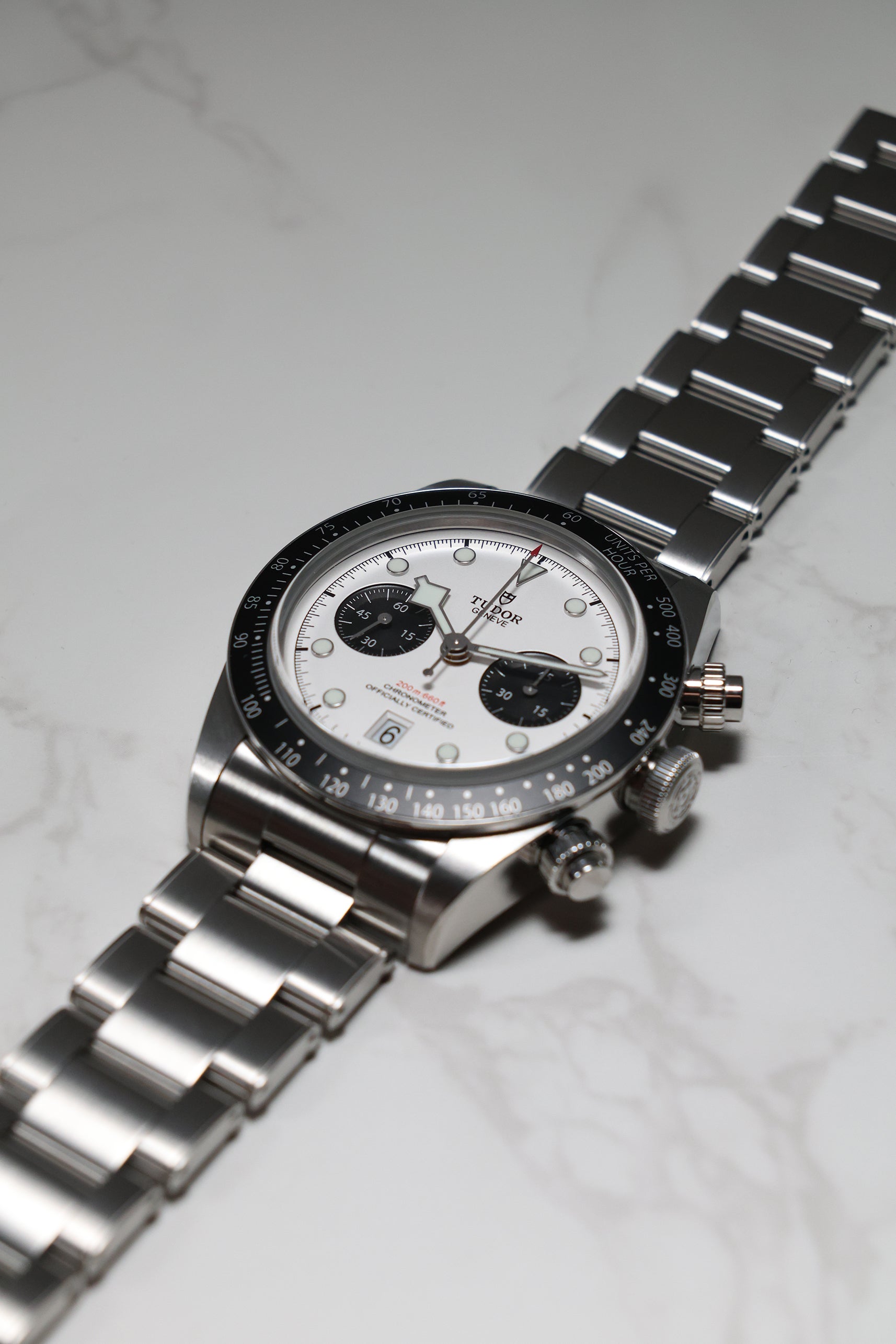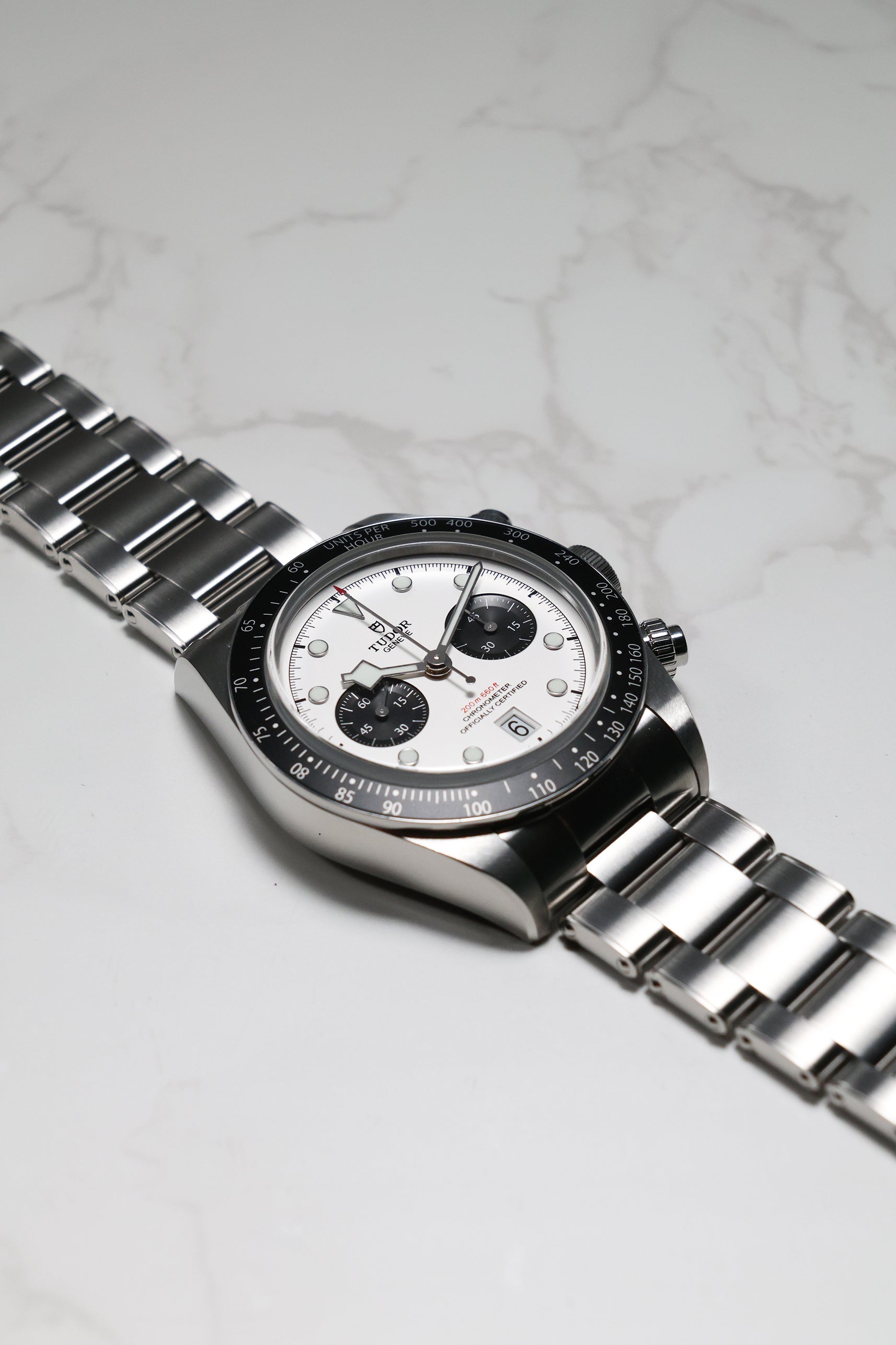 The Tudor Black Bay Chronograph 79360N masterfully blends vintage racing aesthetics with the robust functionality of a modern dive watch. This timepiece, a staple in Tudor's collection, is instantly recognizable by its bold 41mm stainless steel case and the striking "panda" dial variant, featuring an opaline (off-white) main dial sharply contrasted by black sub-dials. This design draws clear inspiration from classic chronographs while retaining the unmistakable Black Bay DNA, including the iconic "snowflake" hands and a subtly domed sapphire crystal. It's a rugged yet sophisticated aesthetic, making it an incredibly versatile chronograph.