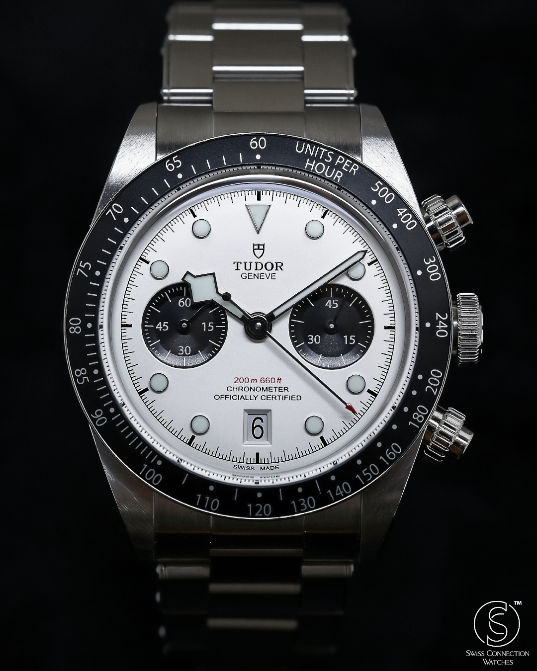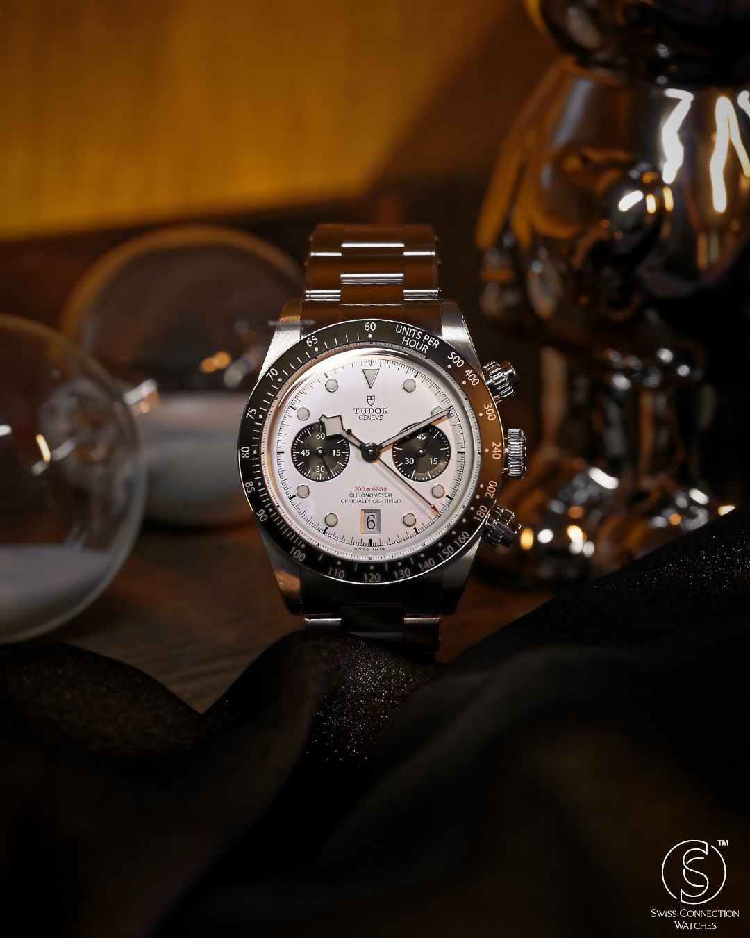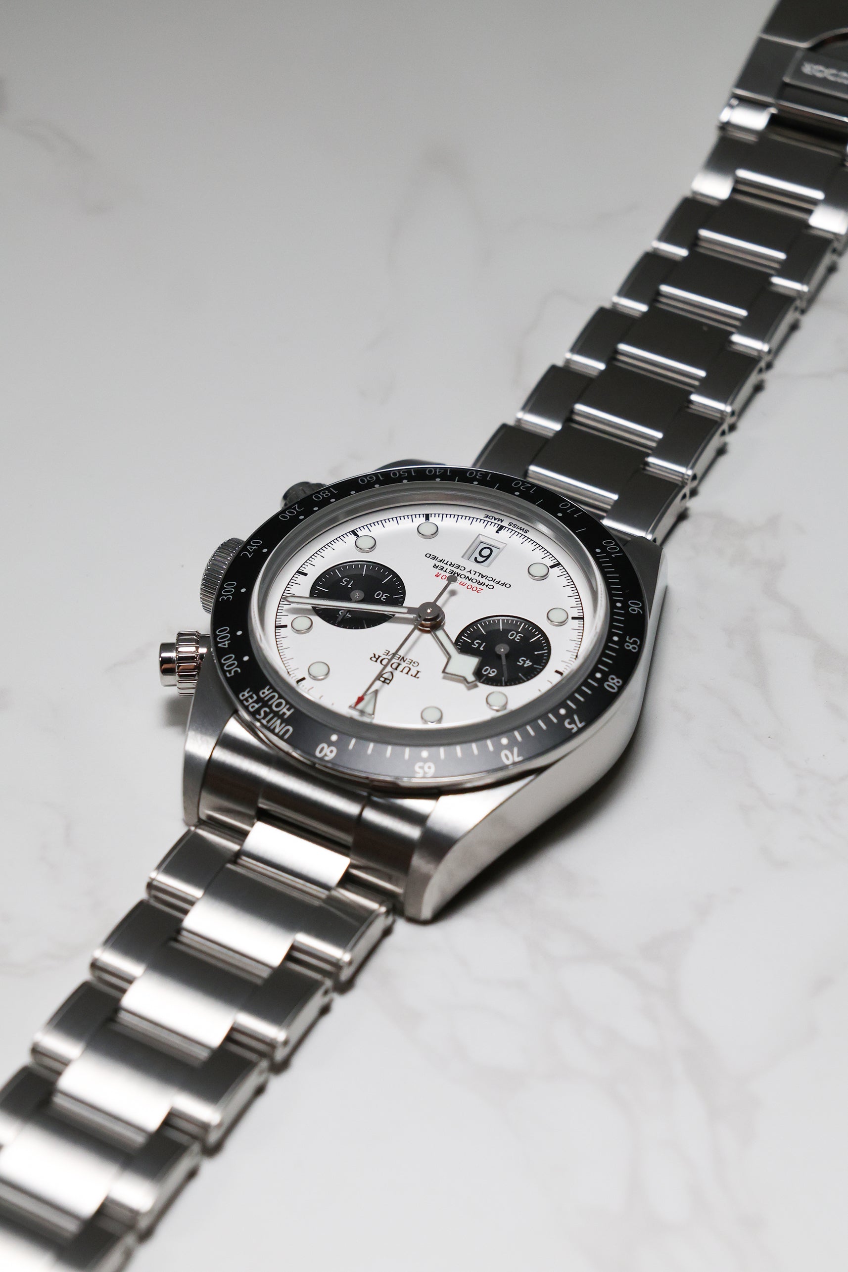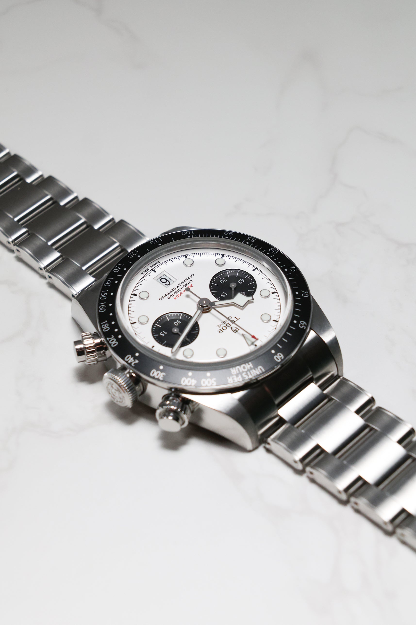 The Tudor Black Bay Chronograph 79360N masterfully blends vintage racing aesthetics with the robust functionality of a modern dive watch. This timepiece, a staple in Tudor's collection, is instantly recognizable by its bold 41mm stainless steel case and the striking "panda" dial variant, featuring an opaline (off-white) main dial sharply contrasted by black sub-dials. This design draws clear inspiration from classic chronographs while retaining the unmistakable Black Bay DNA, including the iconic "snowflake" hands and a subtly domed sapphire crystal. It's a rugged yet sophisticated aesthetic, making it an incredibly versatile chronograph.