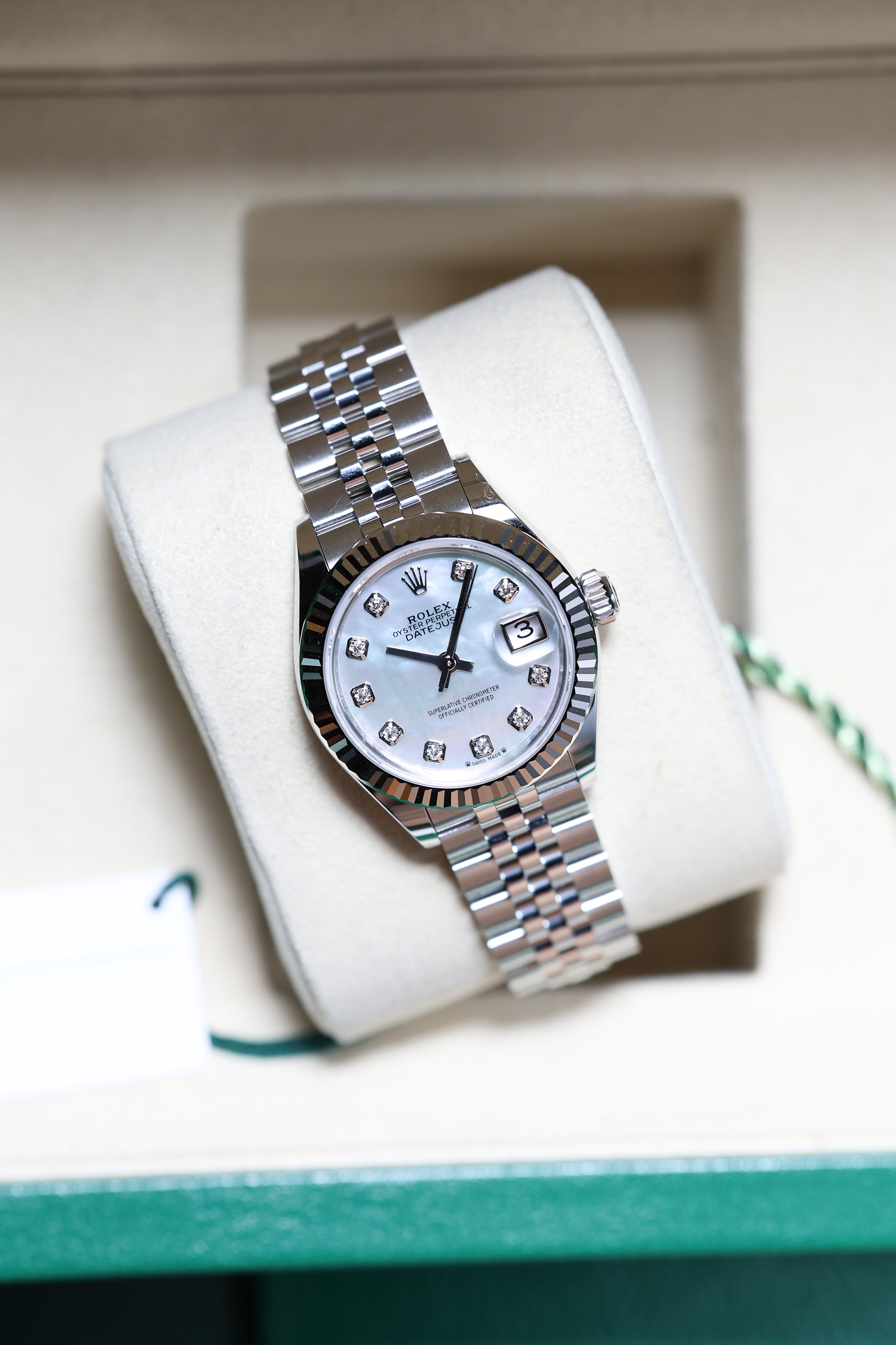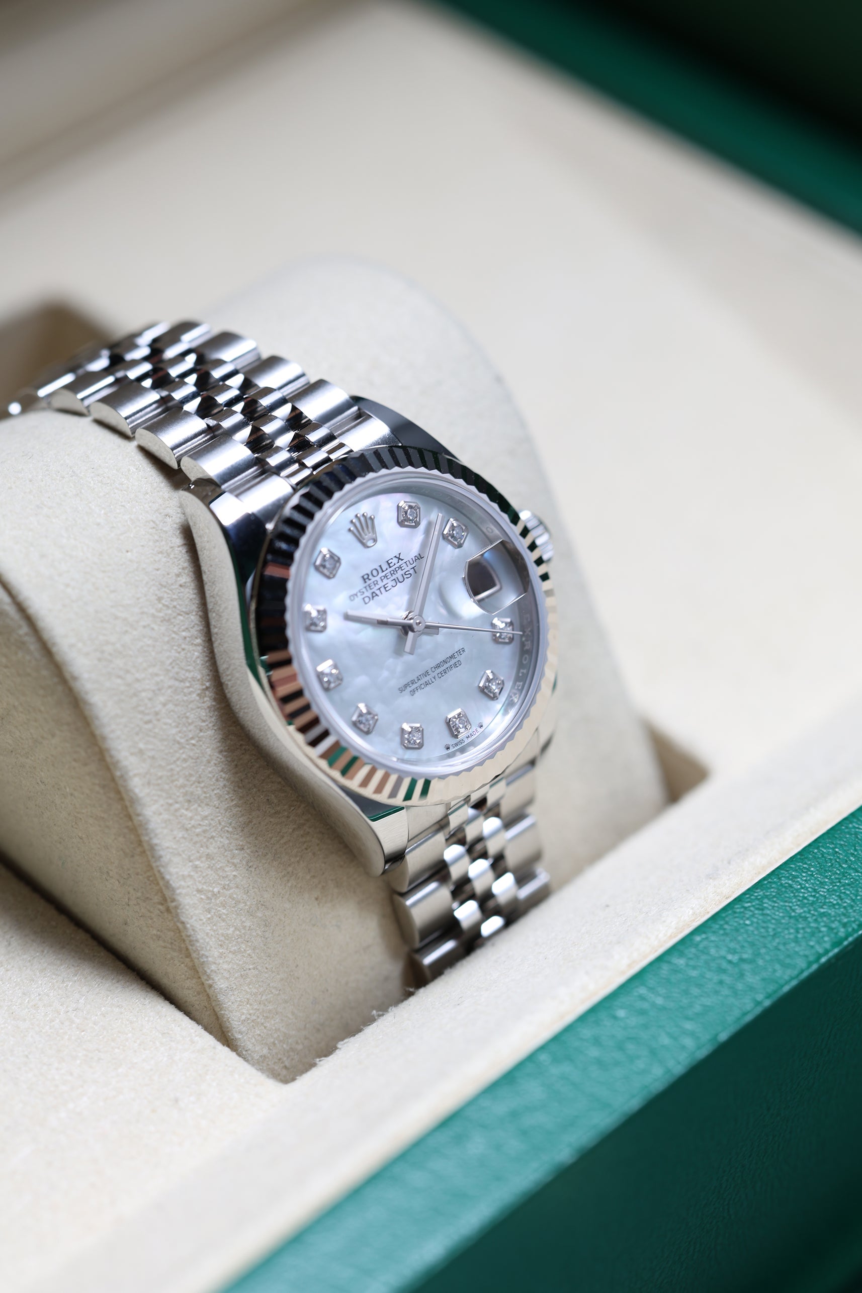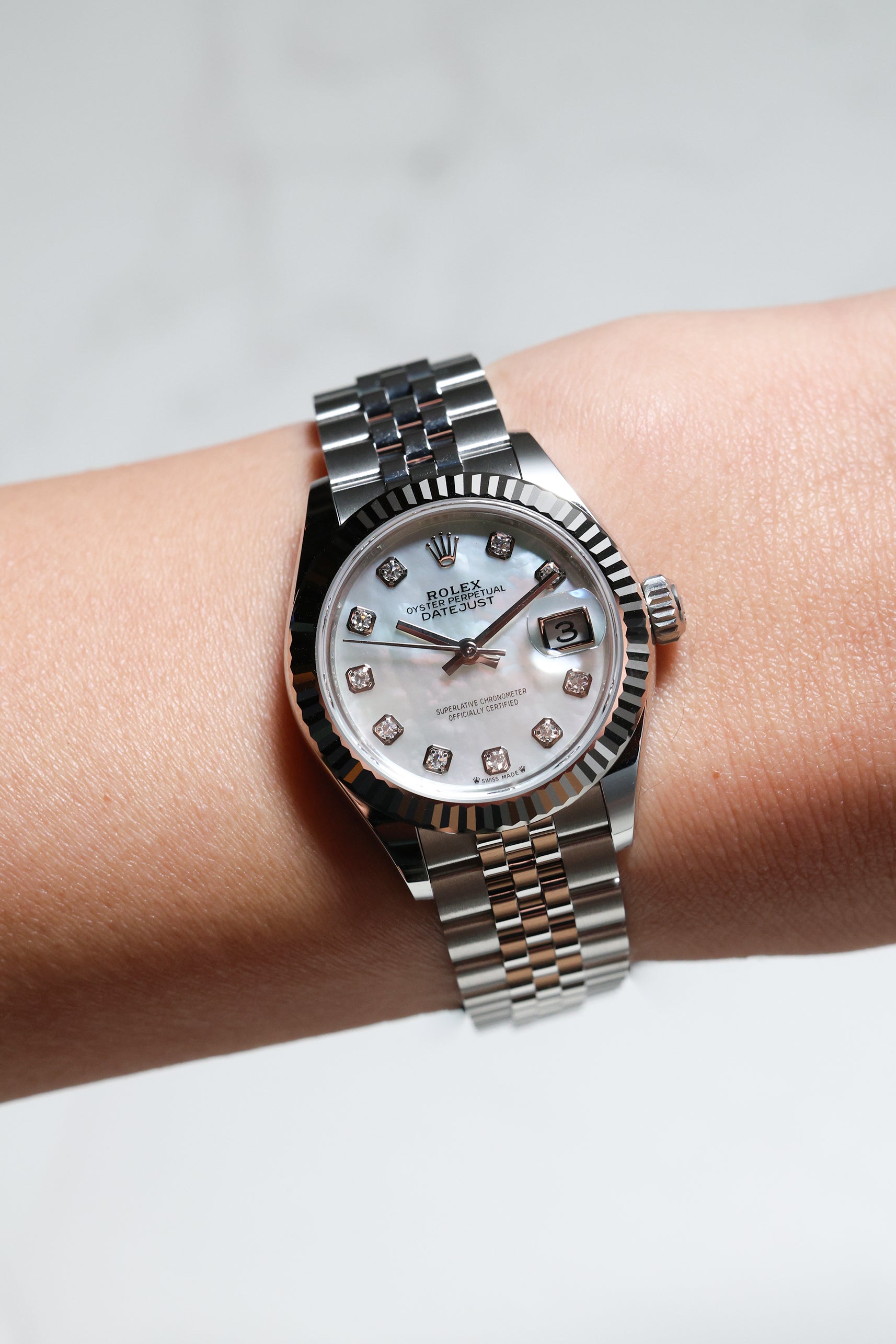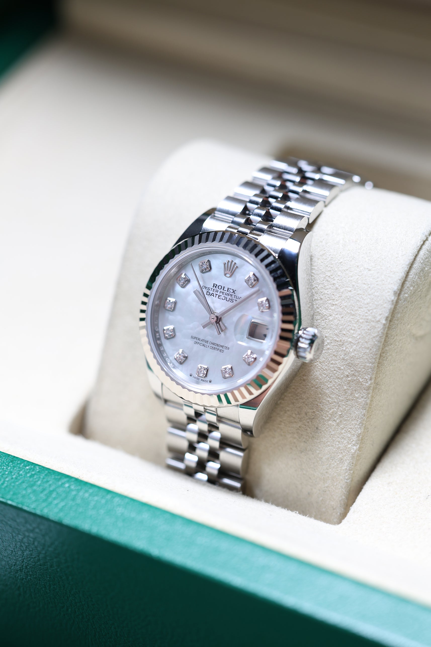 Powering this exquisite timepiece is Rolex's latest in-house automatic movement, ensuring superior precision, durability, and reliability. This movement is certified as a Superlative Chronometer, guaranteeing outstanding performance with an enhanced 55-hour power reserve. With a robust 100-meter water resistance, the Datejust 28 in White Mother of Pearl with 10 Diamonds is more than just a beautiful accessory; it's a dependable and practical timepiece, perfectly balancing cherished tradition with a vibrant, modern spirit and captivating sparkle.