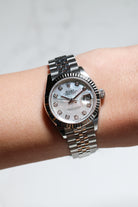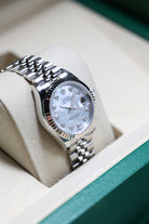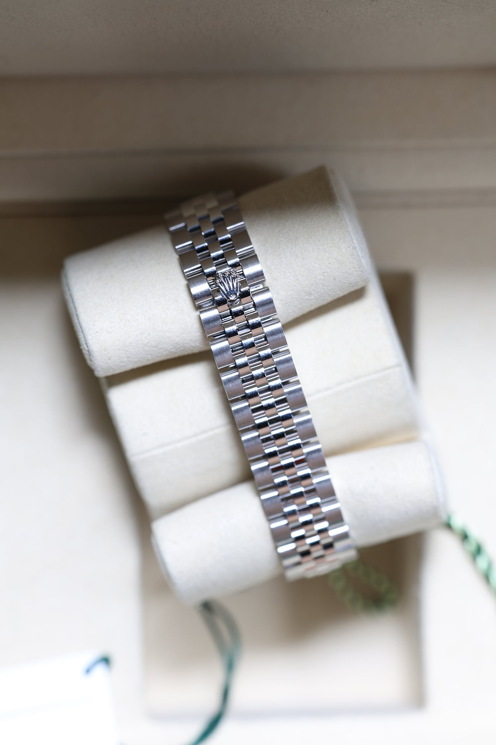 Perfectly sized for a delicate yet distinct presence on the wrist, the 28mm Oystersteel case pairs seamlessly with the classic Jubilee bracelet. This iconic bracelet, with its intricate five-piece links, offers exceptional comfort and a refined drape, ensuring the watch feels as luxurious as it looks. Its versatile design means it transitions effortlessly from formal events to elegant everyday wear, always exuding an air of understated glamour.